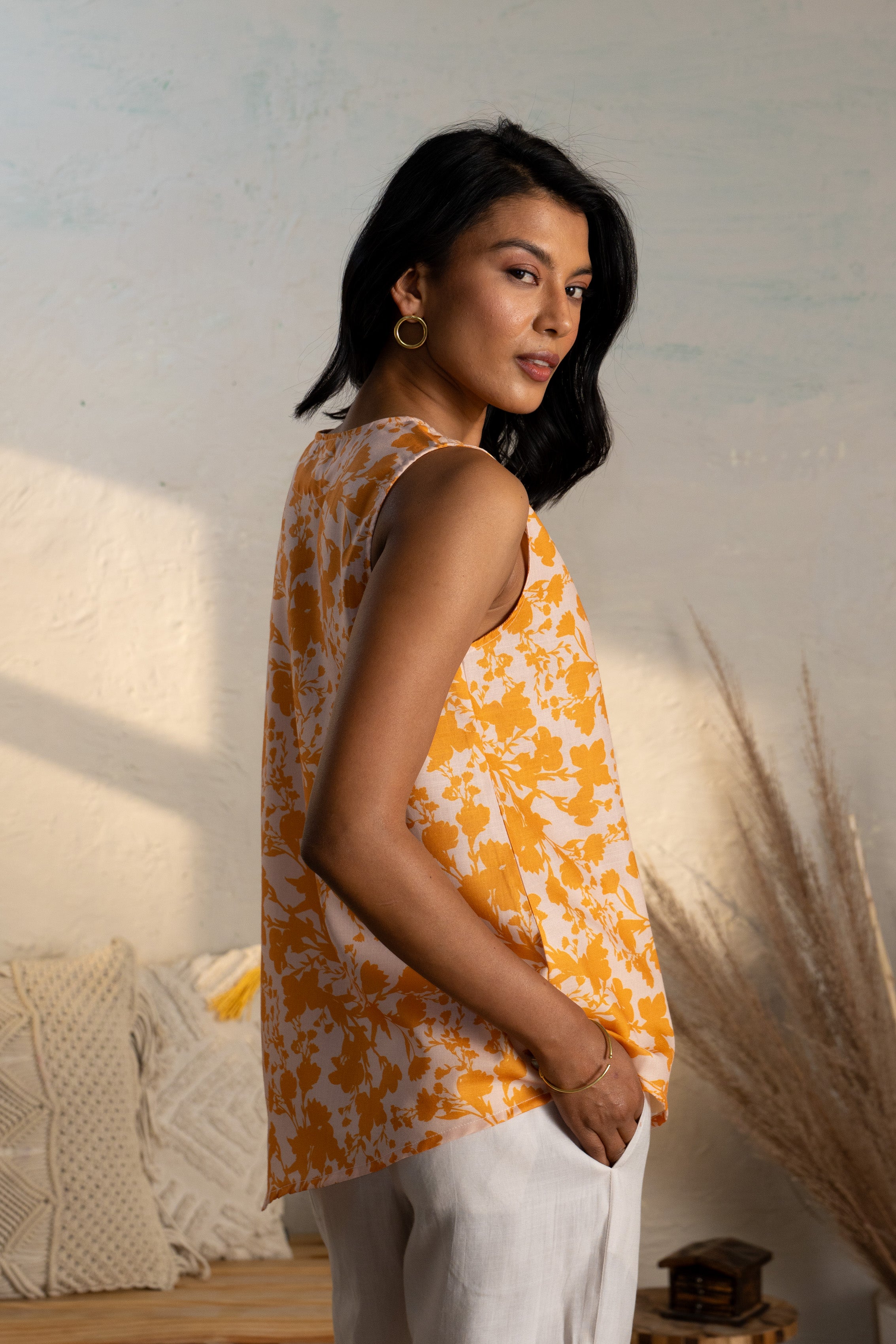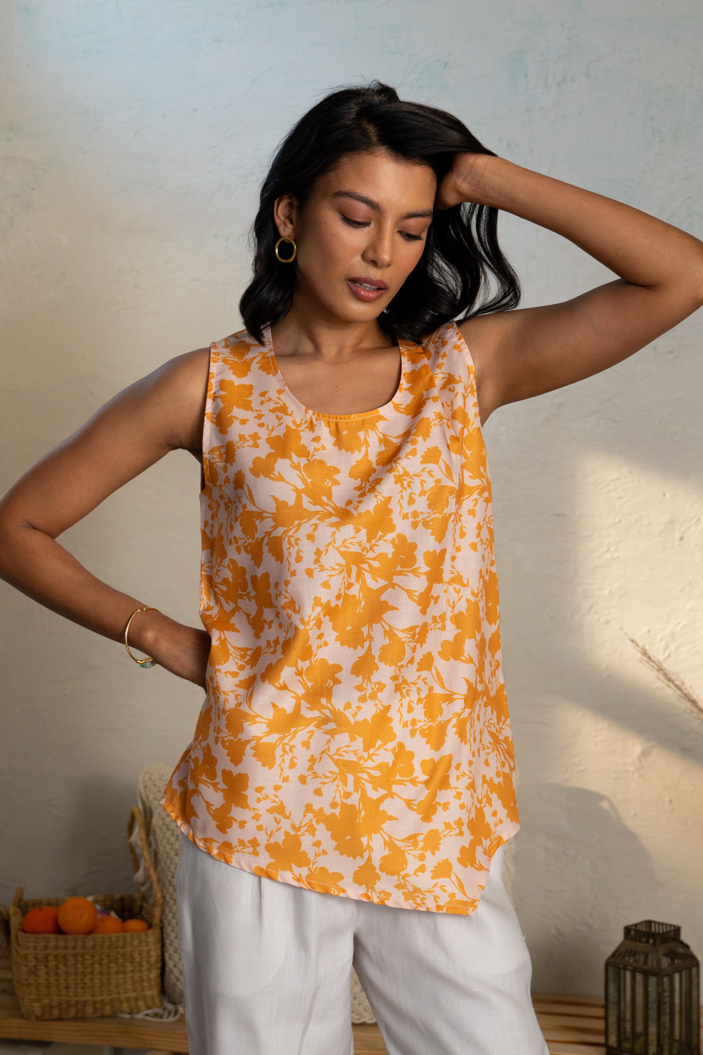 The Prairie Whisper Top is a harmonious blend of modern design and natural elegance. This asymmetrical piece reinvents the classic tank with a unique diagonal pleat detail and a chic asymmetrical hemline, offering a contemporary twist. Perfect for pairing with high-waisted bottoms, this top is ideal for those seeking style and sophistication in everyday wear.