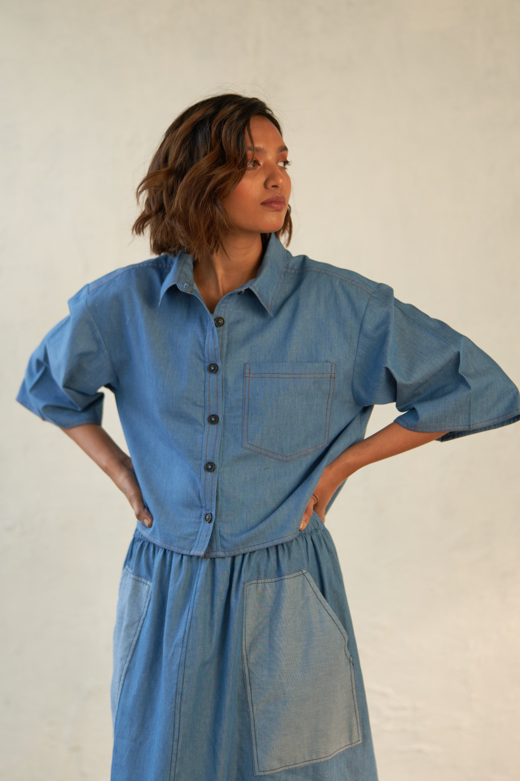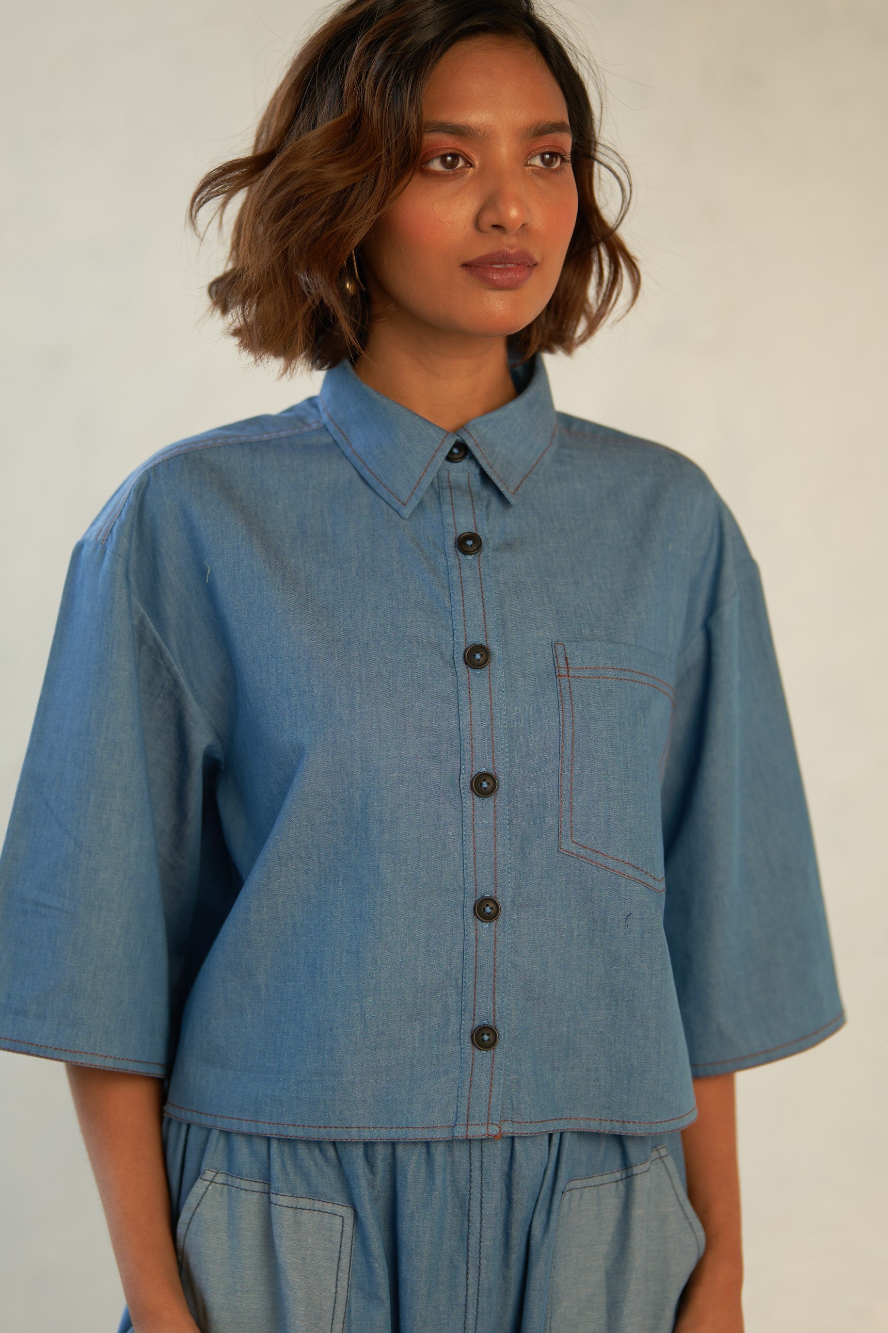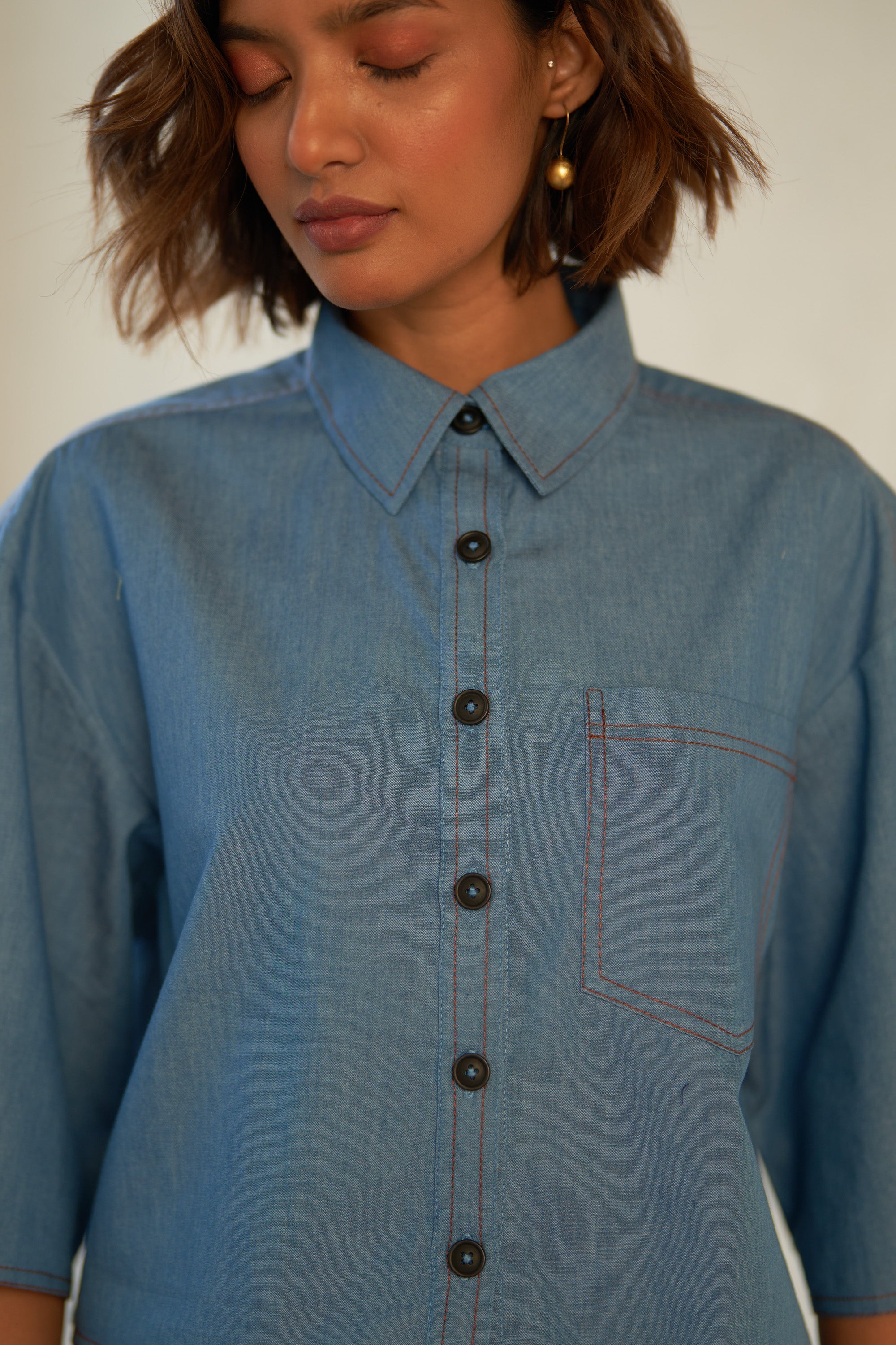 Crafted in soft denim fabric, our shirt is cut in a boxy profile, then furnished with patch pockets and bold black buttons, adding to the overall riders vibe of the shirt.