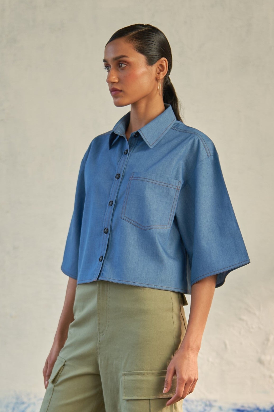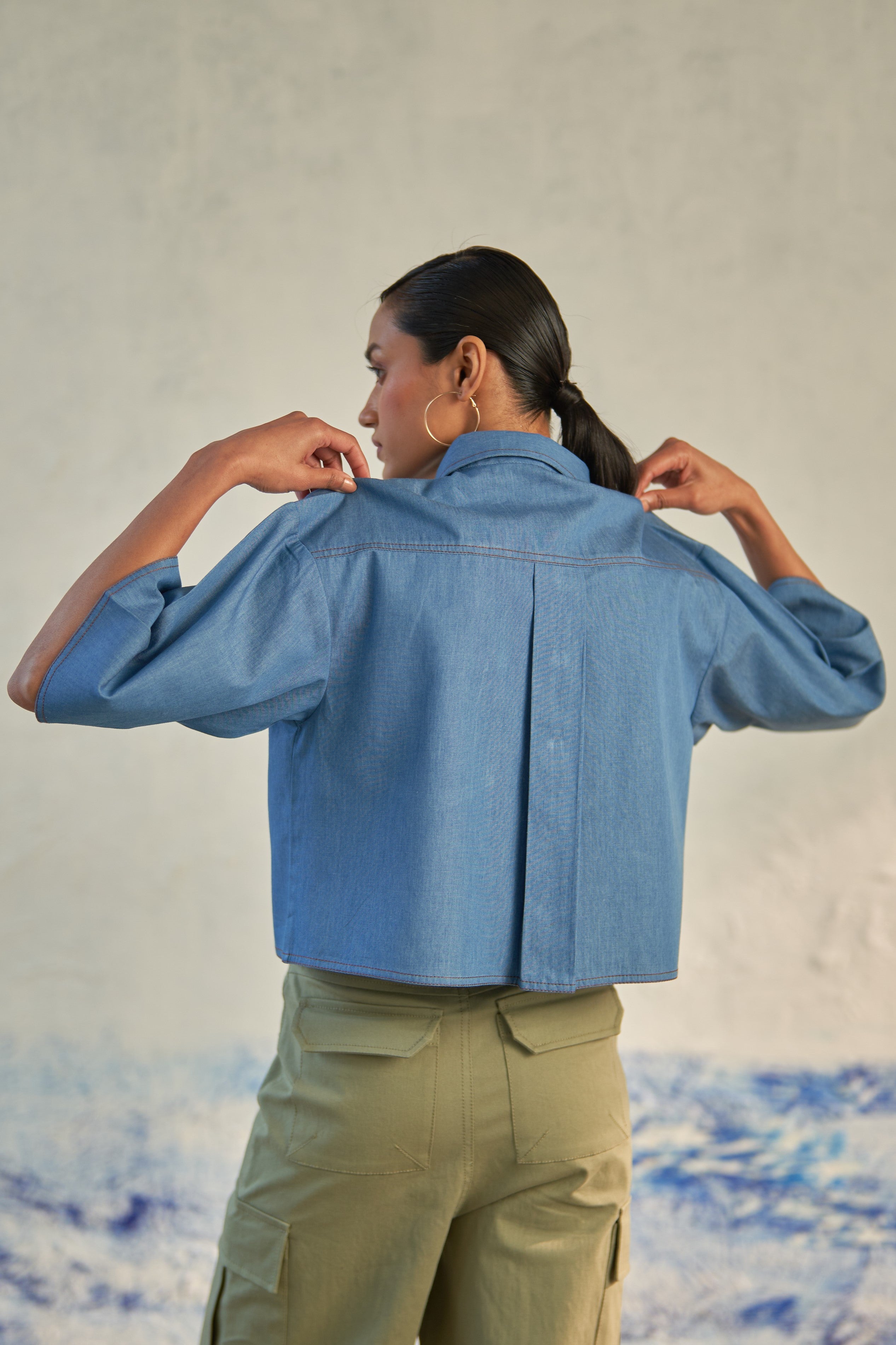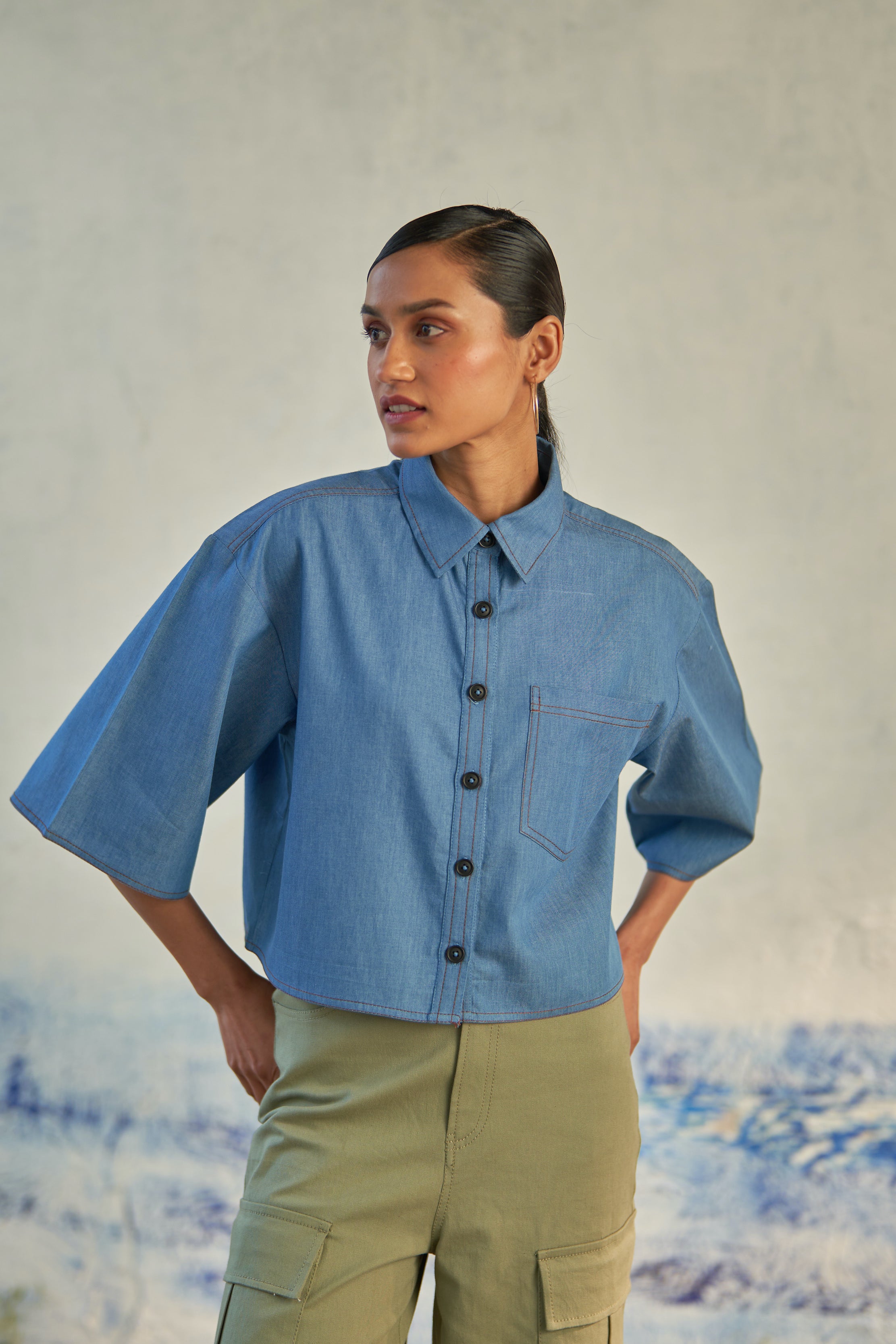 Crafted in soft denim fabric, our shirt is cut in a boxy profile, then furnished with patch pockets and bold black buttons, adding to the overall riders vibe of the shirt.