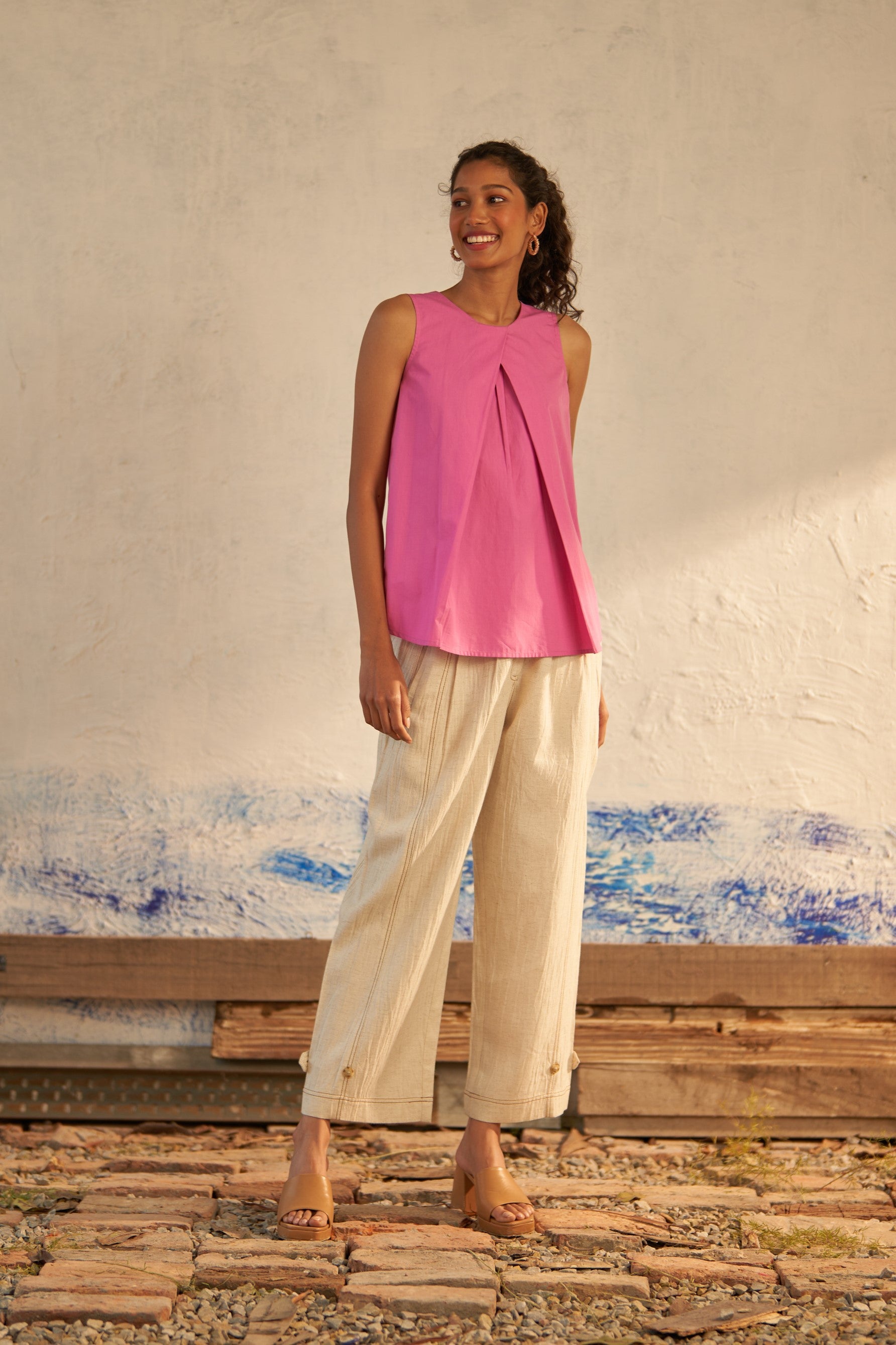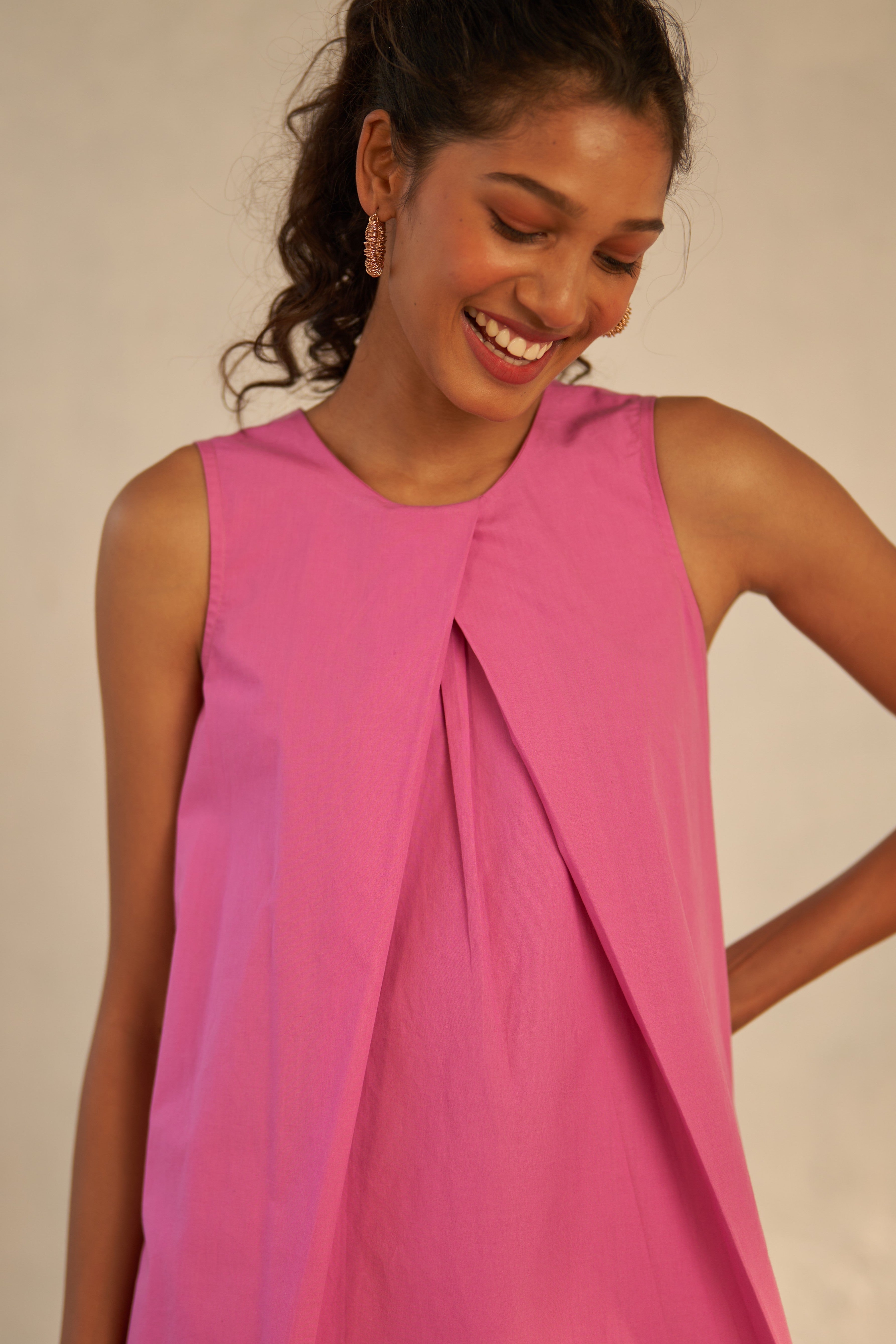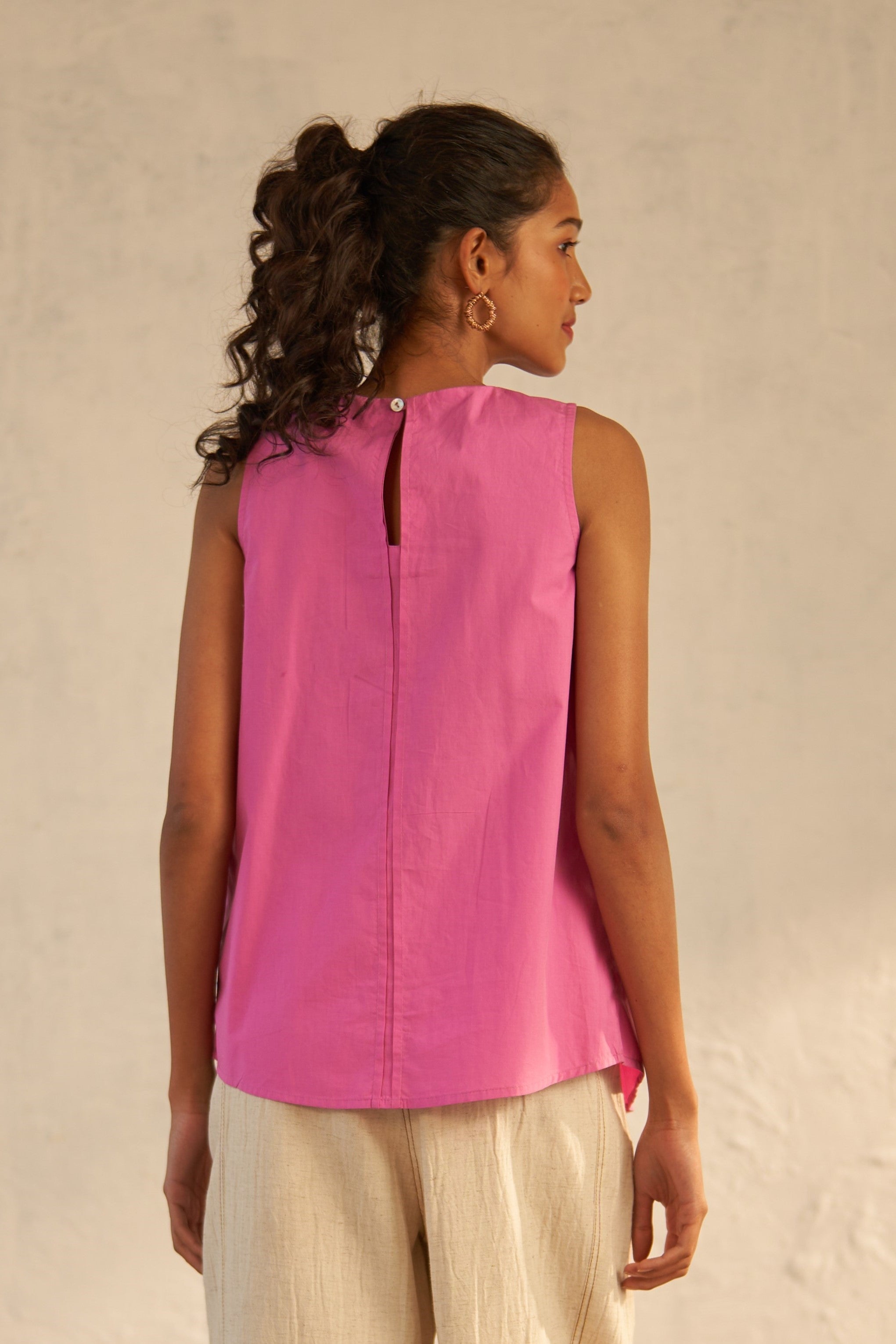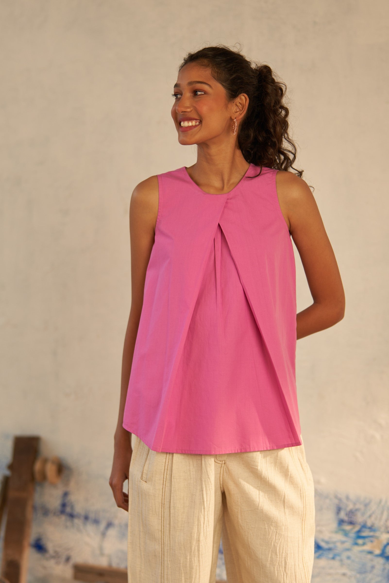 This rouge pink sleeveless top is a versatile choice that effortlessly transitions from day to night. Crafted from premium cotton poplin fabric, it features a twisted neckline that creates a graceful draped effect.