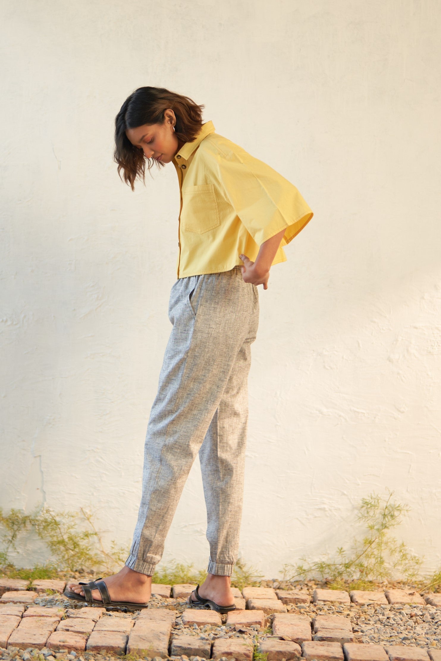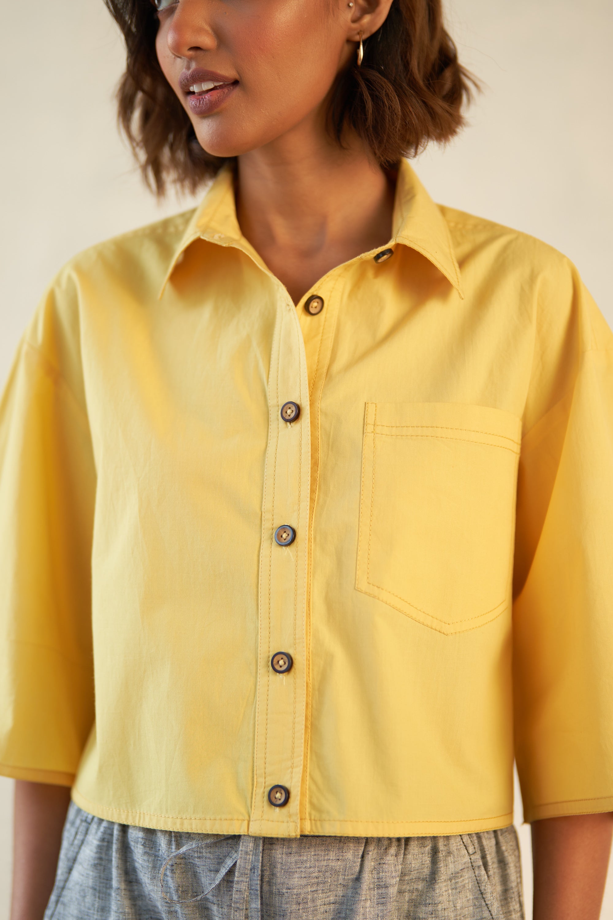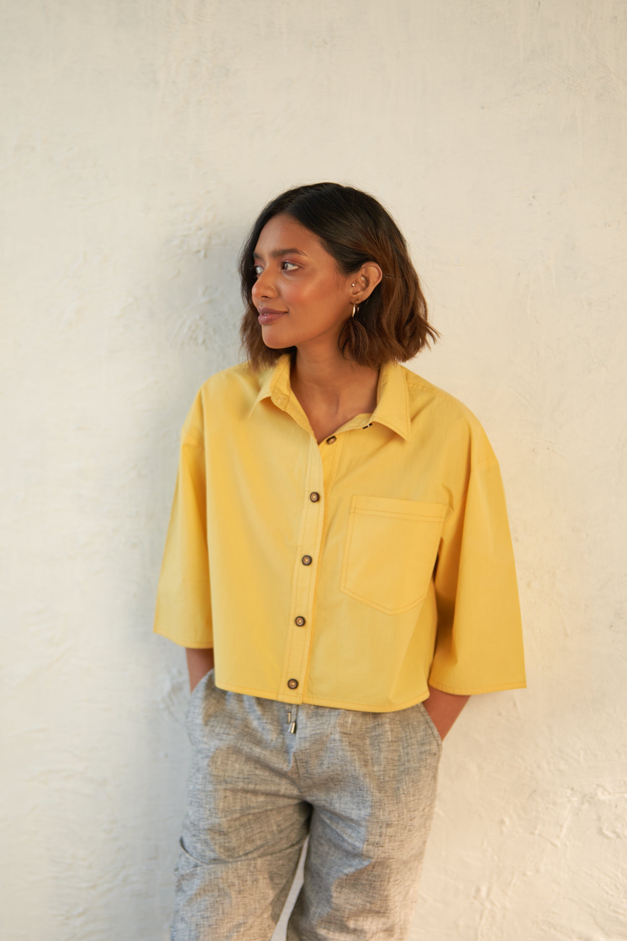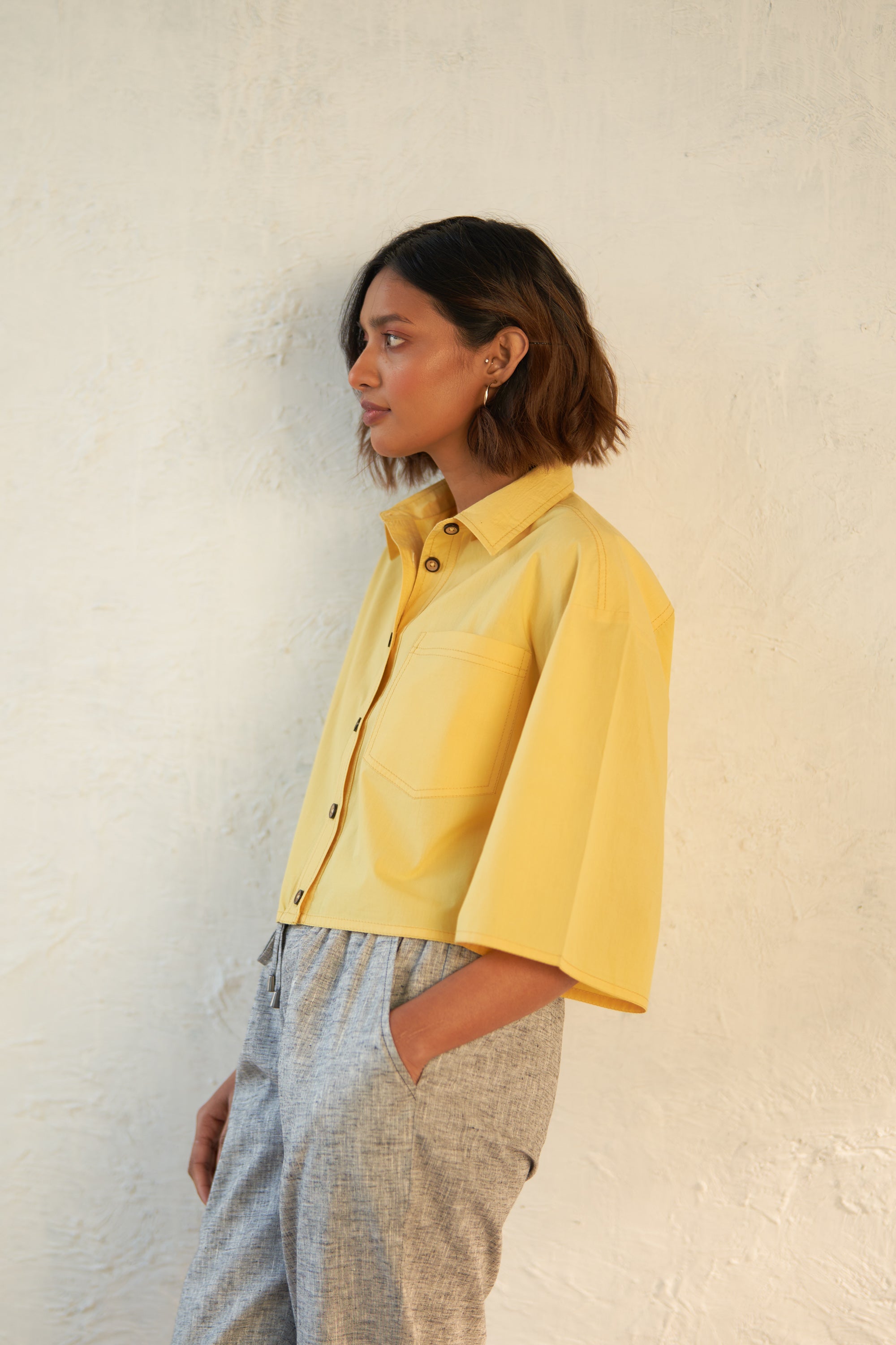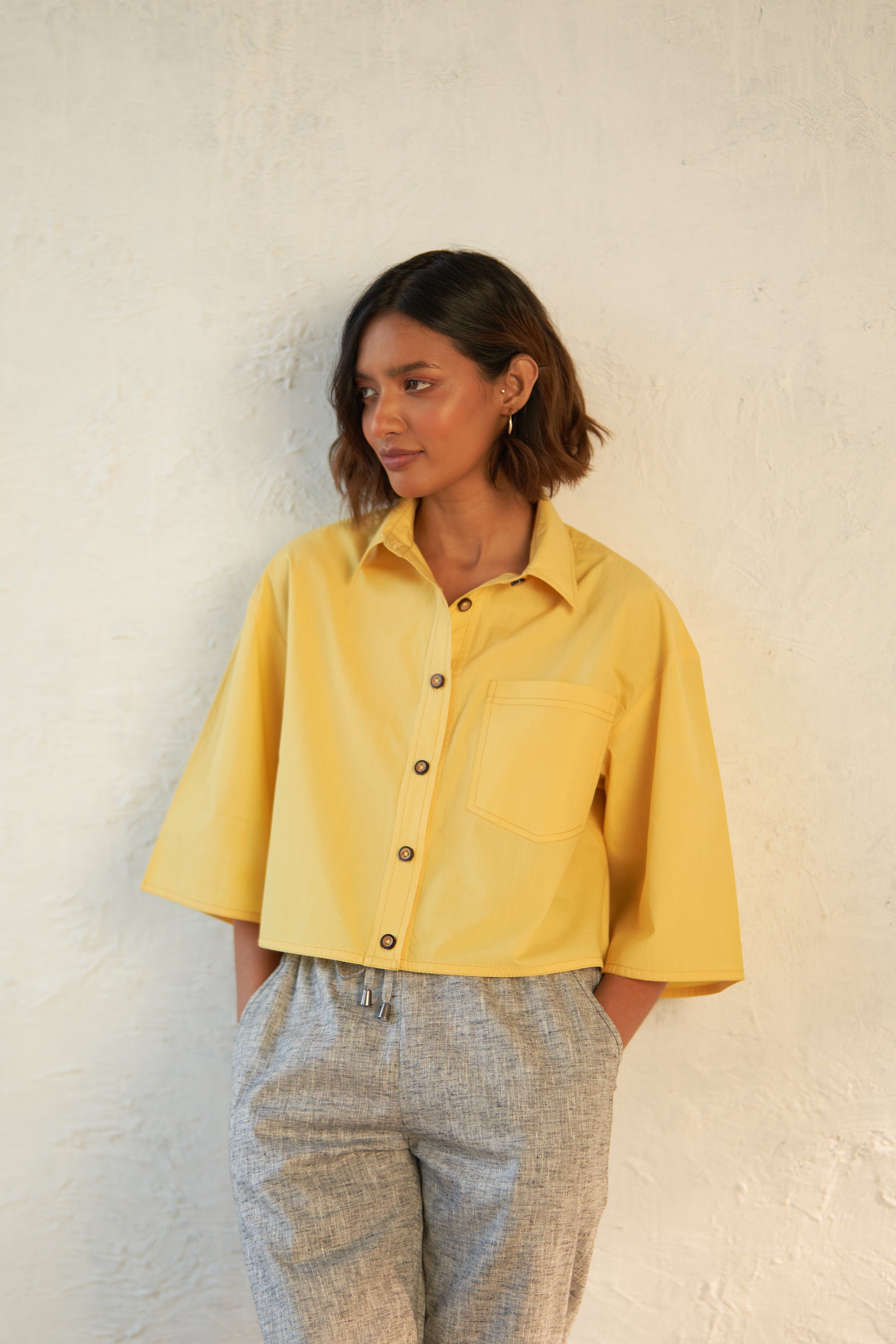 Crafted in soft cotton fabric reminiscent of a sunny lemony gush, our shirt is cut in a boxy profile that exudes casual comfort. It's adorned with patch pockets and bold black buttons, while subtle stitch detailing adds a unique touch.