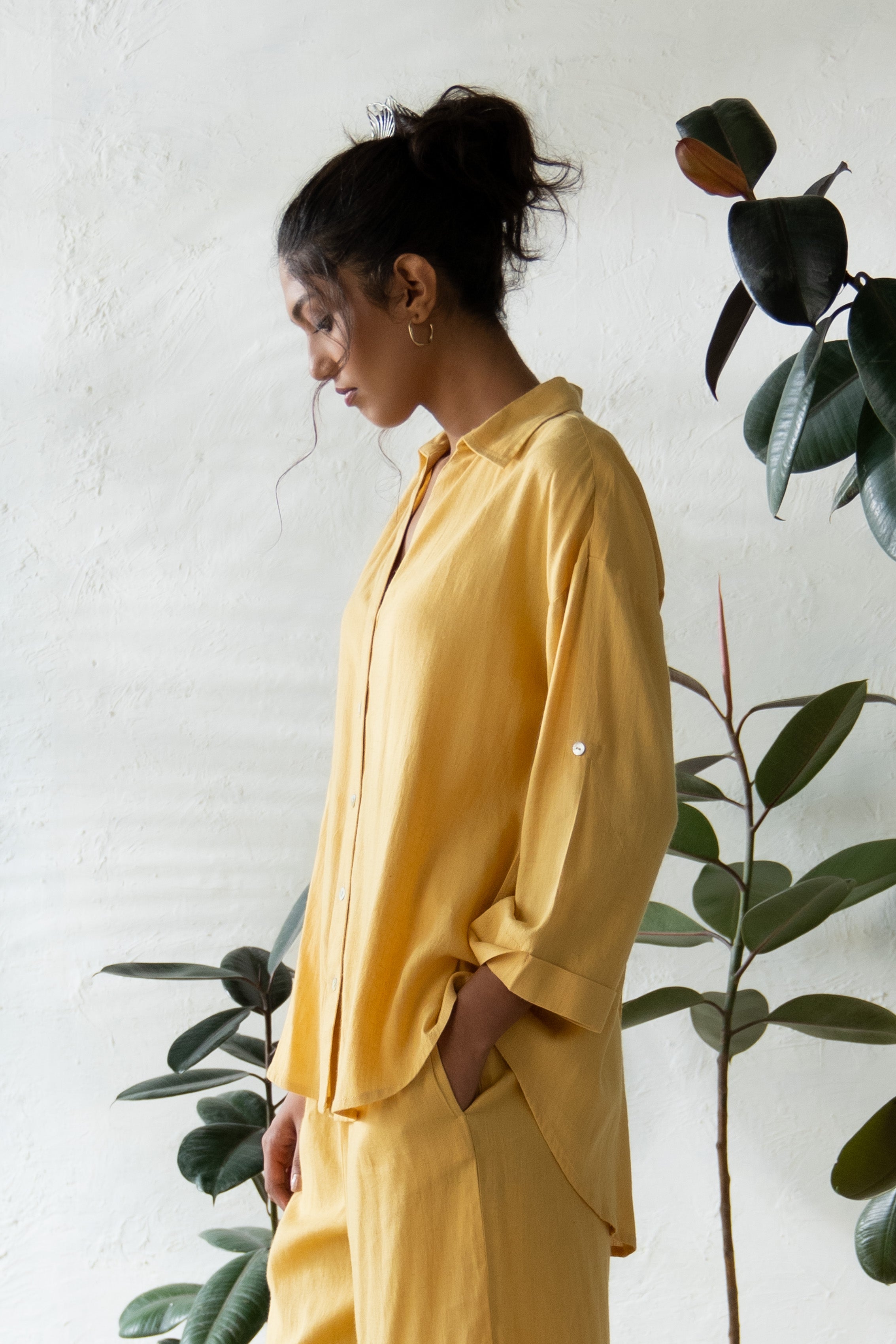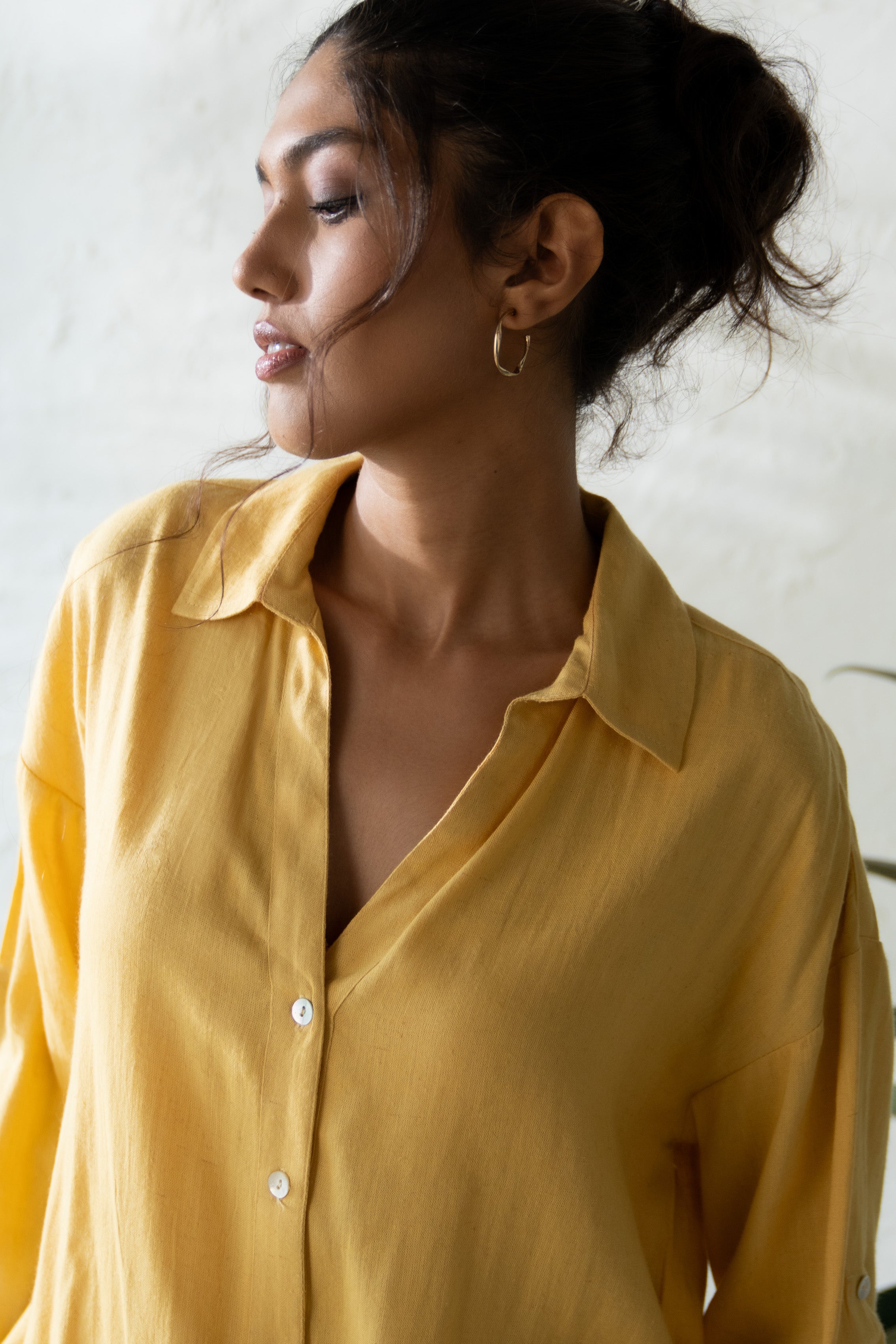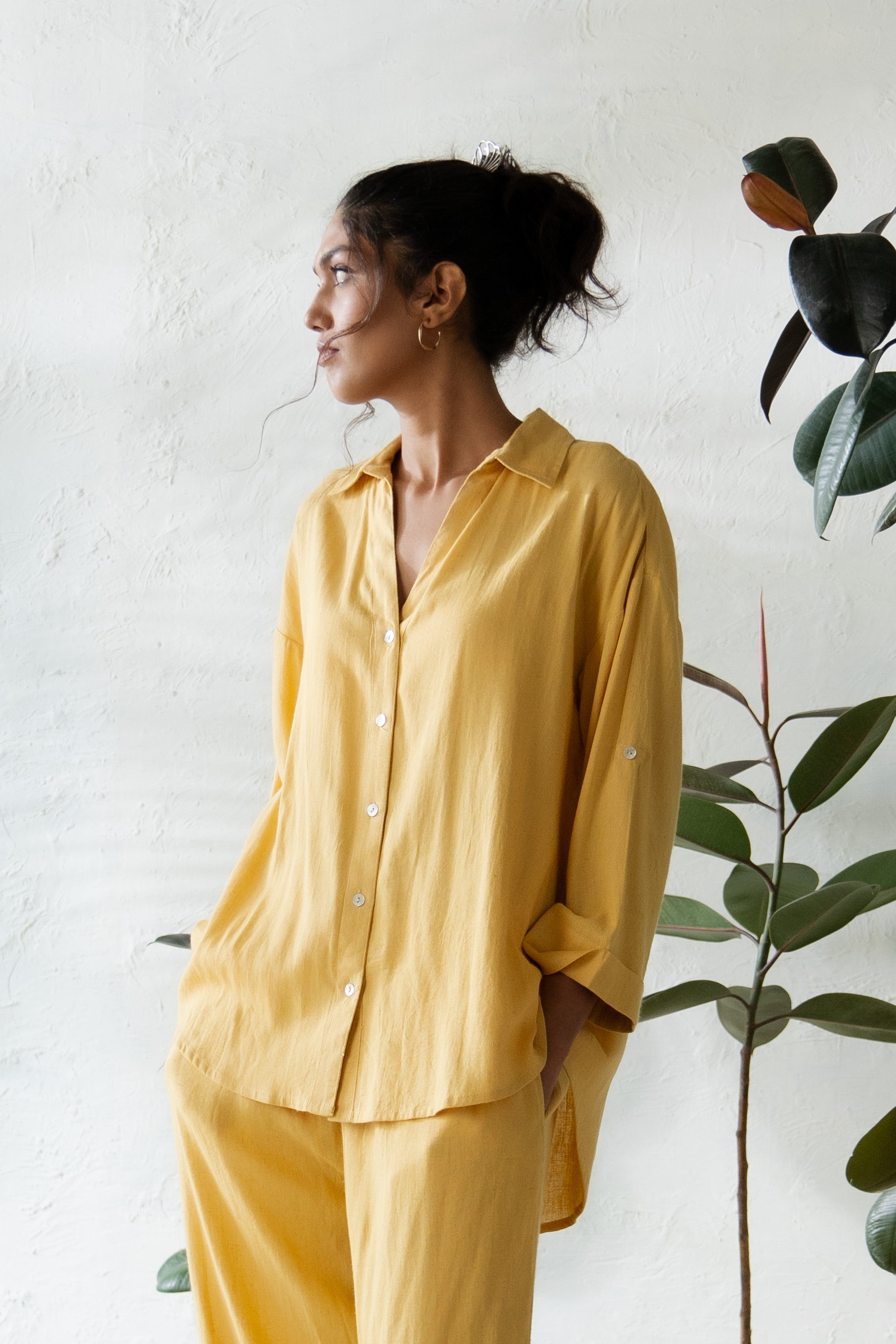 Bask in effortless elegance with the Sunlove Shirt. Crafted from breathable flex fabric, this flowing ochre shirt features an oversized silhouette, a flattering V-neck, a gently curved hemline, and delicate shell buttons. Versatile and timeless, it pairs effortlessly with any bottom for a chic, relaxed look.