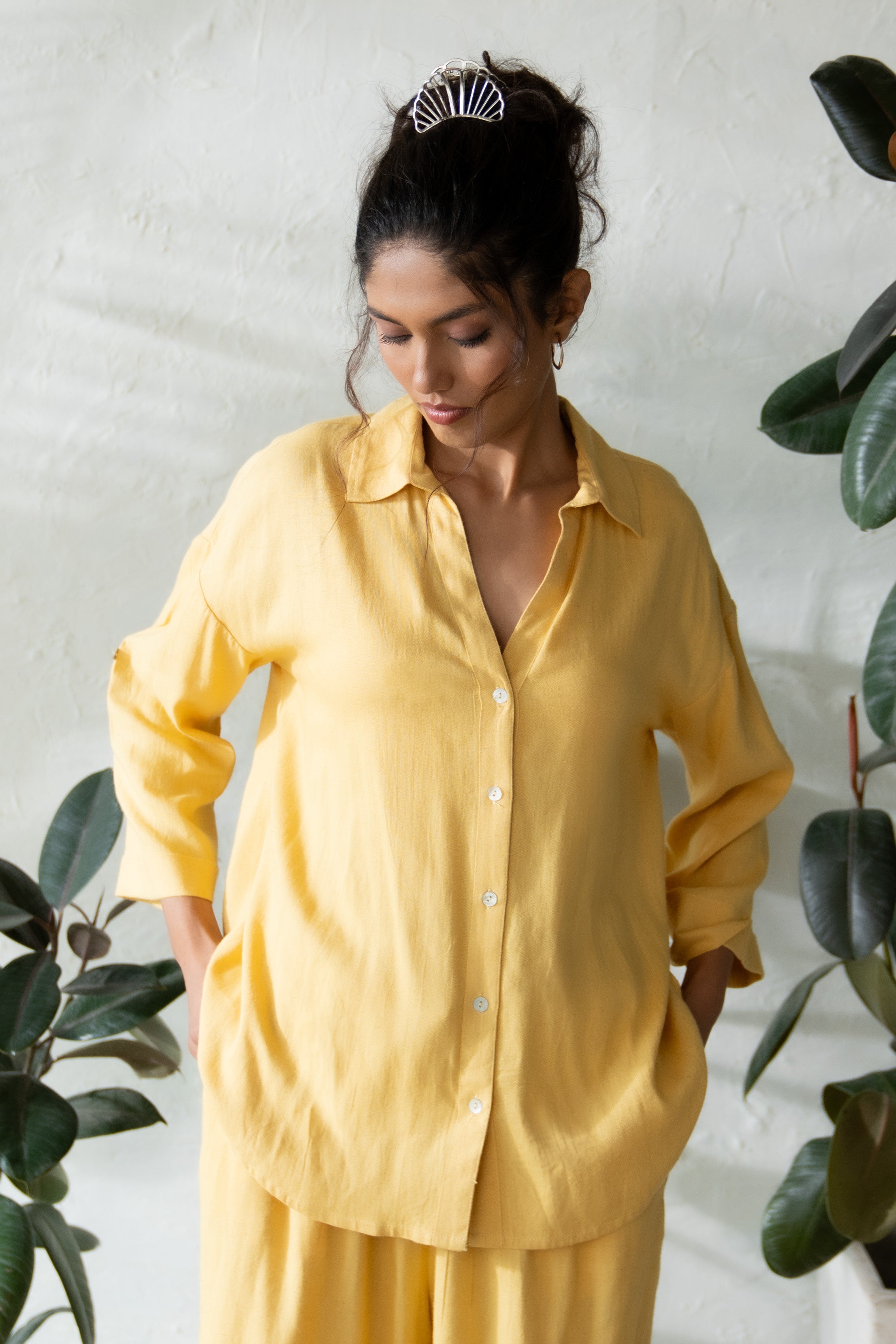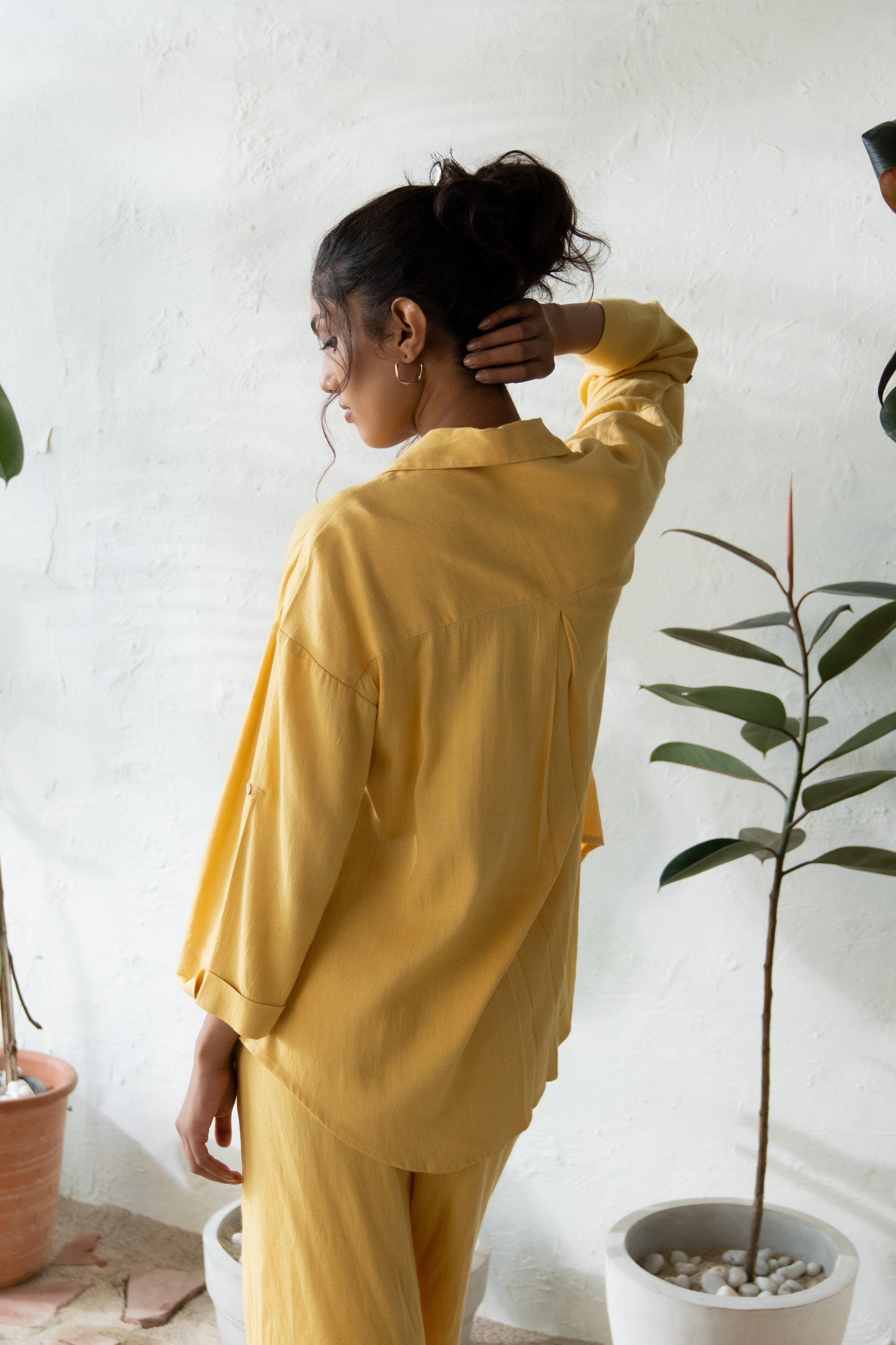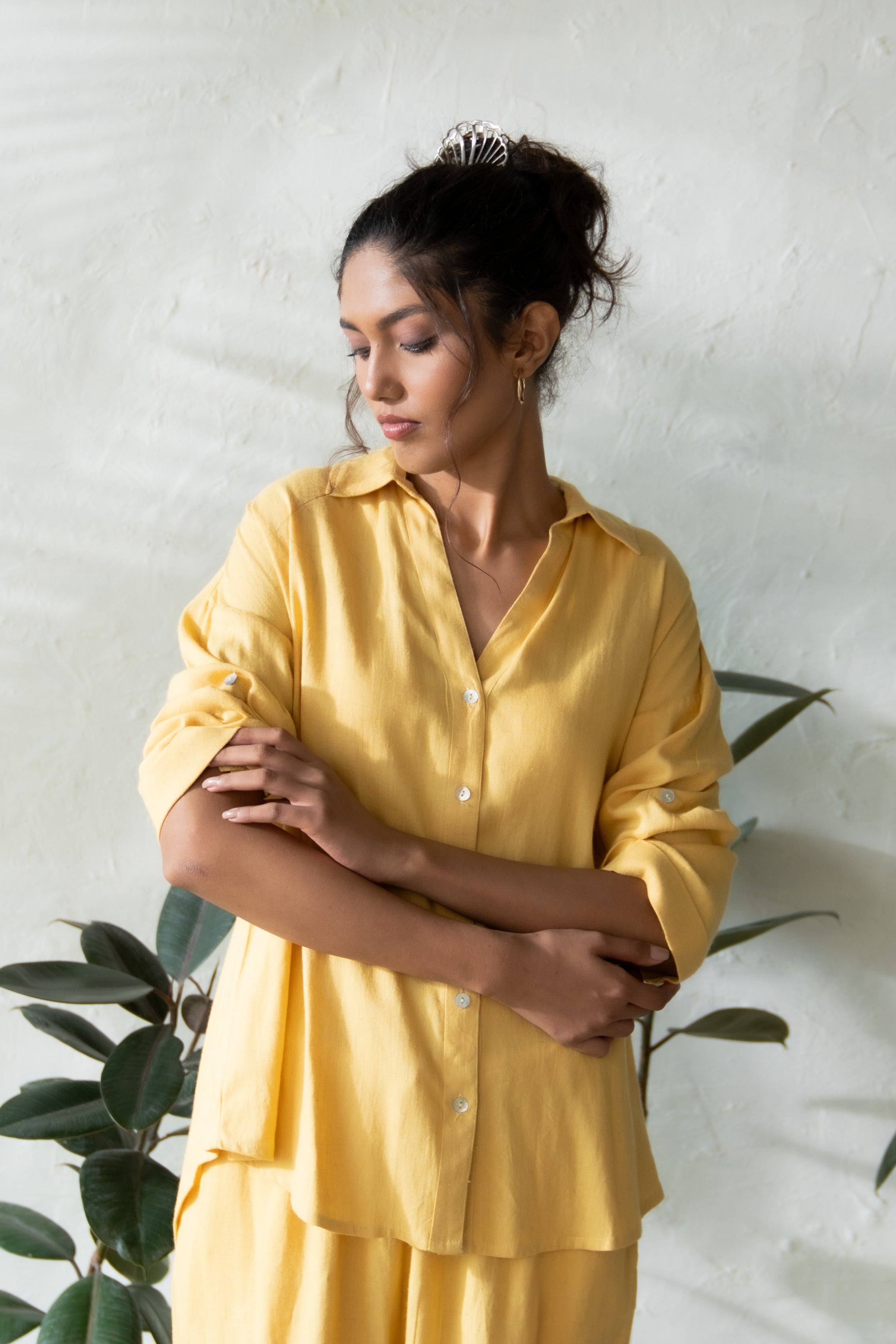 Bask in effortless elegance with the Sunlove Shirt. Crafted from breathable flex fabric, this flowing ochre shirt features an oversized silhouette, a flattering V-neck, a gently curved hemline, and delicate shell buttons. Versatile and timeless, it pairs effortlessly with any bottom for a chic, relaxed look.