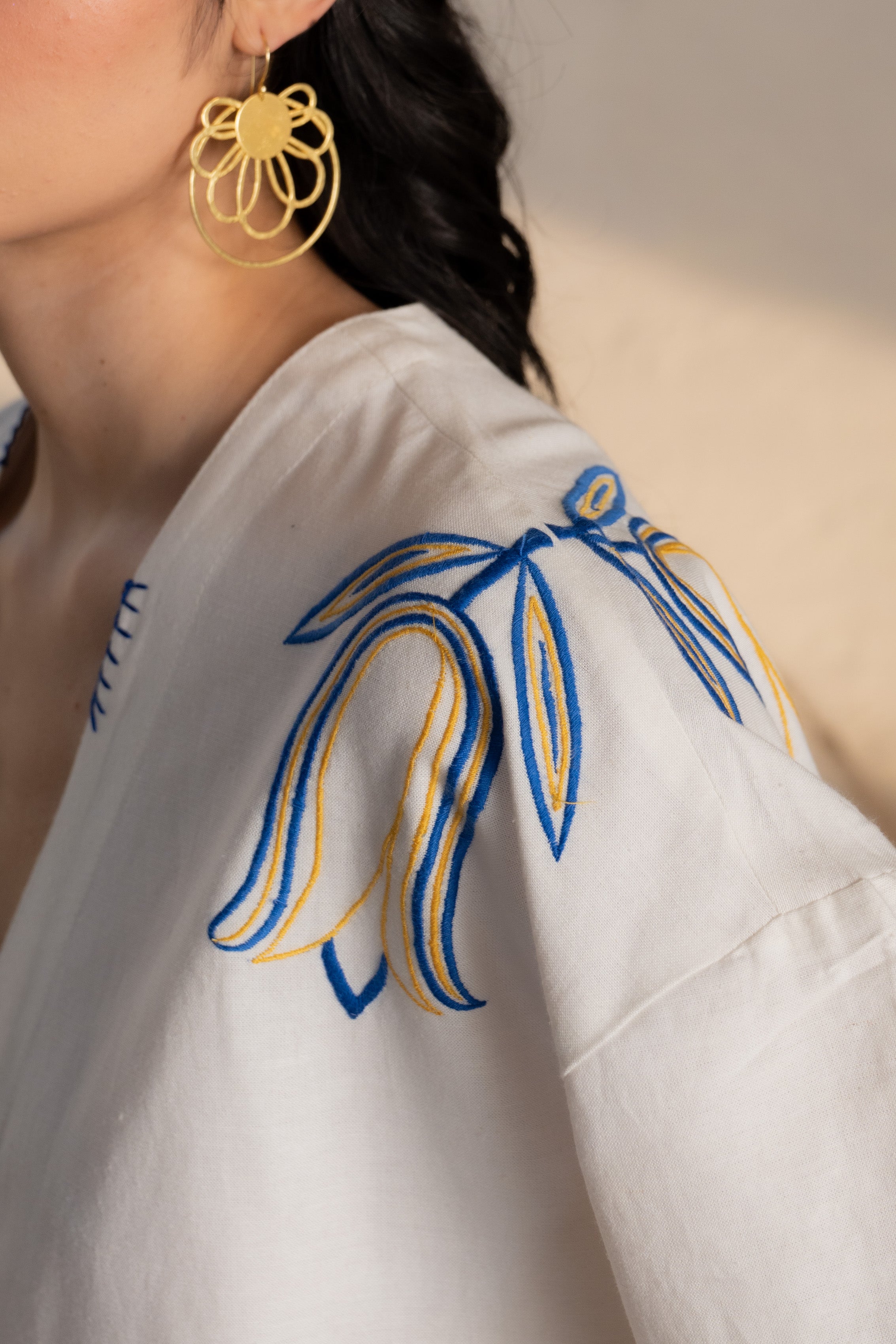 Add a touch of grace to your wardrobe with the Tulip Mist Embroidered Shirt. Showcasing hand-embroidered blue tulips reminiscent of fresh morning dew, this collarless V-neck shirt offers a relaxed fit and versatile styling options. Wear it tucked in for a polished look or keep it untucked for effortless chic.