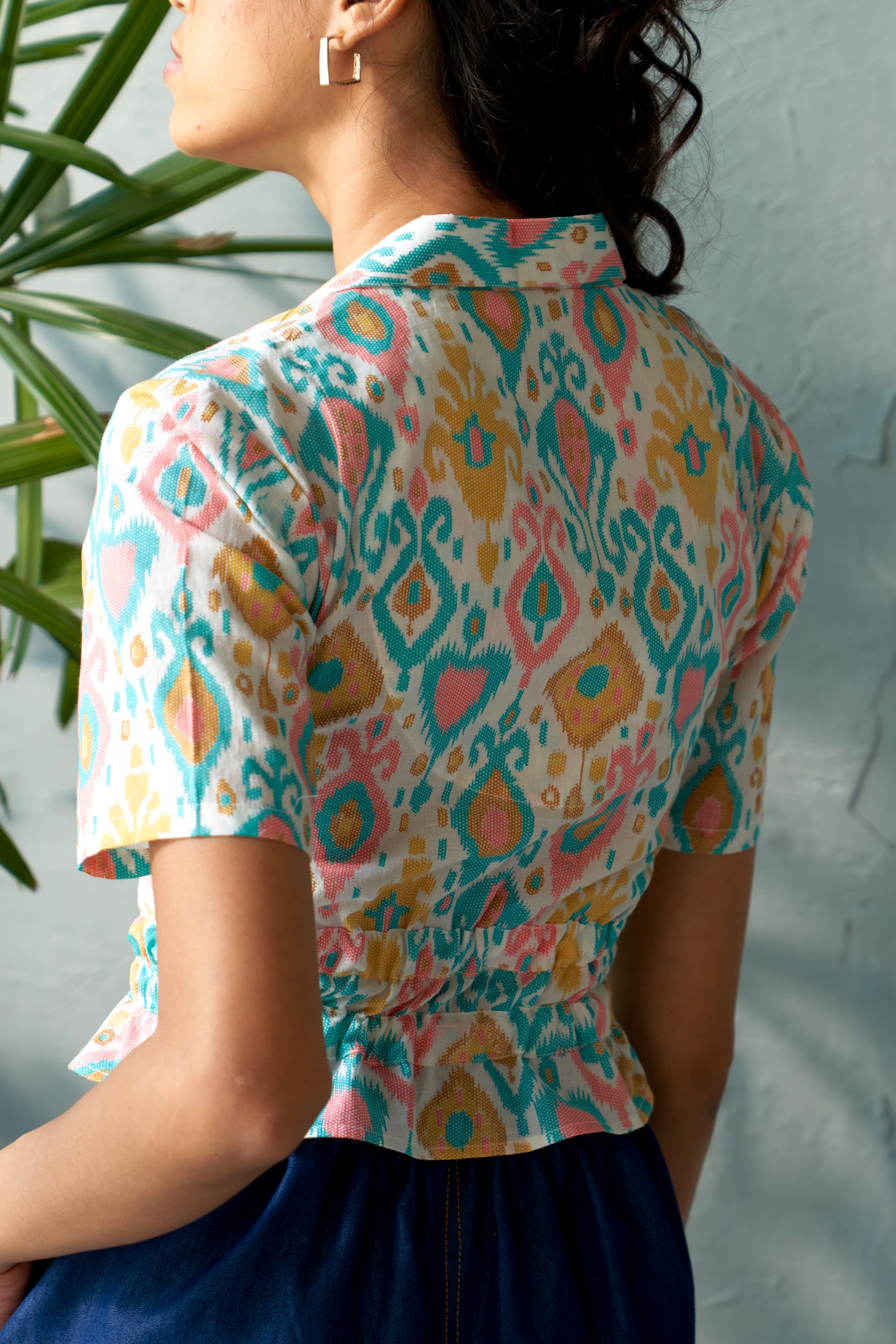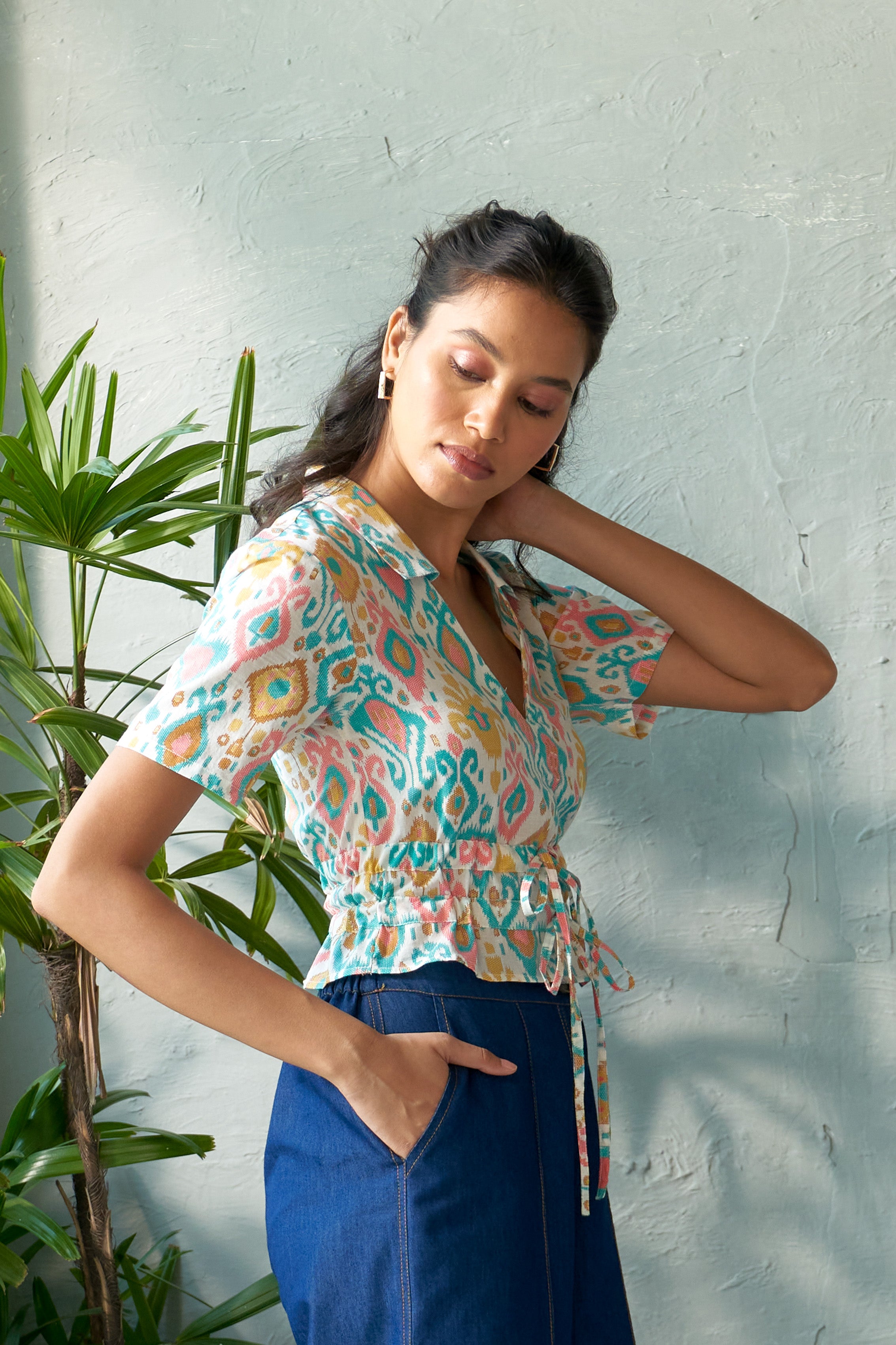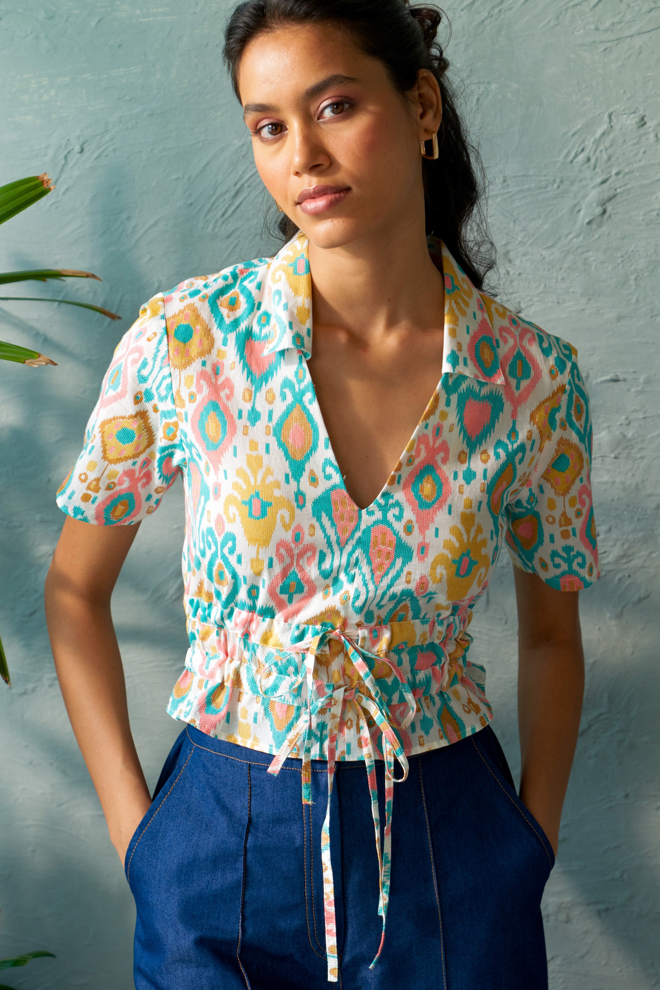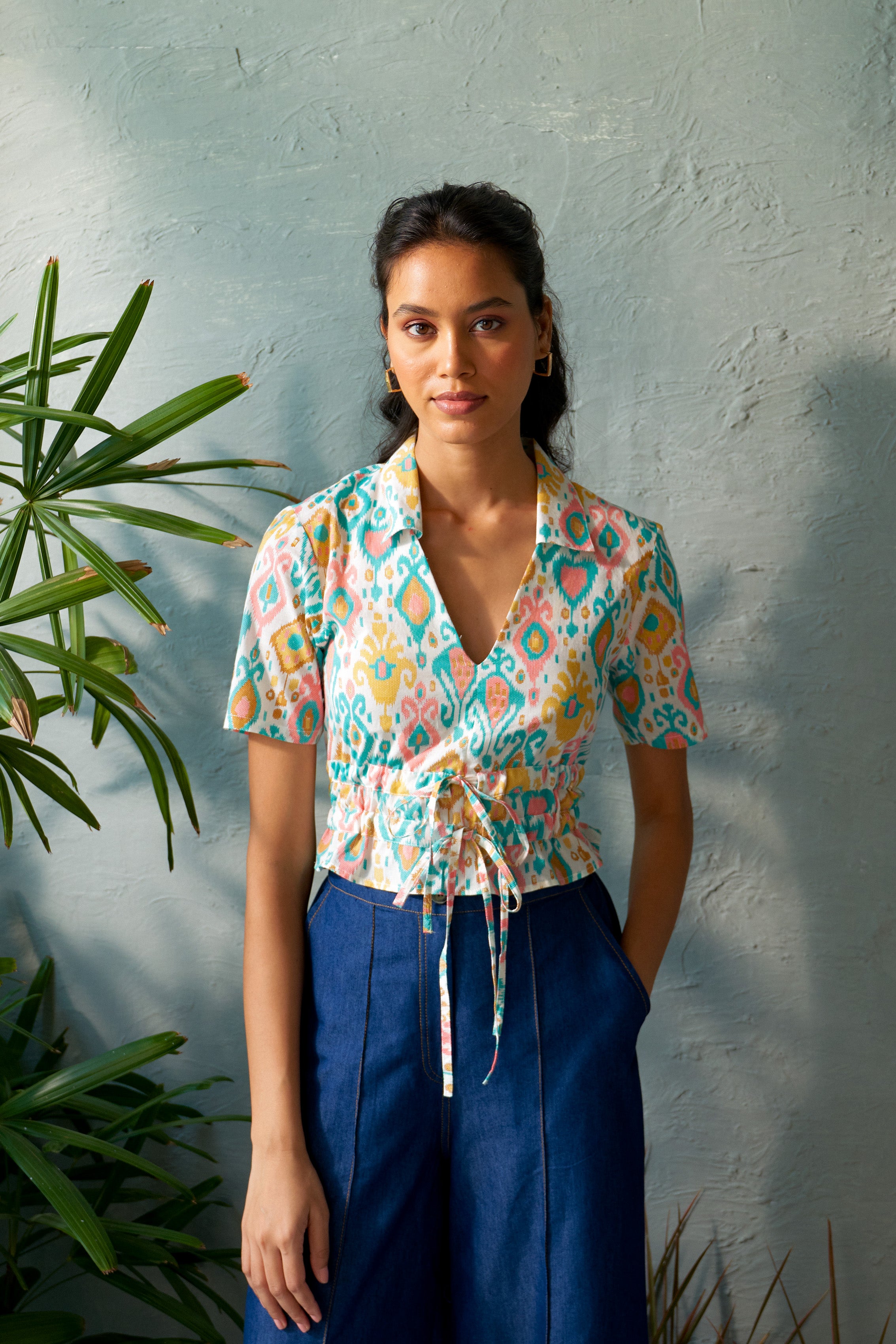 Light as a breeze, the Zephyr Top is your go-to piece for chic, breathable style. Crafted in soft cotton with a vibrant and colorful print, it brings a fresh burst of color to your wardrobe. The collared V-neckline and short sleeves add a polished touch, while the double drawstring waist lets you cinch it just the way you like for a flattering silhouette. Pair it with relaxed trousers, high-waisted denim, or skirts for a look that’s equal parts playful and put-together.