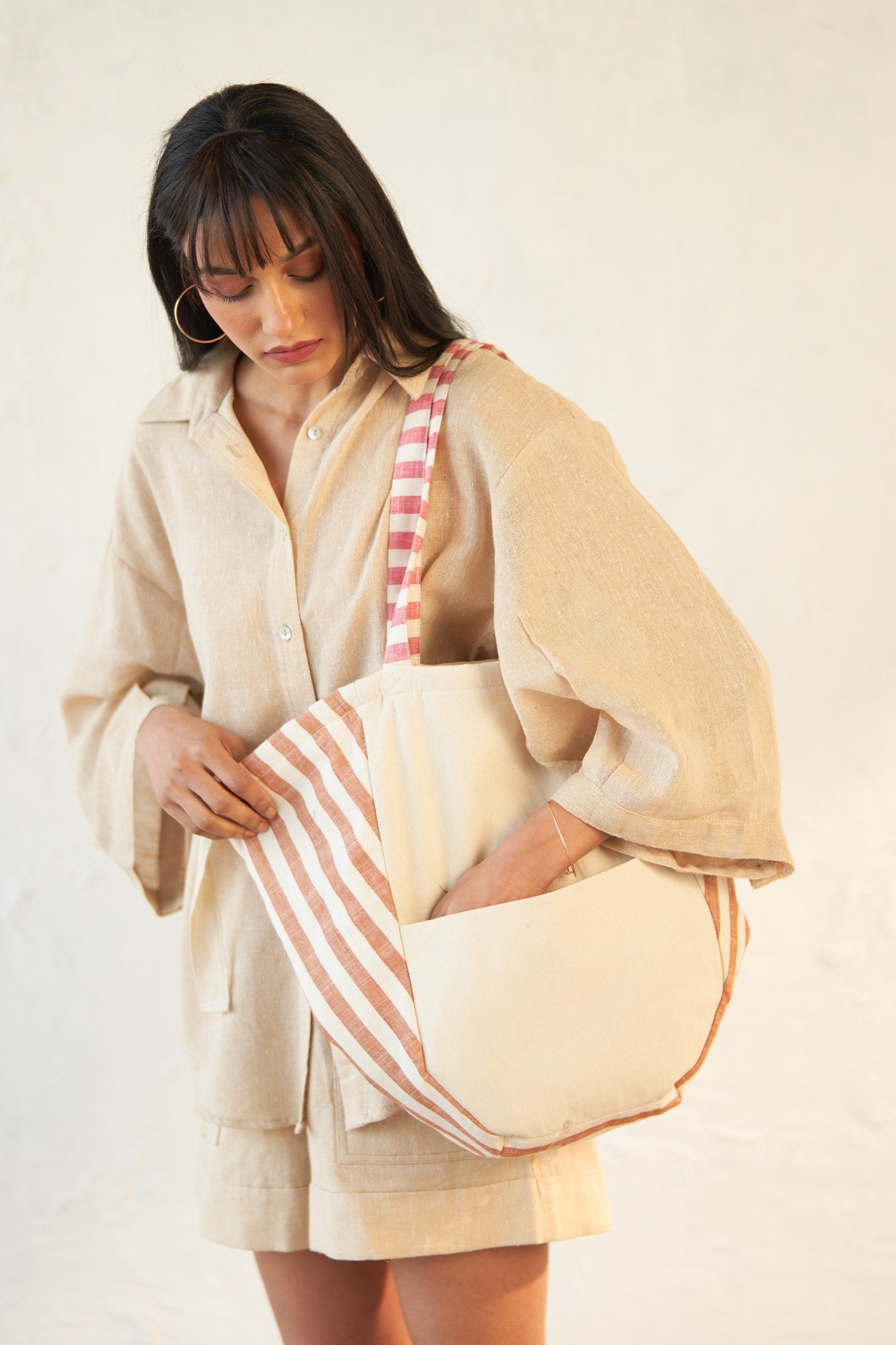 It is made with an interplay of contrasting stripes and off-white cotton fabric, both inside and out. This tote offers multiple carrying options: carry it as is for a casual vibe, or fold back its edges in the middle and secure them with a buckle for a more structured appearance. Its exterior features convenient side pockets for quick access to essentials, while inside, dual patch pockets keep your phone and other small items organized within the spacious interior.