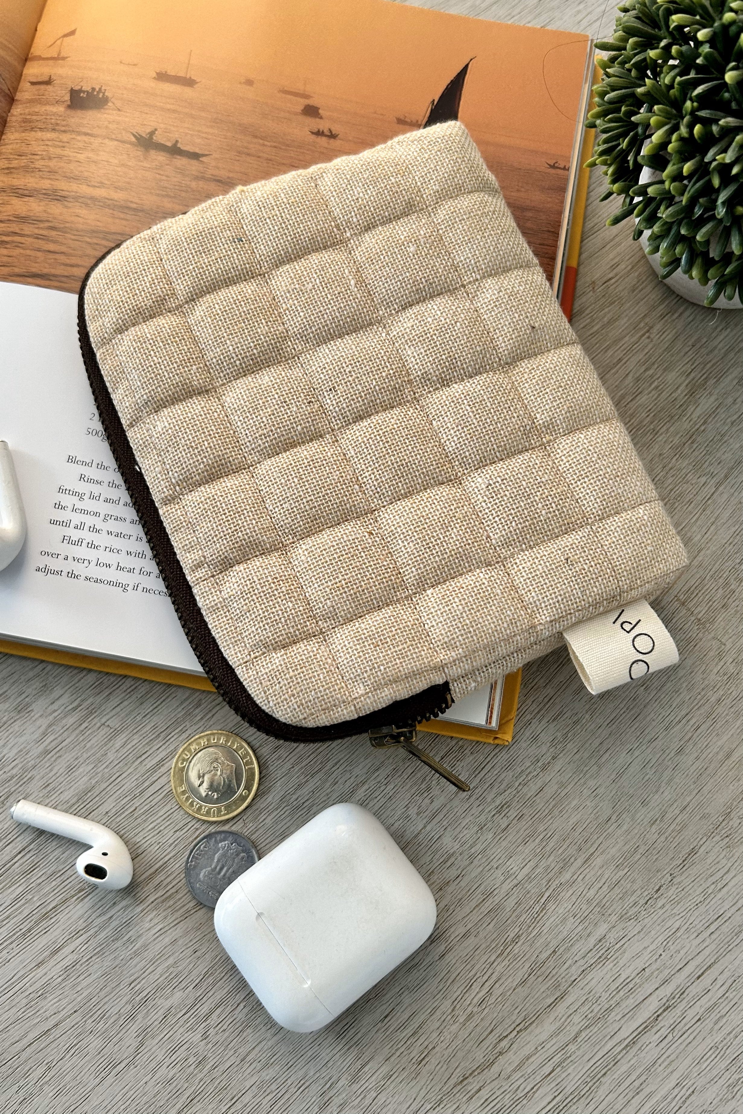 Handmade with care, this travel pouch features a protective quilted foam lining and is crafted from soft jute material.