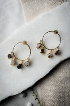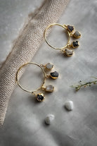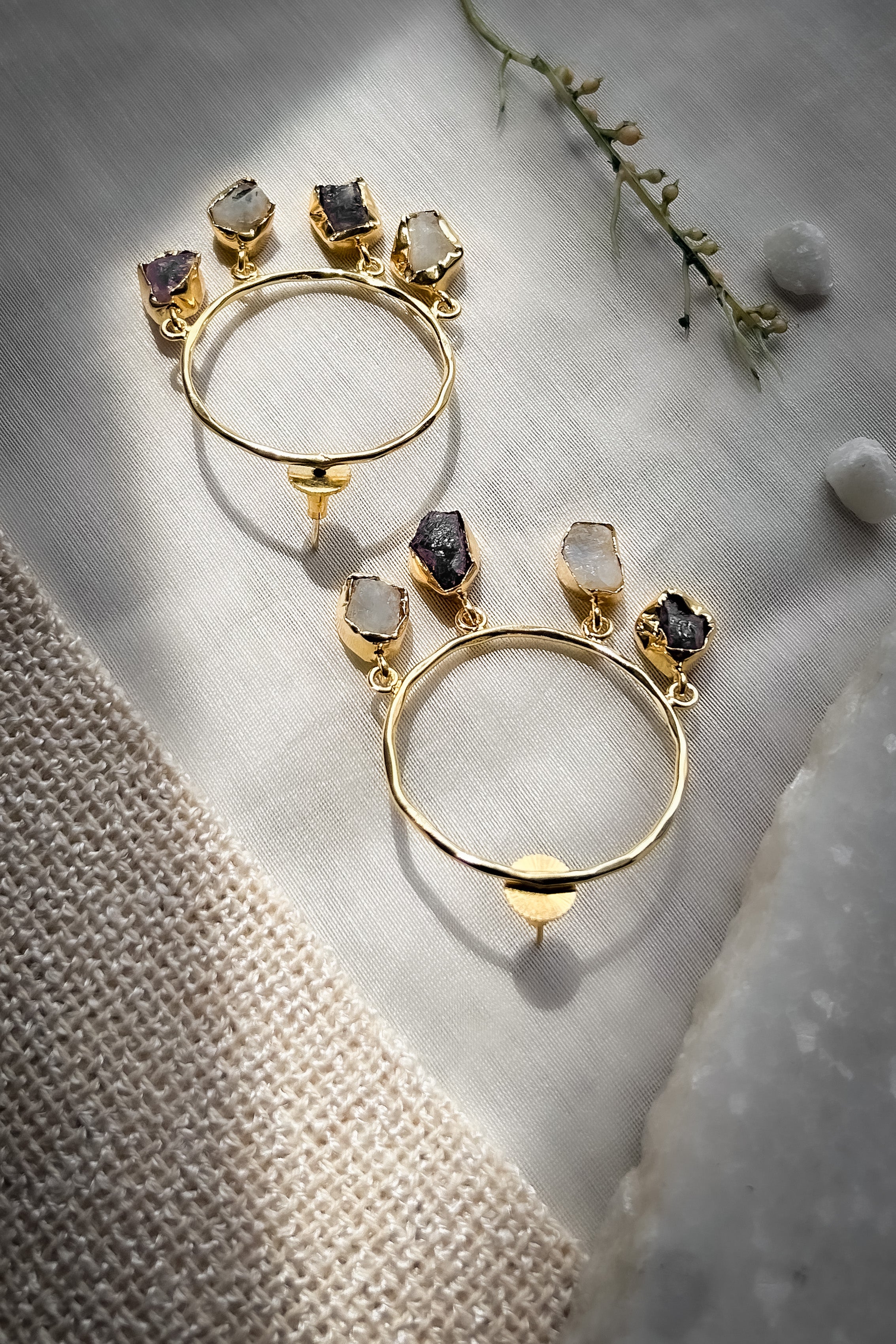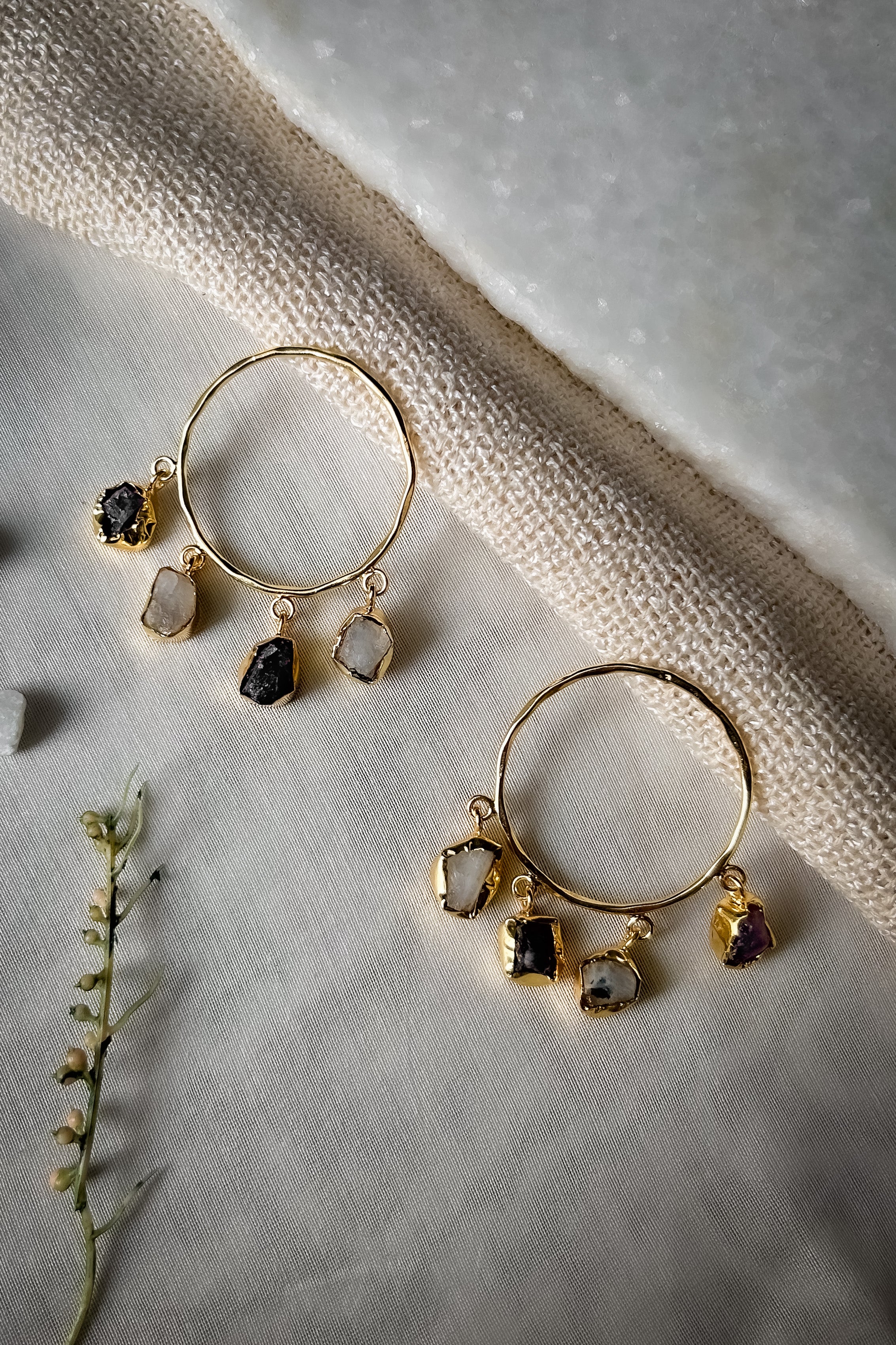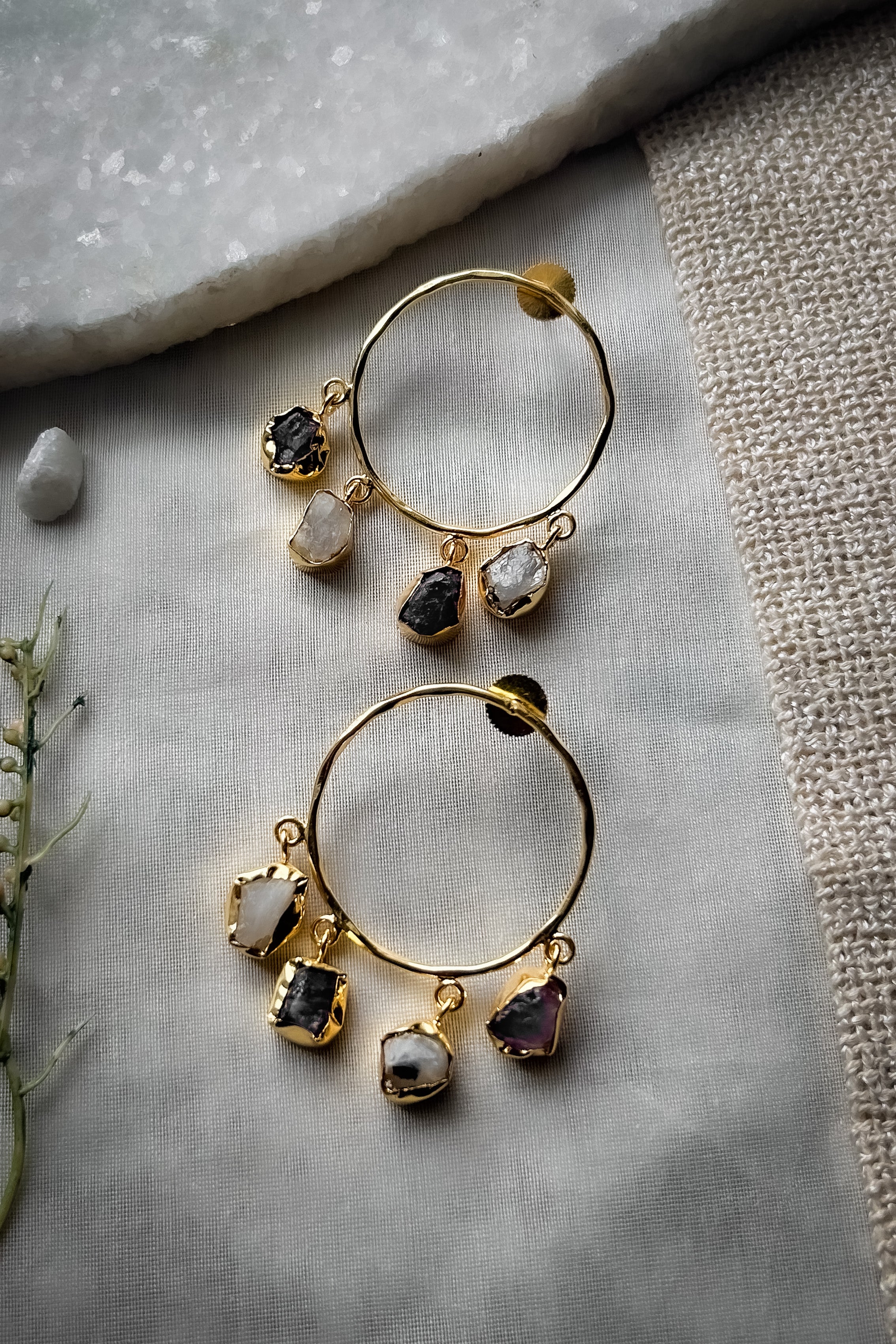 Handmade with uneven semi-precious varied colour stones covered with brass. Each piece is one-of-a-kind due to the material sourcing.