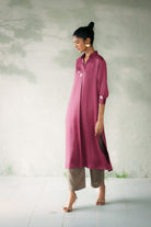 The Altaira Coord Set blends comfort with understated sophistication. Its shirt-style kurta is designed with a neat collared neckline, front pleat detail, and relaxed 3/4th sleeves for a polished yet relaxed silhouette. A subtle hand-embroidered bird motif lends a refined decorative touch. The contrast mousse-coloured straight-fit ankle-length pants are fully elasticated and finished with a drawstring, ensuring all-day comfort. Perfect for those who appreciate contemporary design with a touch of artistry.