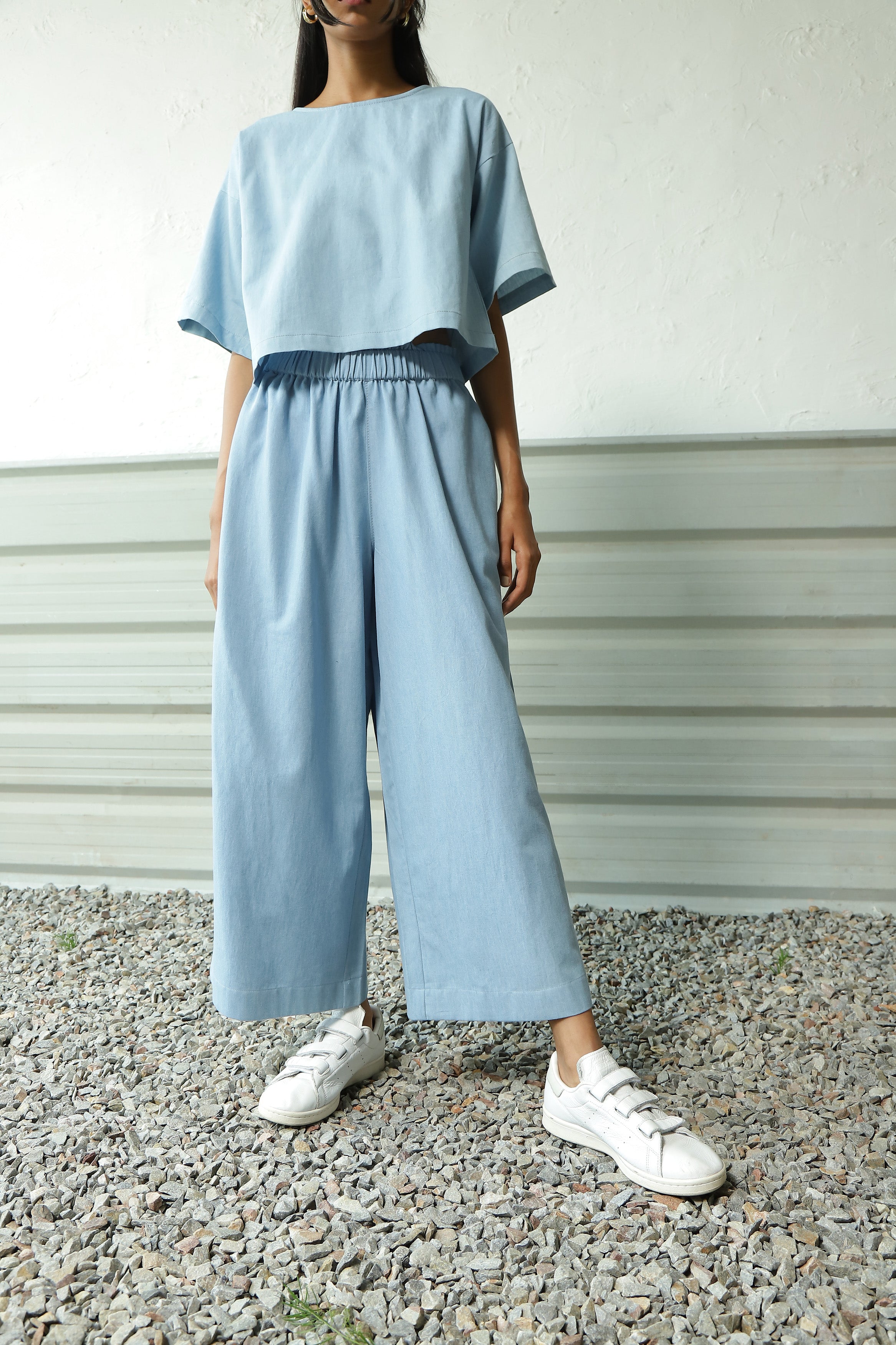 Cozy Denim Duo Matching Set - Embrace the Coordinated Trend. The cropped top harmoniously complements the coordinating denim palazzos, creating a must have ensemble. Crafted from lightweight, breathable cotton that caresses the skin, it boasts dropped shoulders and elbow-length sleeves.