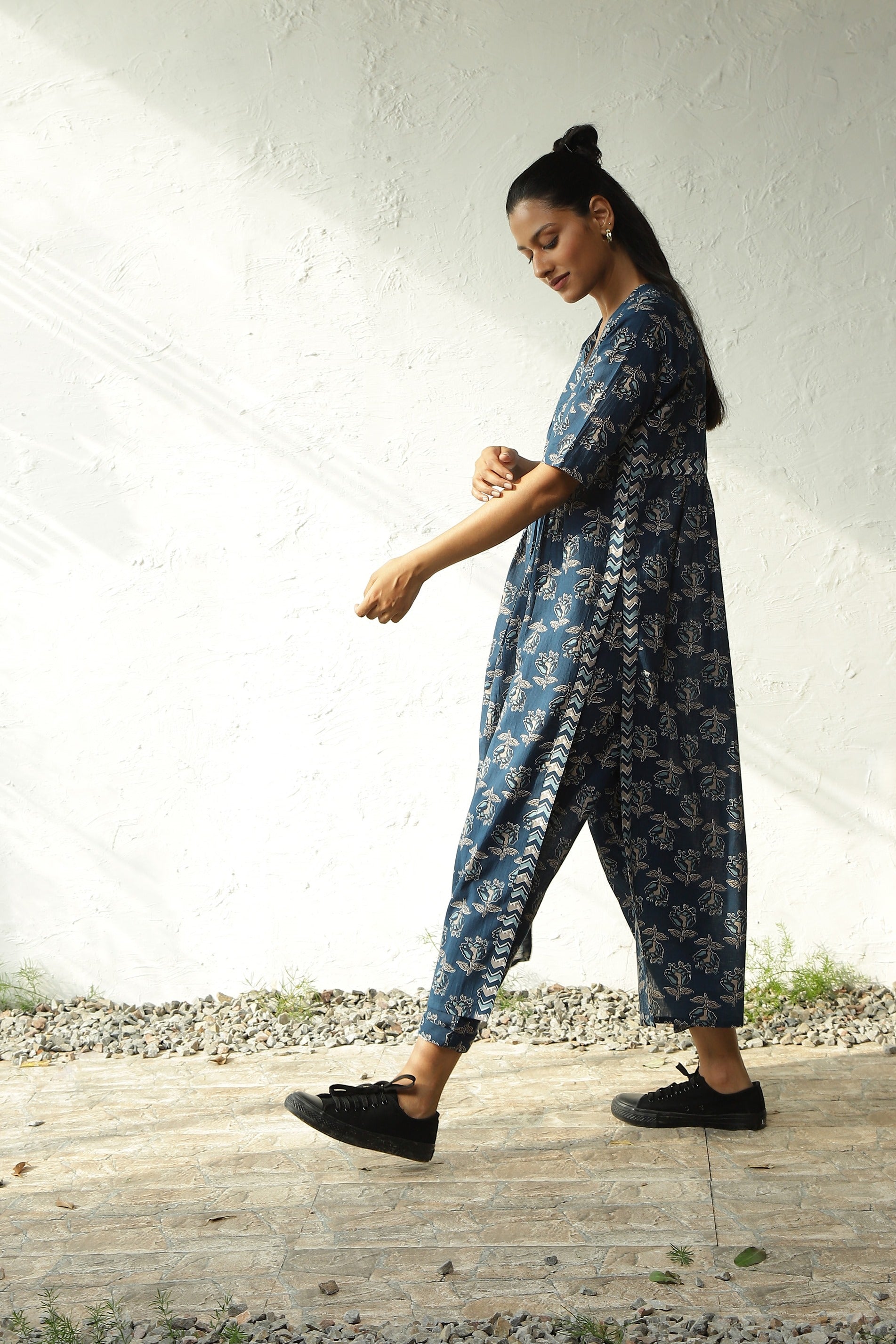 Embrace the delicate spring hues with our blossom kurta set. Crafted from lightweight cotton fabric, it offers a breathable feel. The smart v-neckline is adorned with gathers around the bustline, adding flare to the garment. High side slits and narrow pants contribute to the modern silhouette.