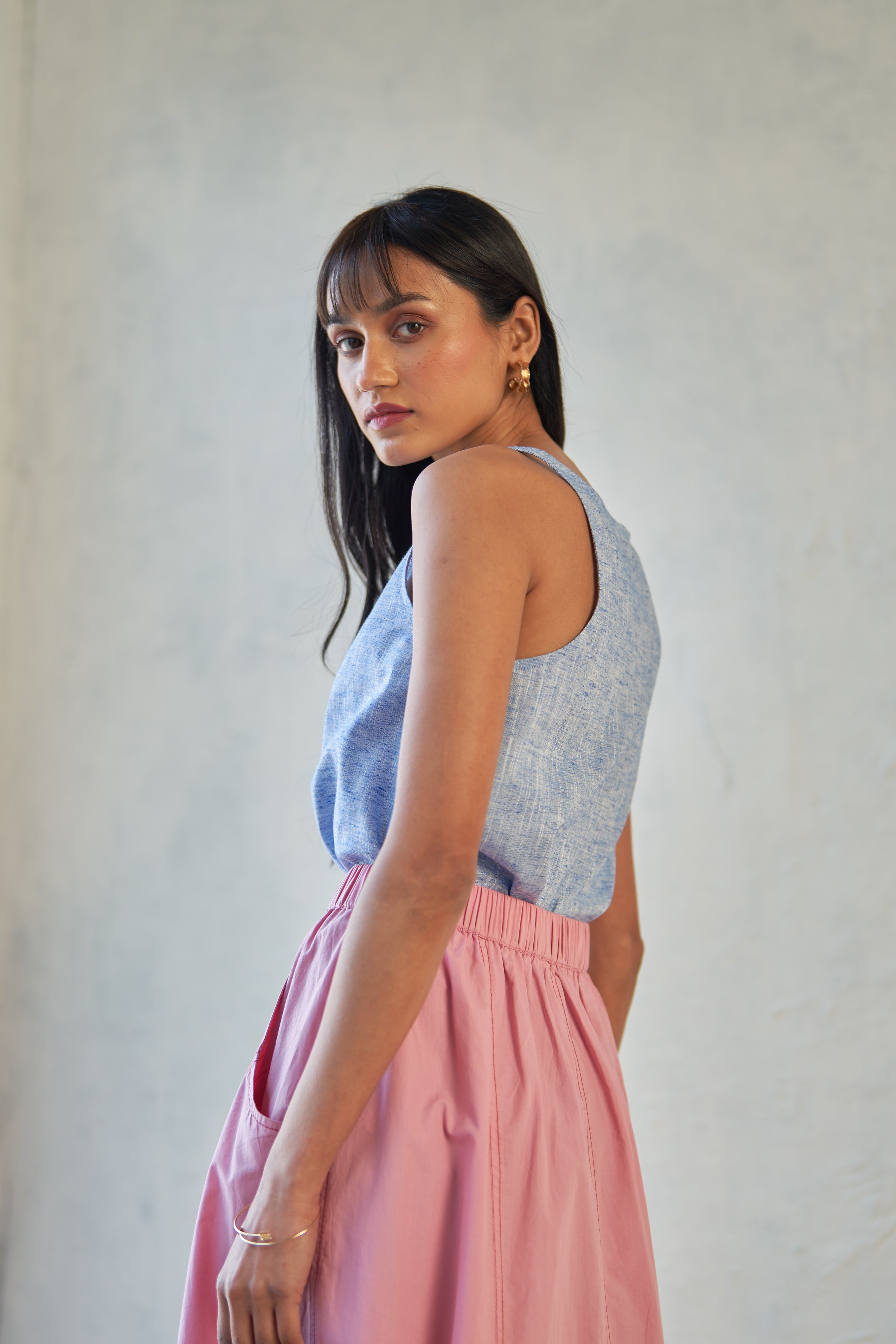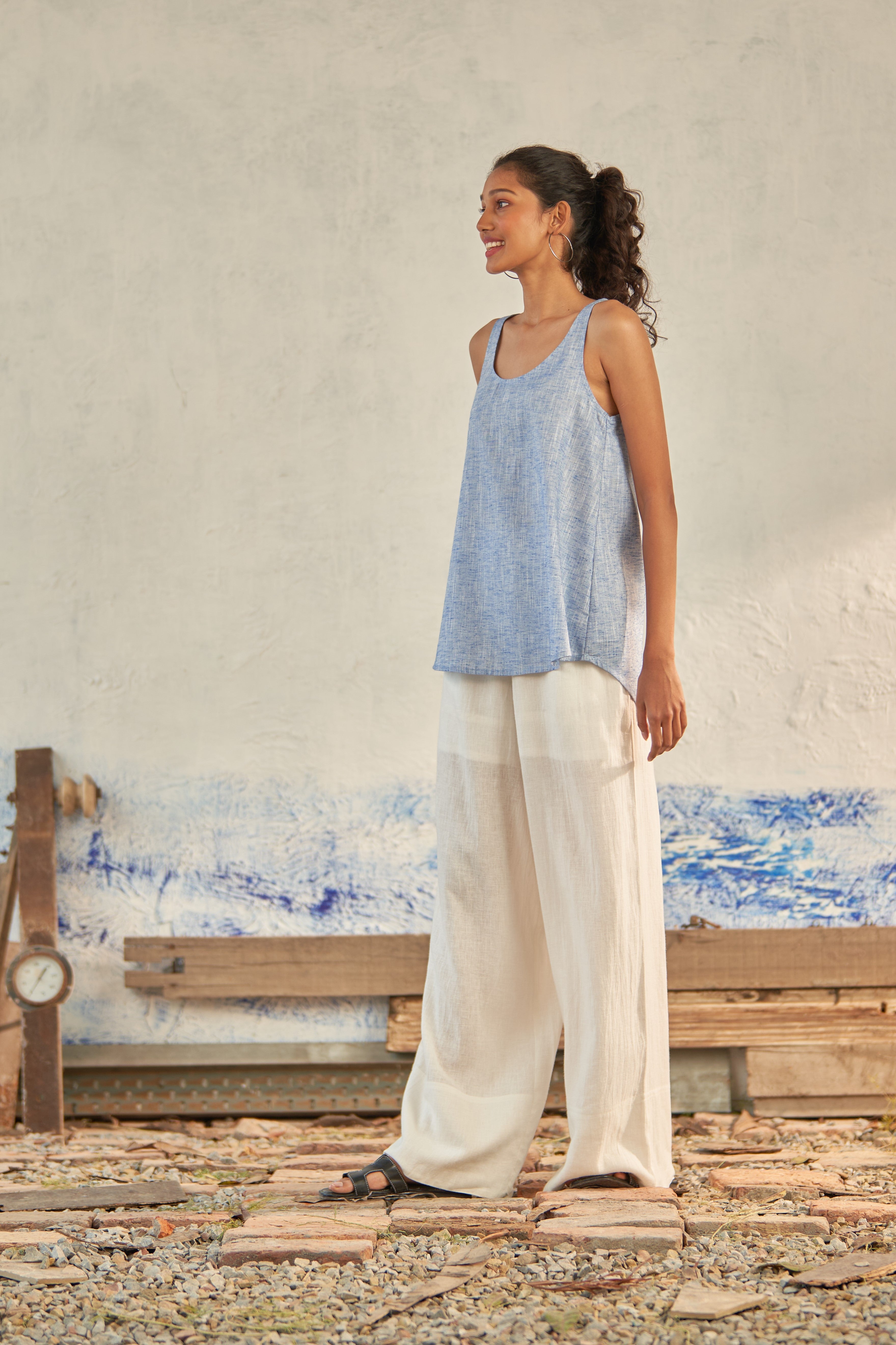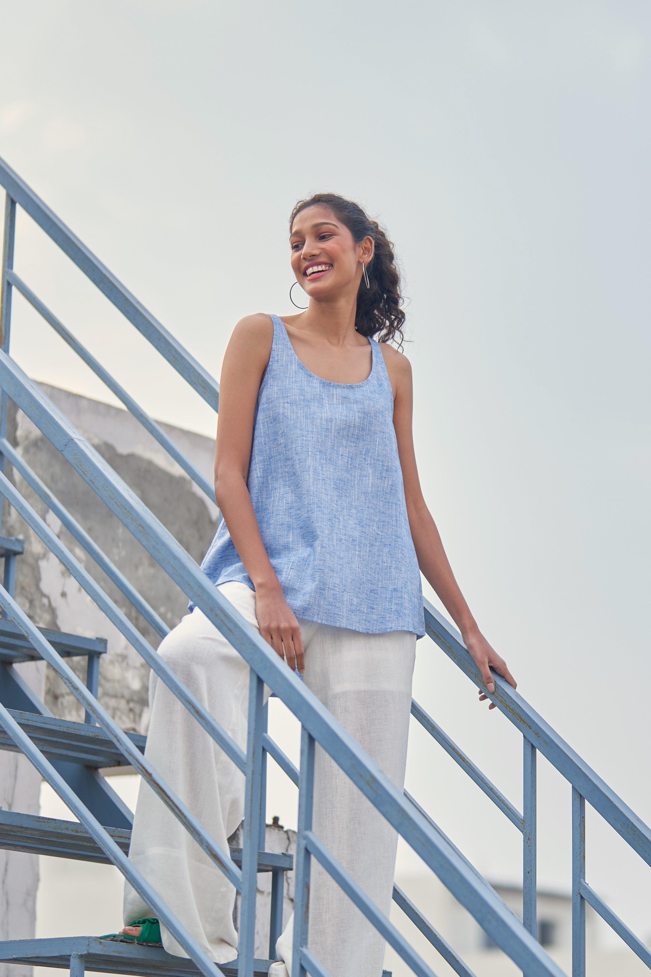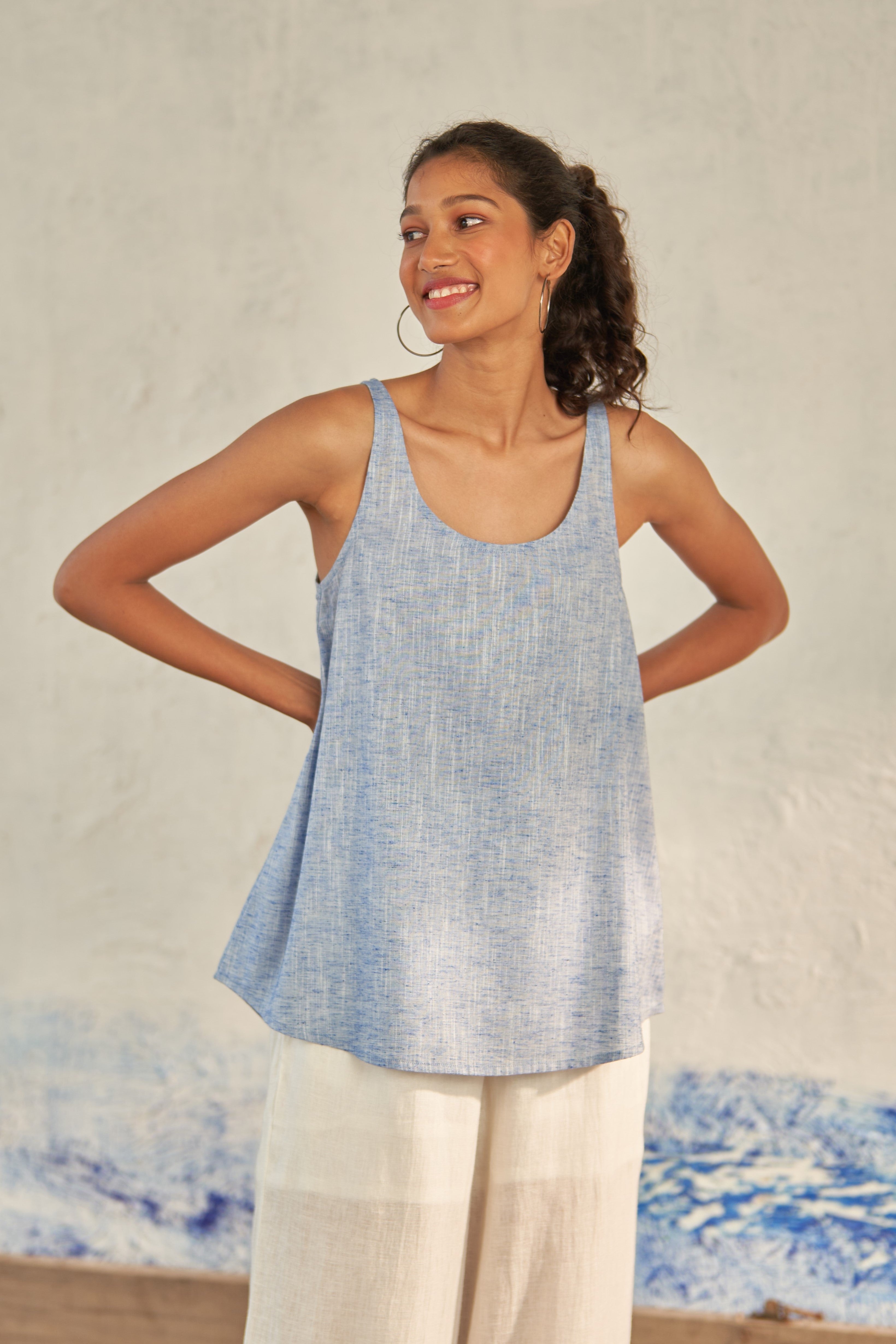 In beautiful blue textured cotton, this tank top becomes your go-to wear for any and all outings. Its effortlessly chic A-line silhouette and versatile design ensure it's the perfect choice.