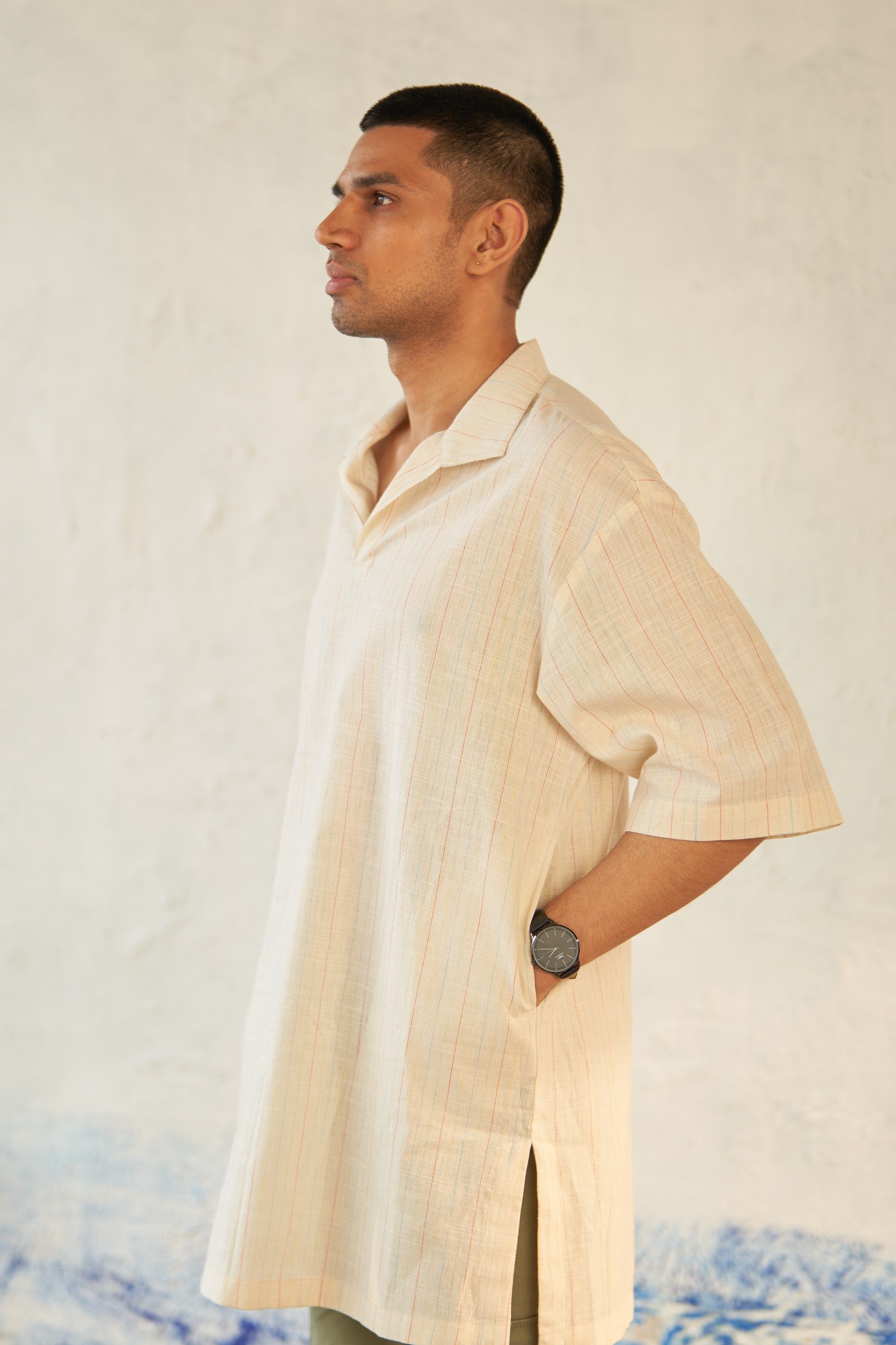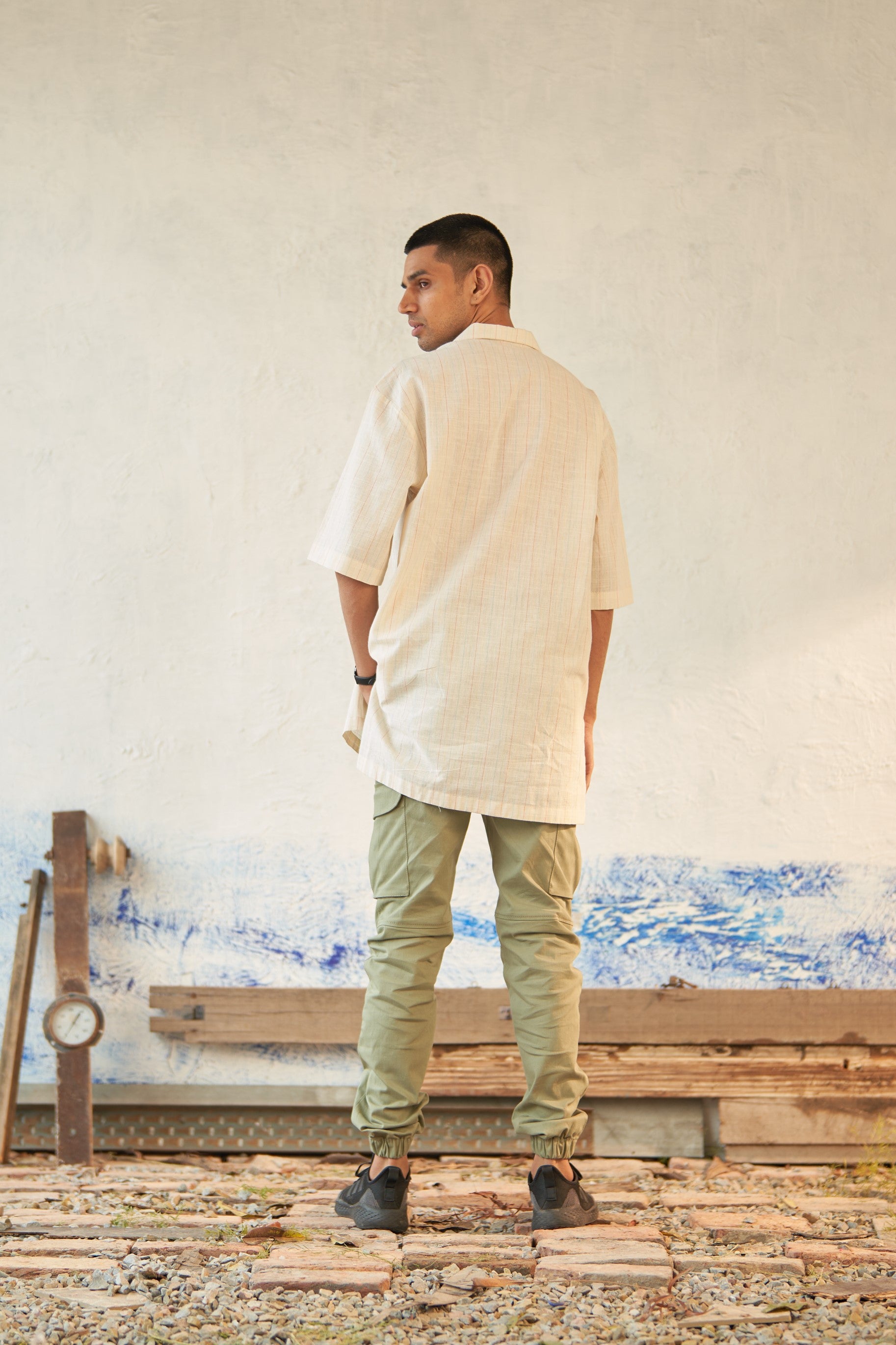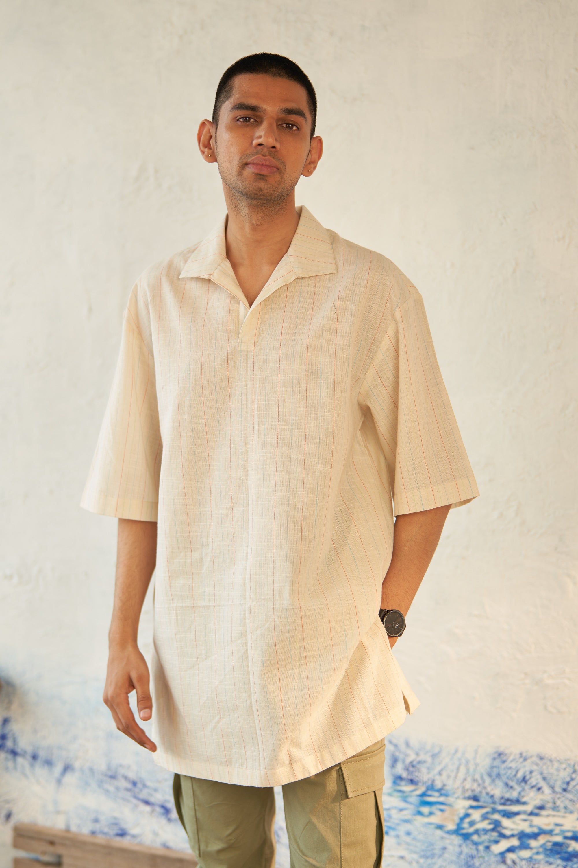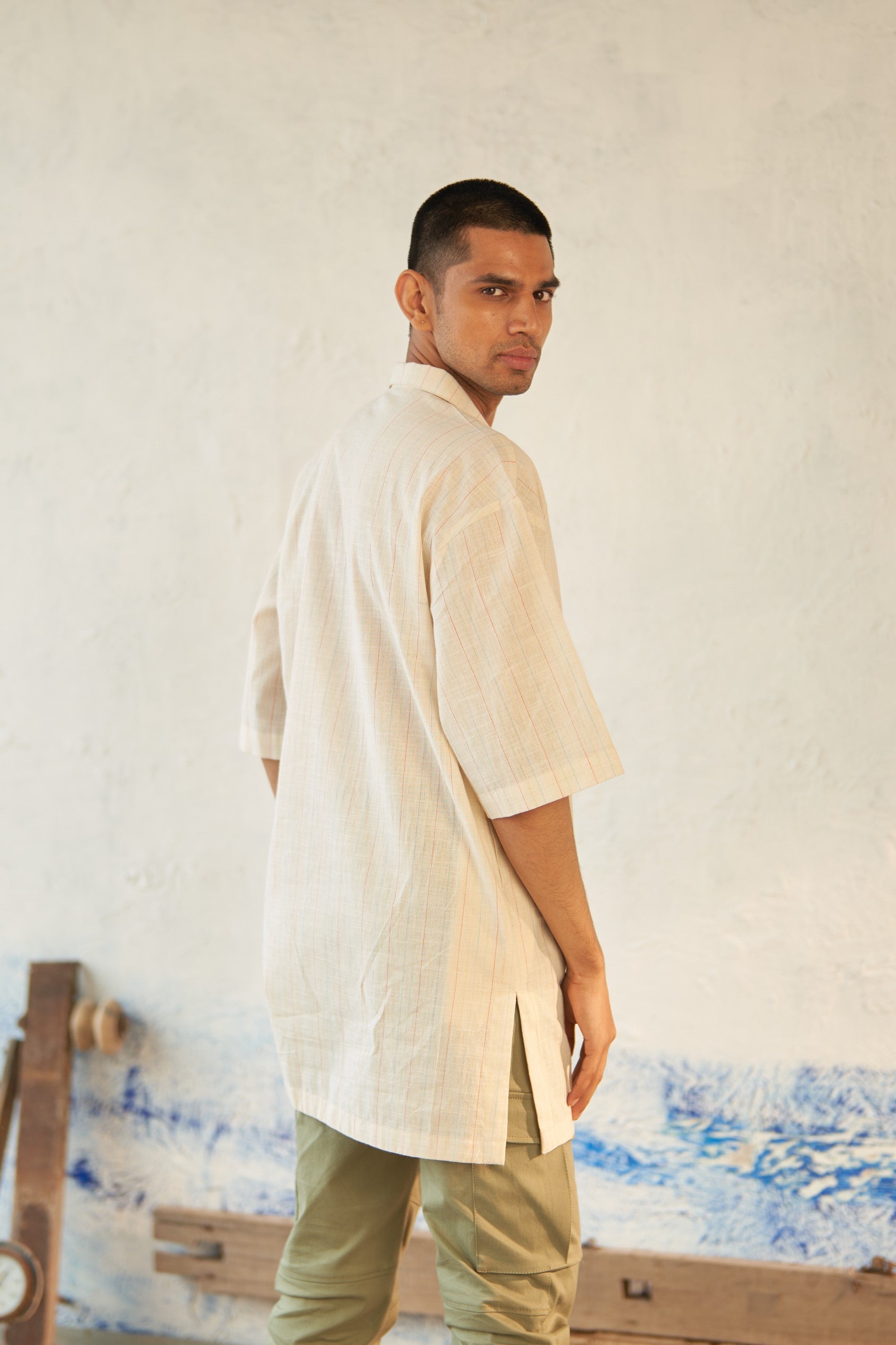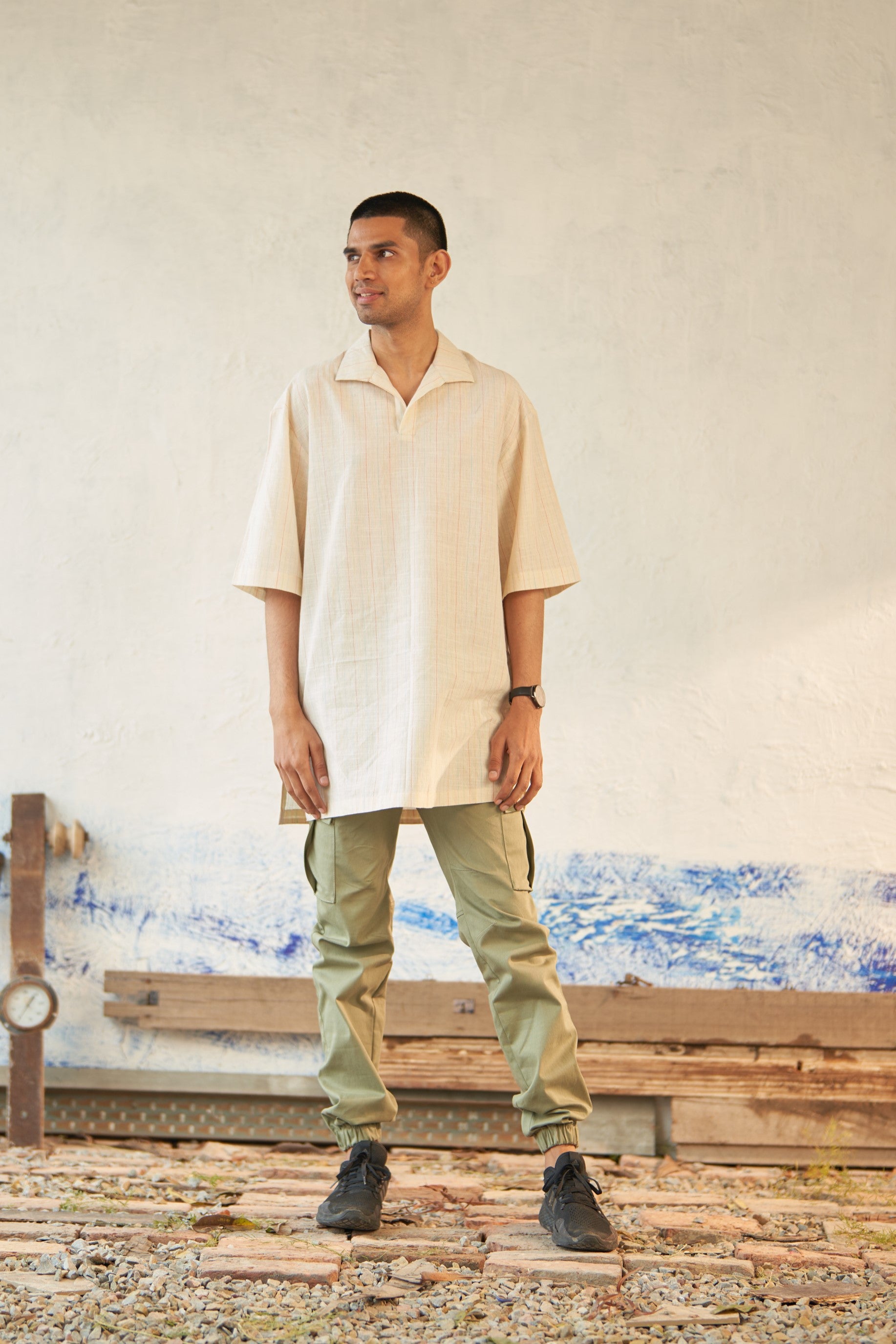 Crafted from textured cotton for a comfortable and stylish wear. This shirt is tailored in a relaxed shape, featuring an overlapping placket that creates a chic v-neck opening. The broad back yoke reflects a shirt fit, while providing enhanced comfort reminiscent of a traditional kurta. Pair it as you please, a pyjama or cargo pants to enhance the appeal on your daily routine
