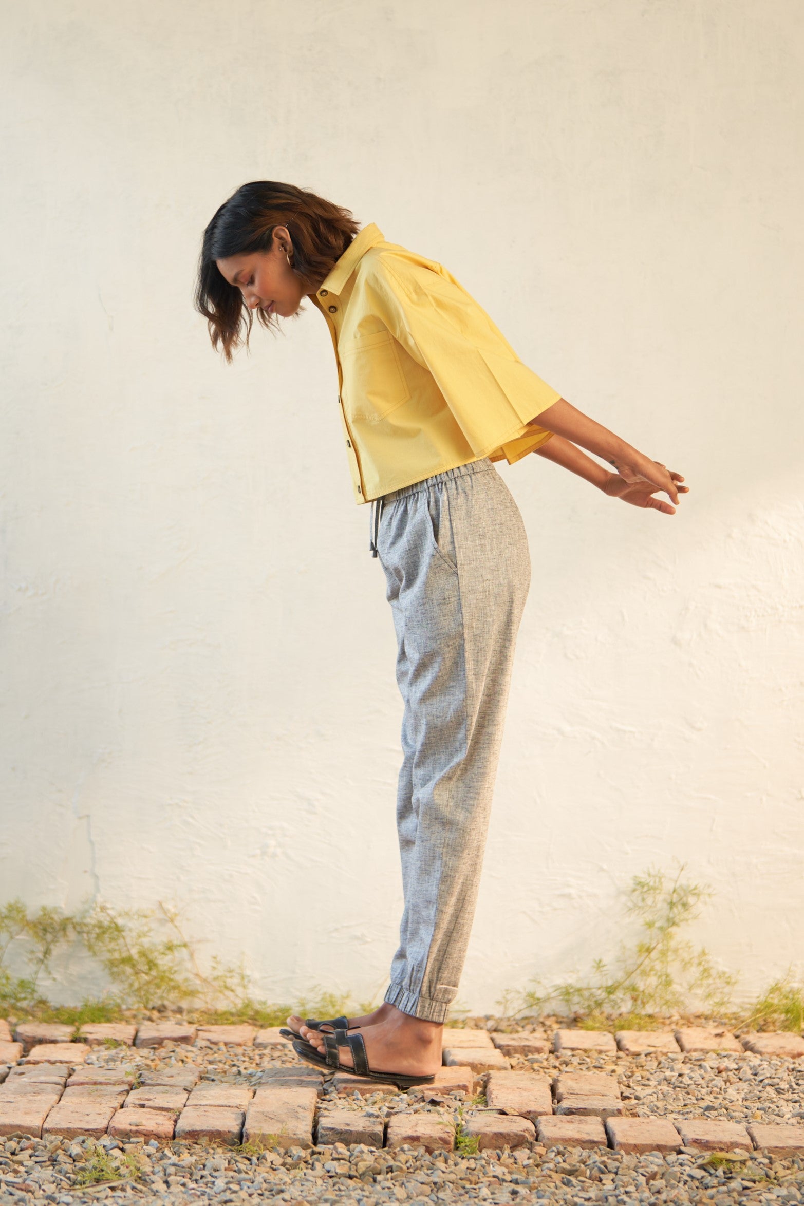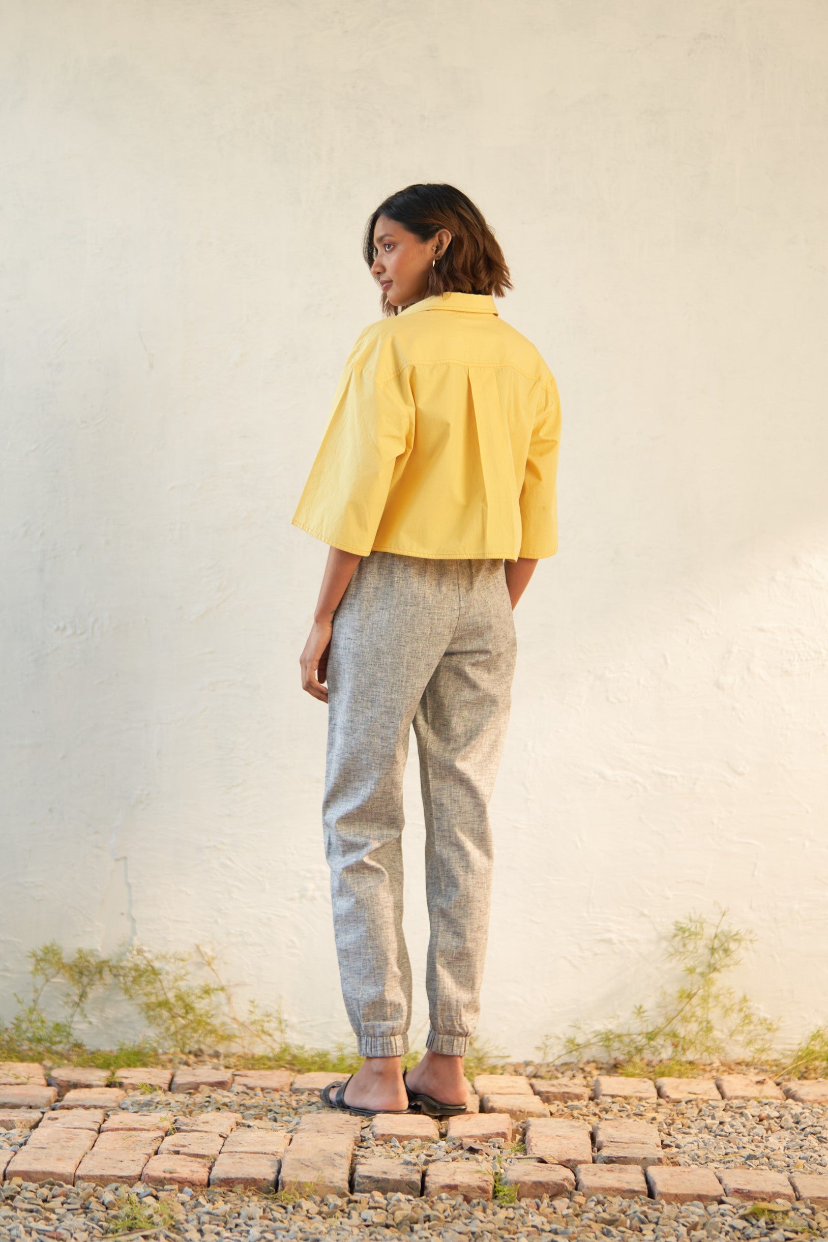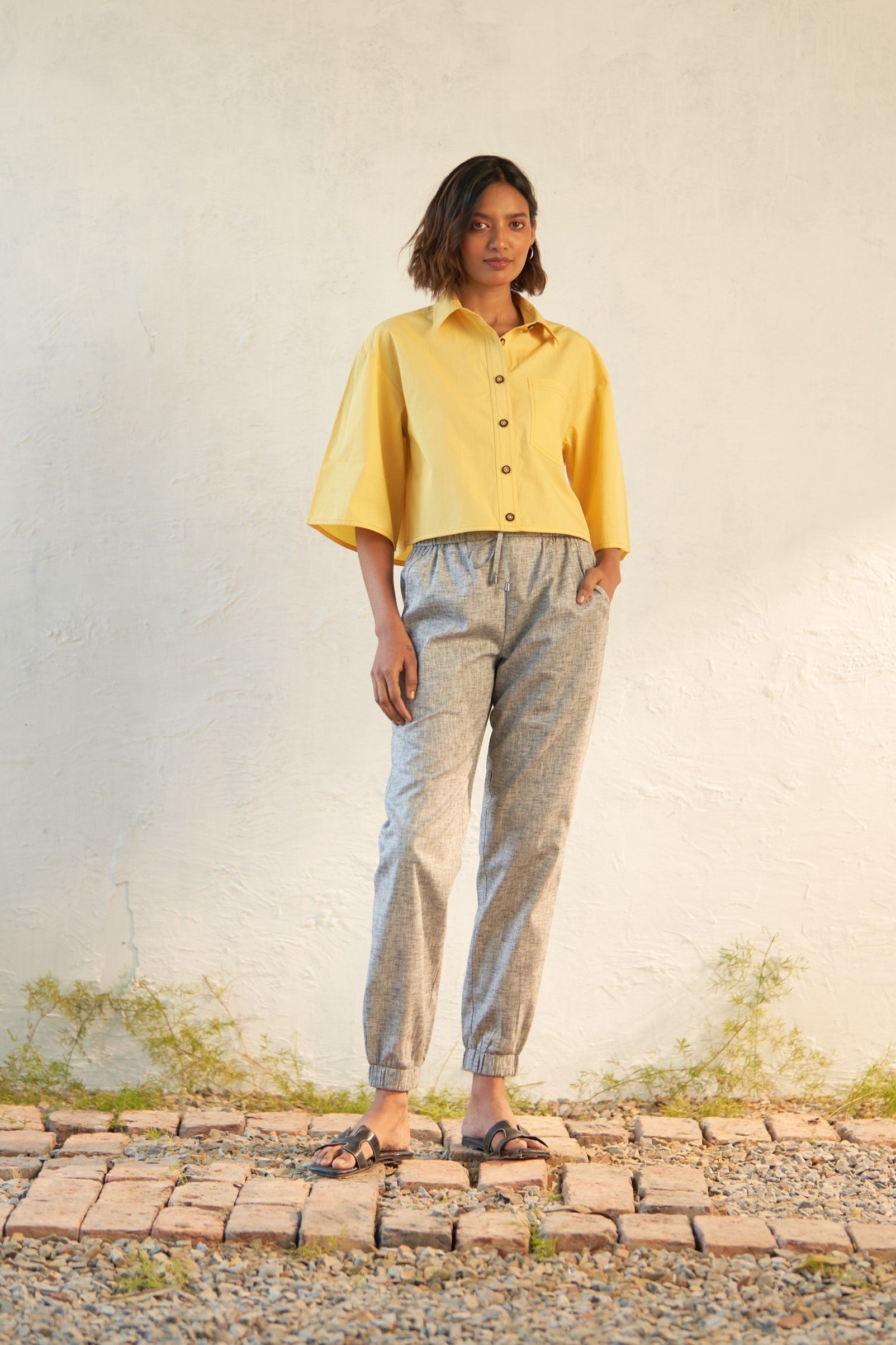 Elevate your travel style with this dynamic yellow and black combination. The top exudes a sunny lemony vibe with its boxy profile, adorned with patch pockets and striking black buttons.