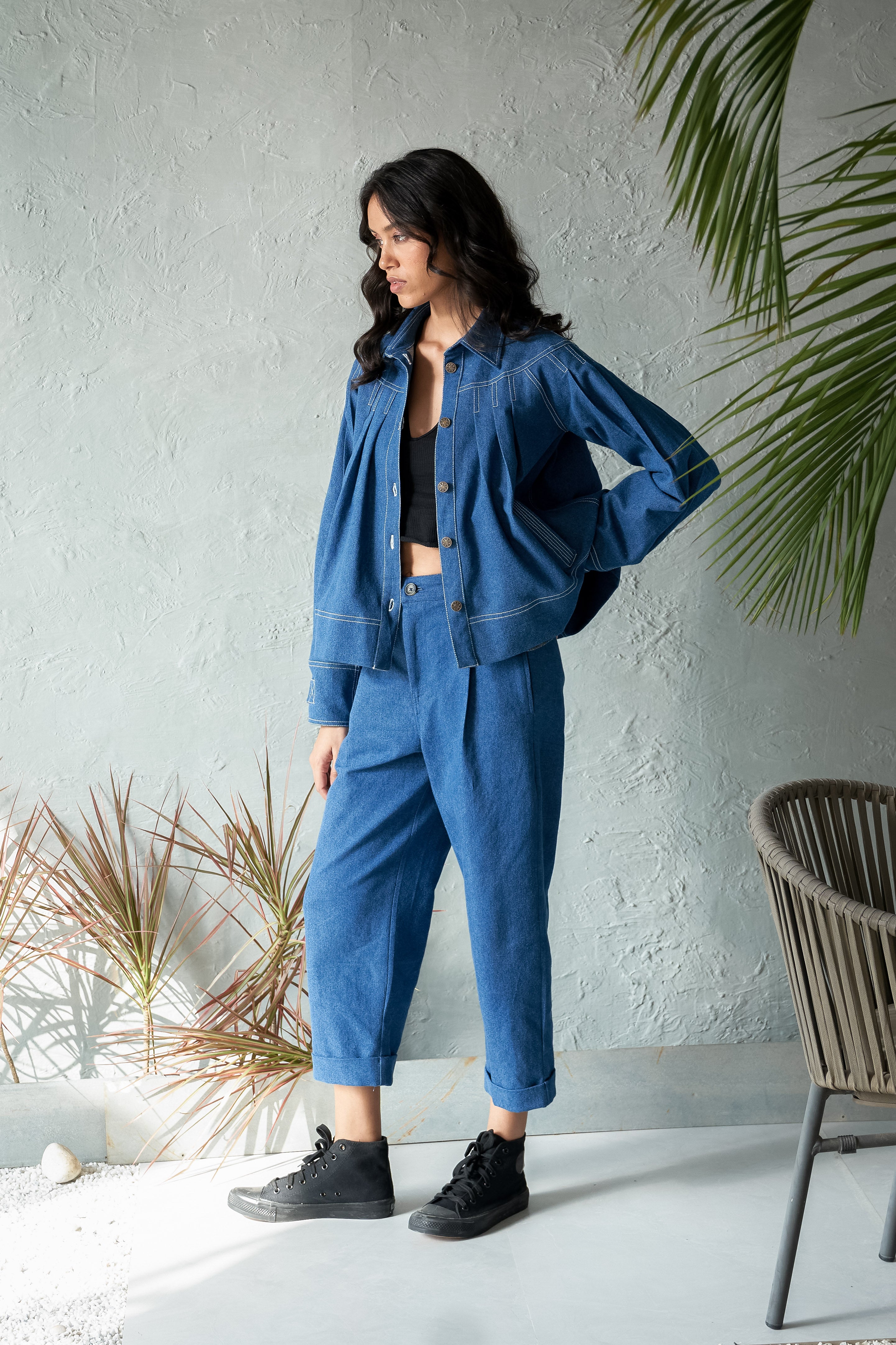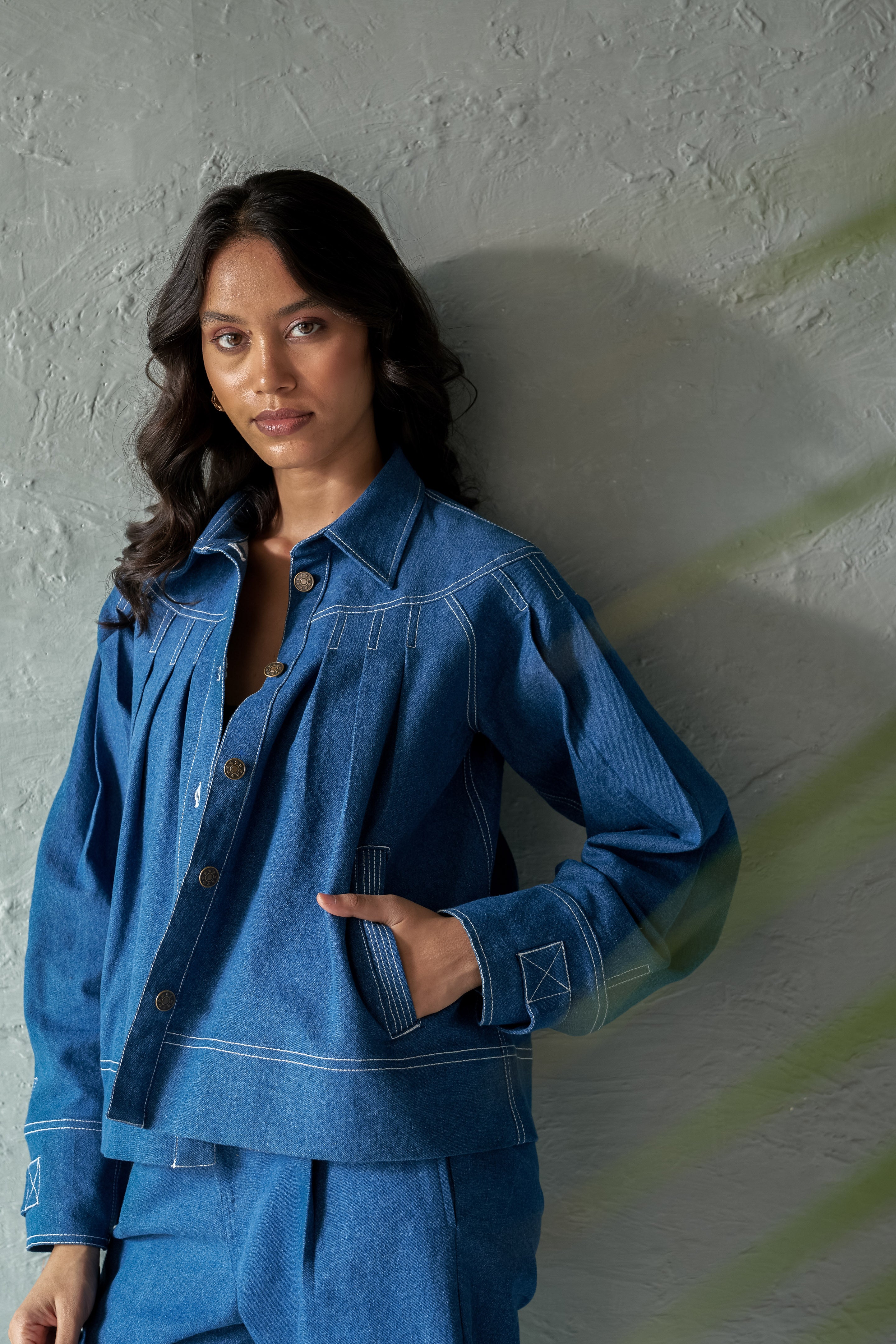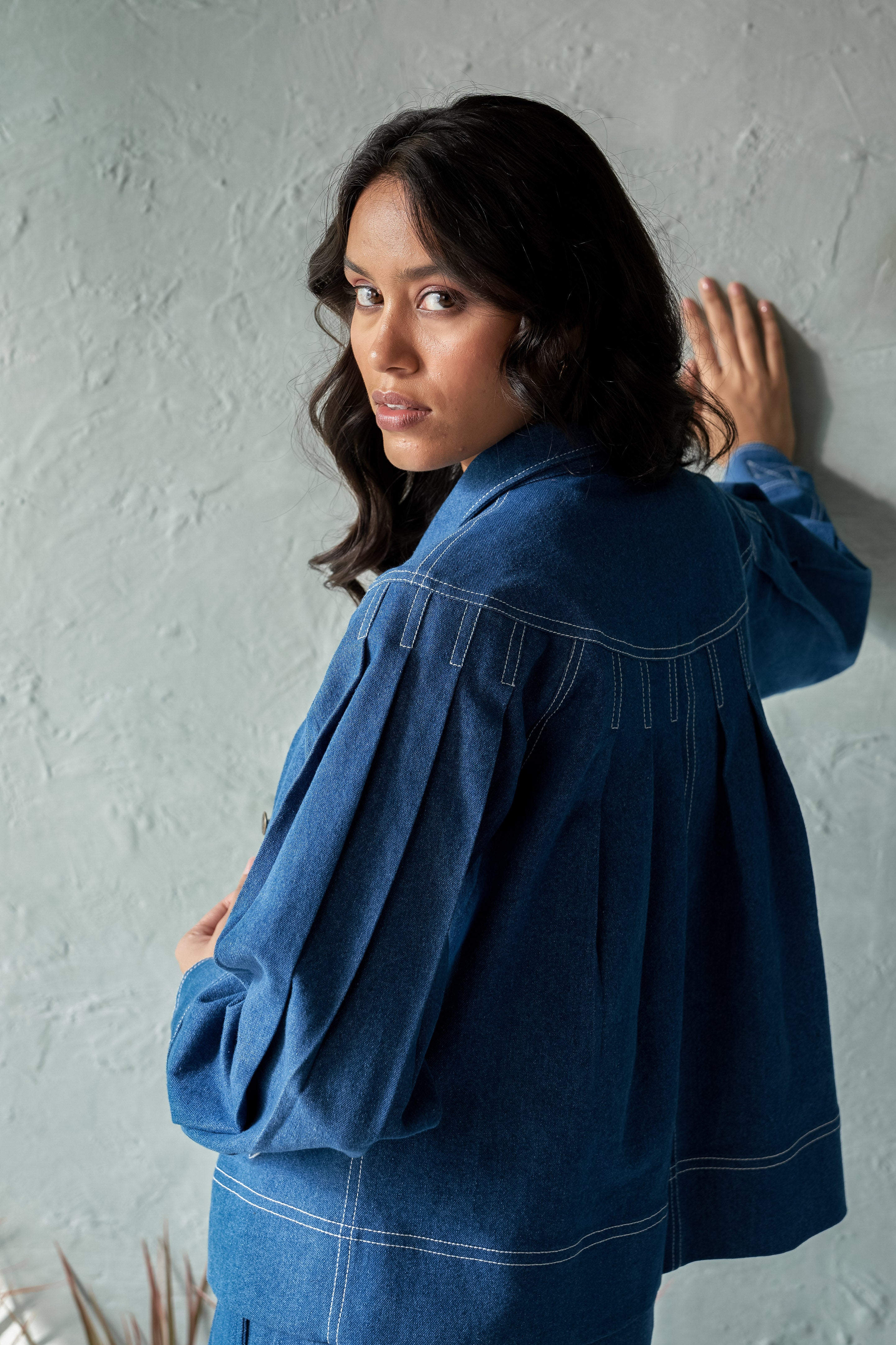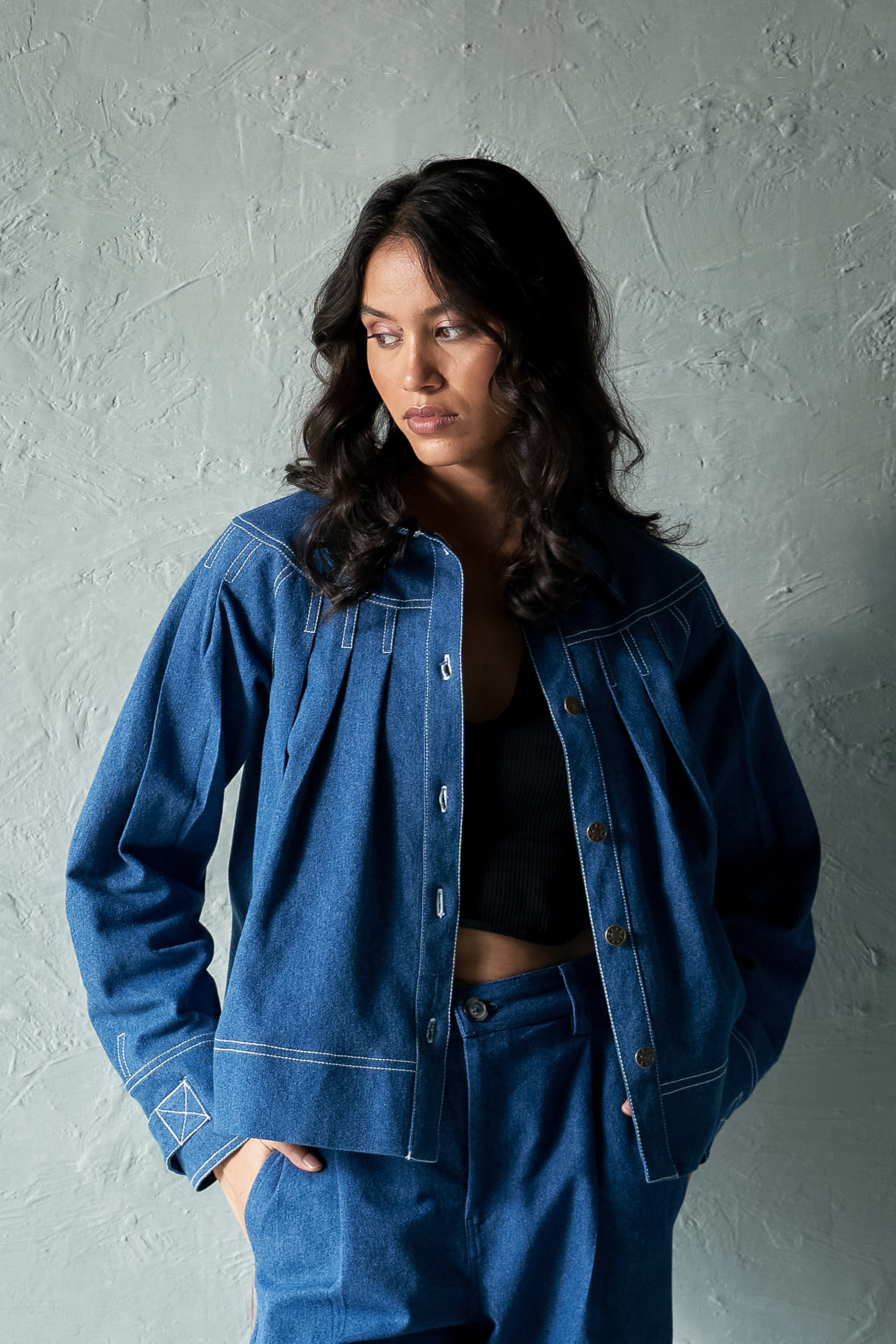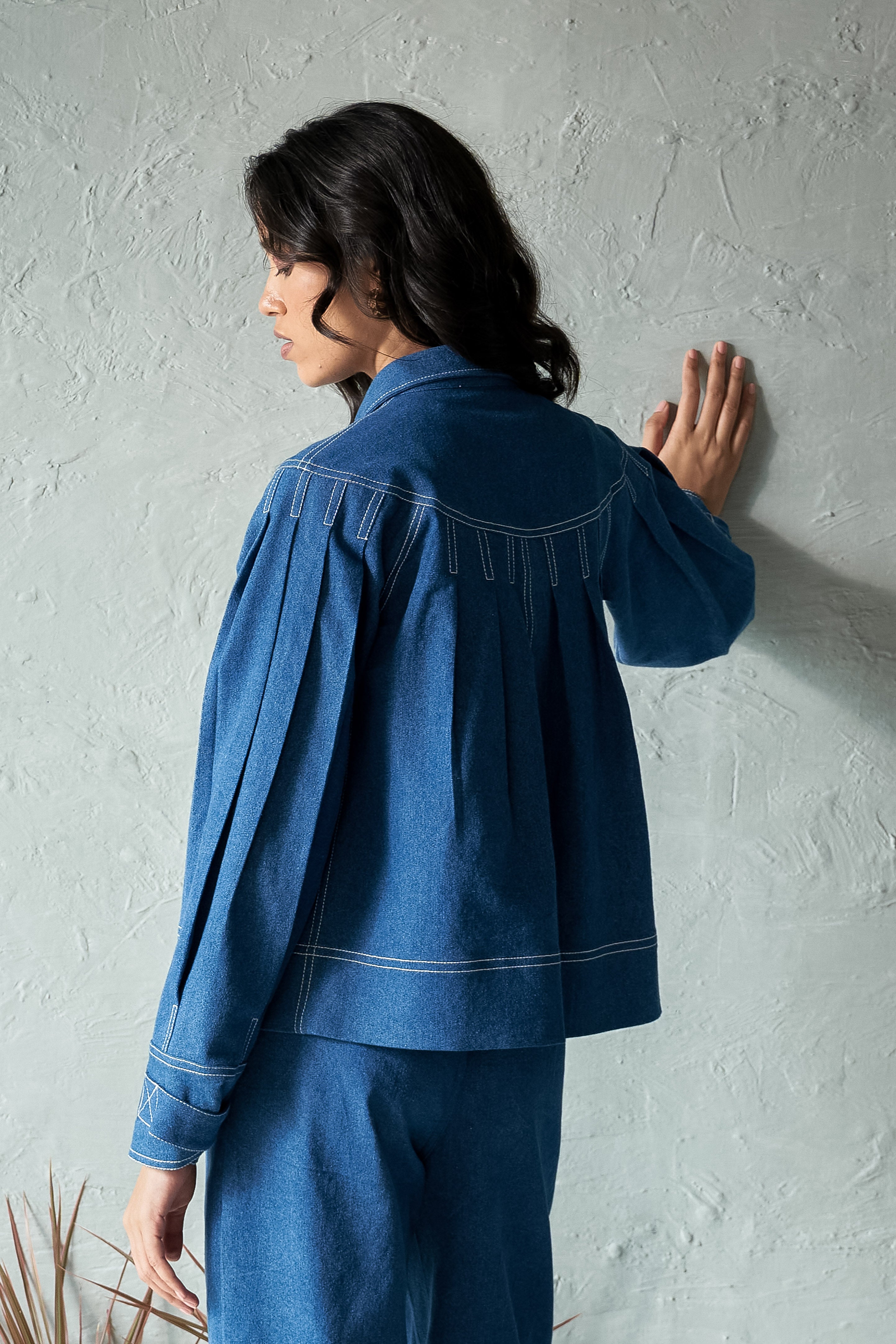 Elevate your outerwear game with our Pleated Denim Jacket with stitch detailing. Made from soft medium-weight 100% cotton denim. This stylish jacket features unique pleating that adds texture and dimension to the classic denim look. The intricate stitch detailing enhances the design, giving it a modern, tailored feel.