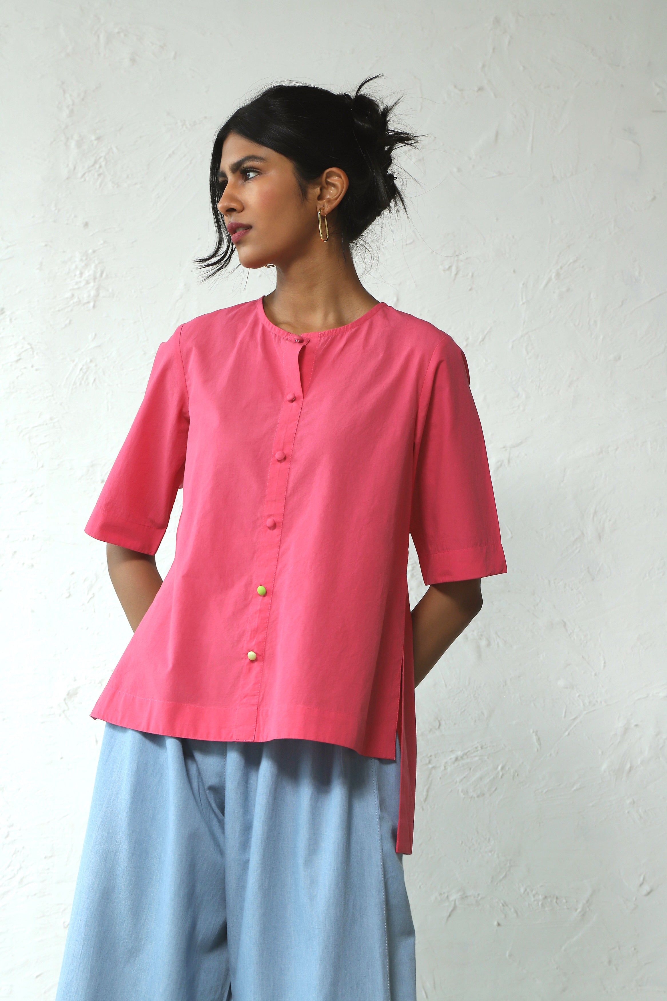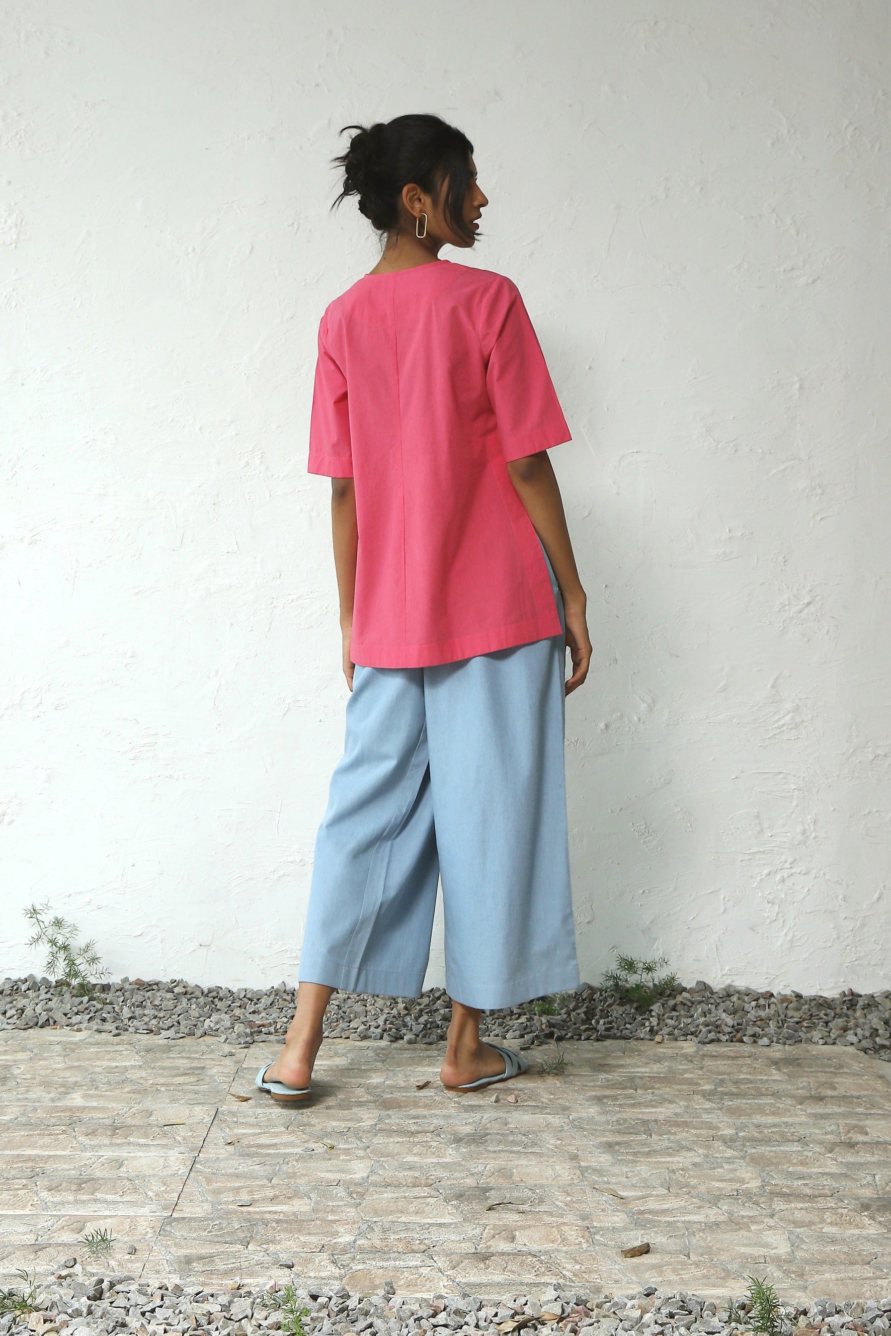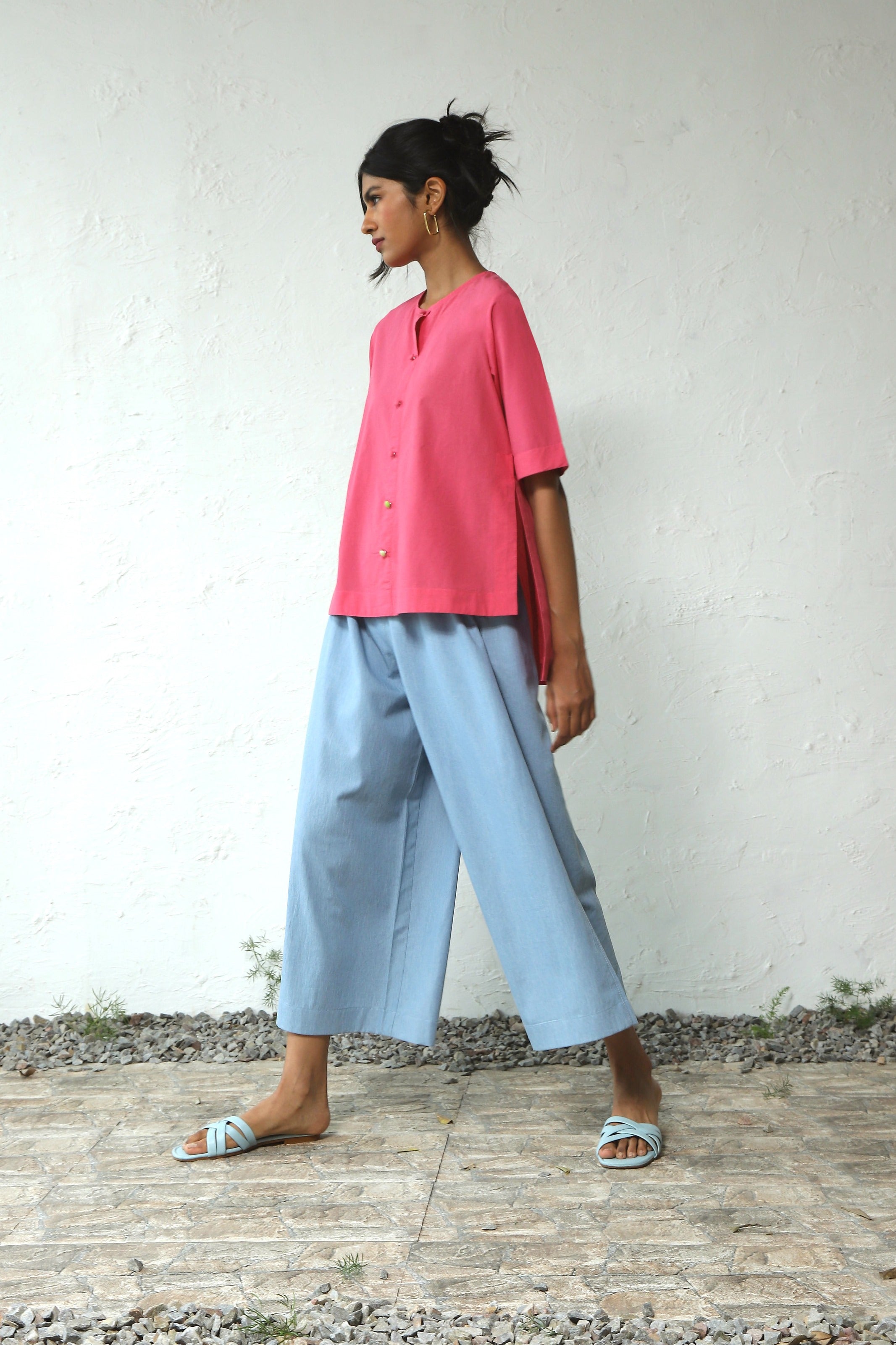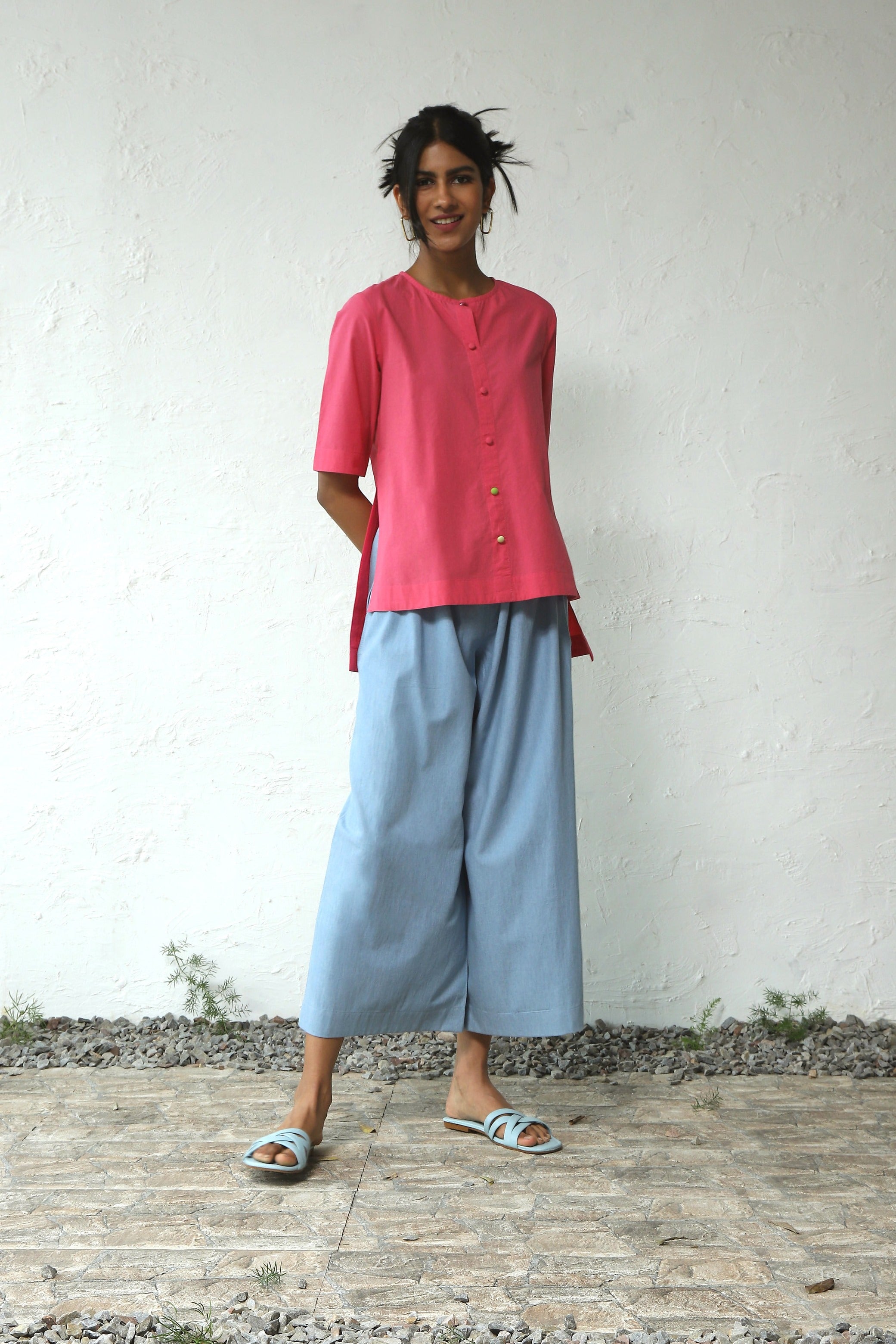 Embrace vibrant hues and unleash your playful spirit with our candy pop co-ord set. The tiered hem top, made from crisp cotton poplin, features a round neckline and unique dome fabric buttons for added dimension. Contrast of yellow and lime green buttons adds to the interesting coor play. Accompanied by airy denim soft cotton pant with wide full-length legs and a ruffled elasticated band.