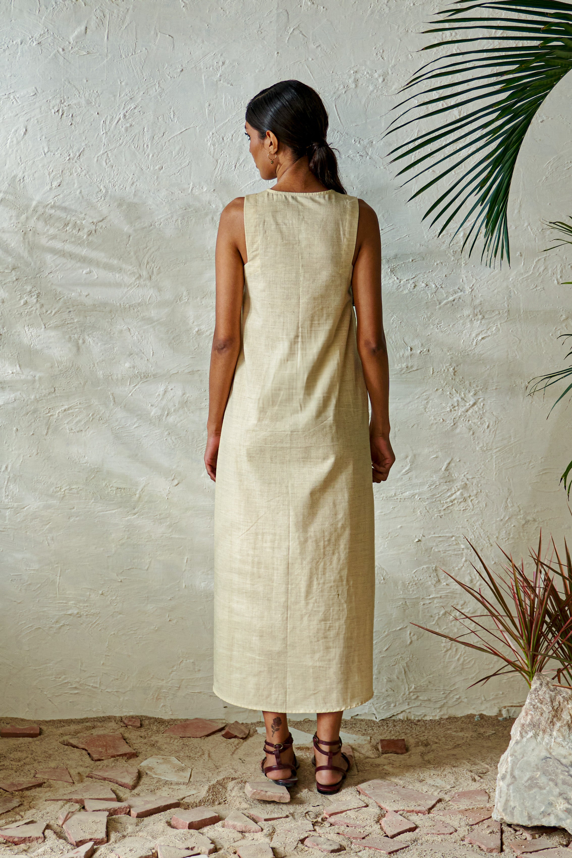 This V-neck sleeveless dress is a chic and versatile addition to any wardrobe, featuring an intricately smocked pattern on the front panel for a stylish textured detail. The smocking adds dimension and charm to the minimalist design, while the V-neckline enhances its flattering silhouette. Lightweight and comfortable, this dress is perfect for both casual and semi-formal occasions, offering a blend of modern elegance and ease. Dress it up with statement accessories or keep it simple for an effortlessly stylish look.