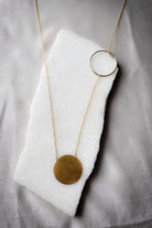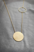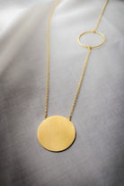 A long neck chain with same size placement circles, design symbolic of bonds and duality in gold finish.
