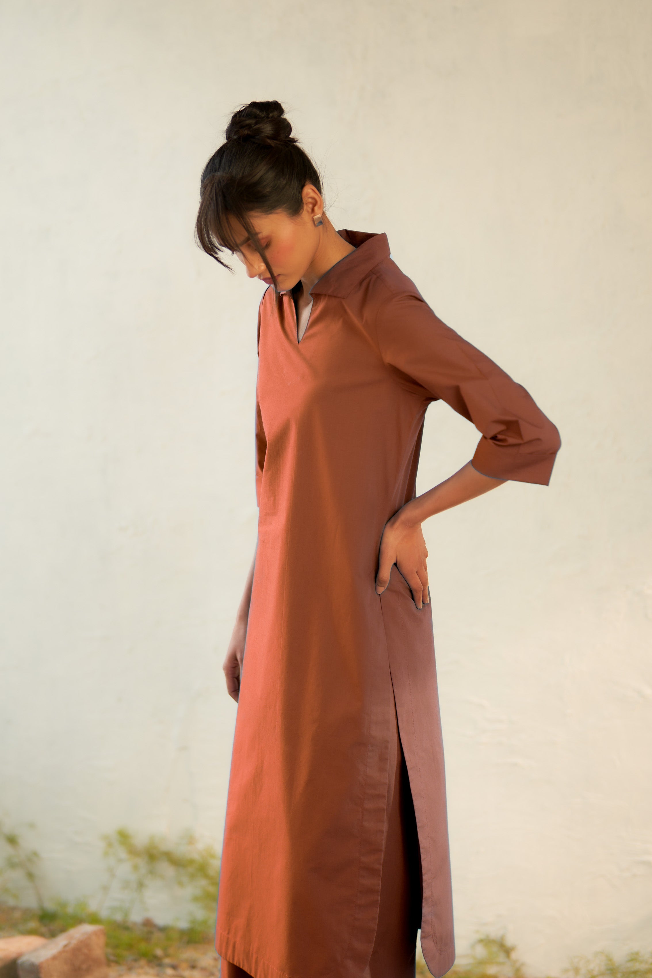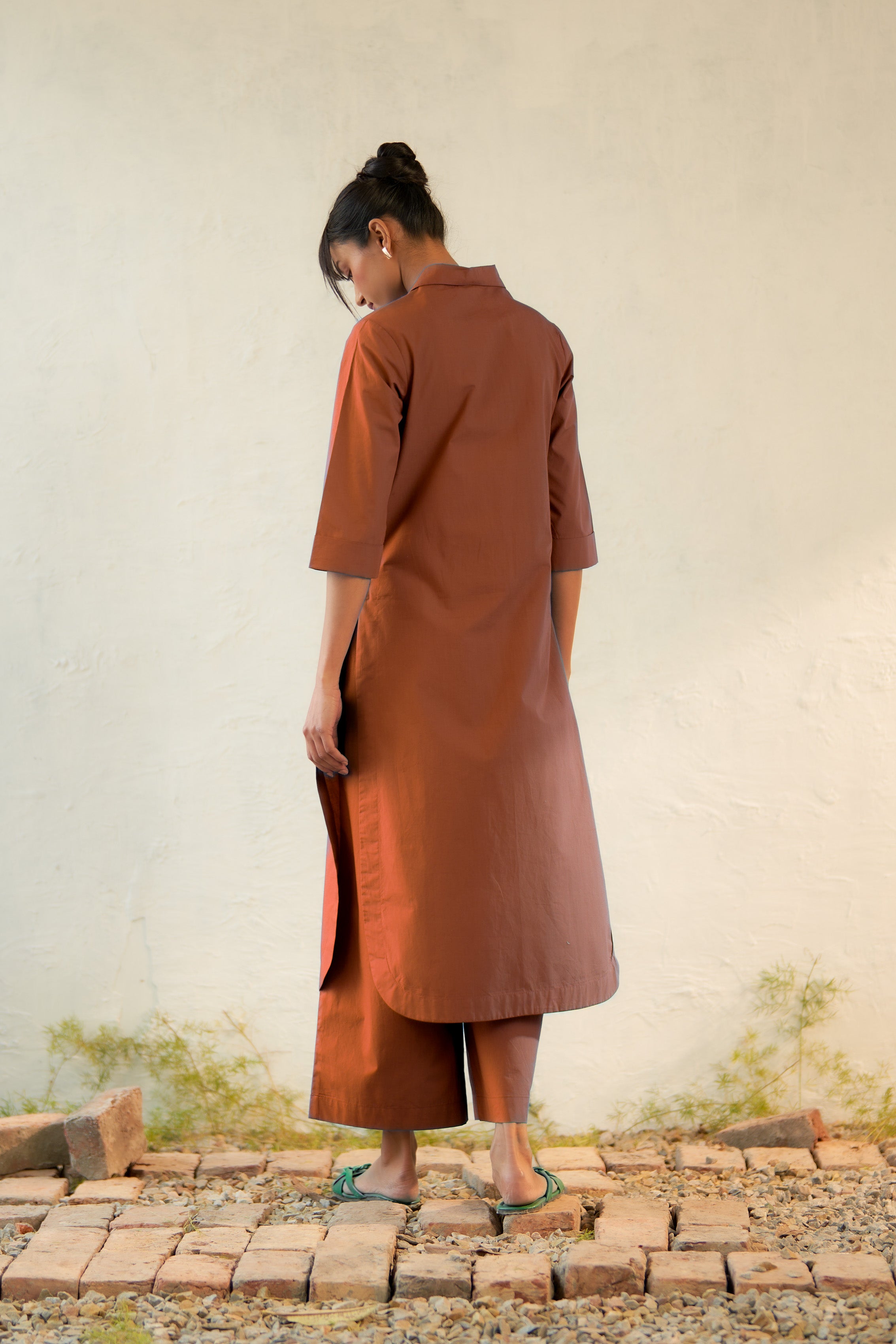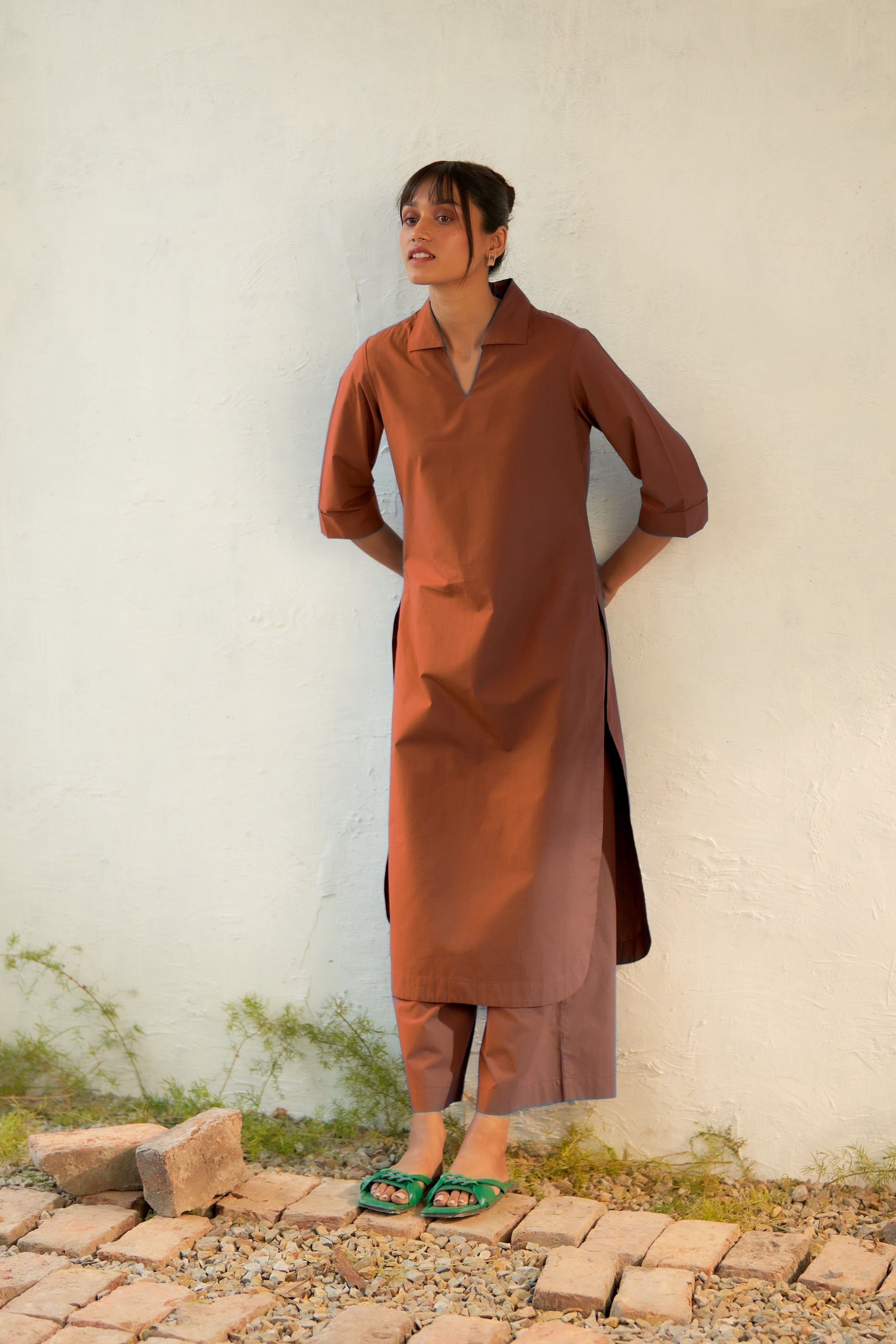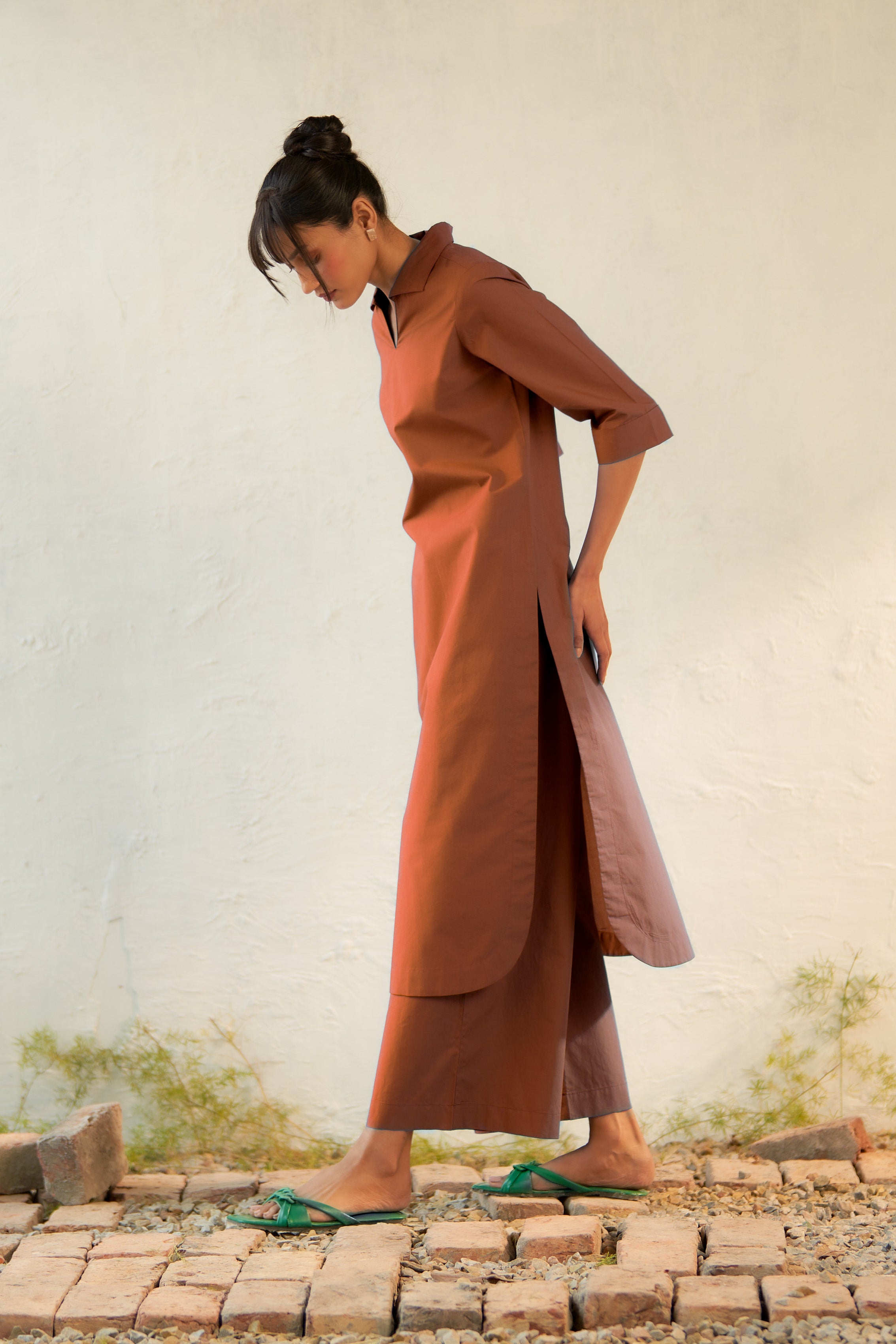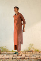 A soft neutral that feels like a quiet delight, the biscotti-brown kurta drapes beautifully in lightweight cotton. The V-neck collar frames the look with subtle structure, and the flowing panels keep it breathable and relaxed. Completed with flared pants - elasticated and has a drawstring, the ensemble offers modern ease with a touch of earthy charm—an effortless way to elevate your everyday.