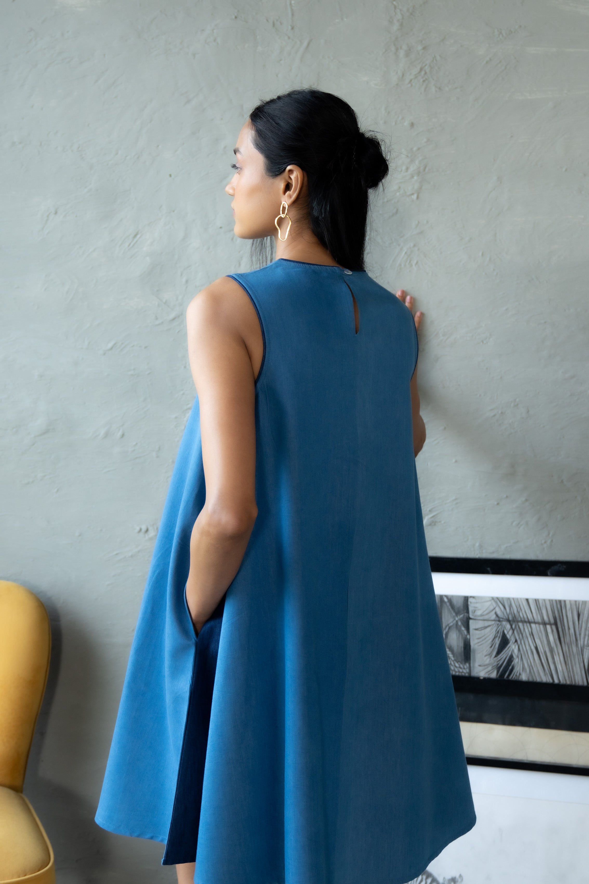 Dress reimagines denim with a playful twist. Crafted in soft cotton denim, this short dress blends comfort with effortless style. The interplay of mid- and dark-denim shades is highlighted through contrast side panels, while fine piping along the neckline and armholes adds a clean, structured finish. Perfect for casual days, city strolls, or relaxed evenings, it brings an easy charm to your everyday wardrobe.