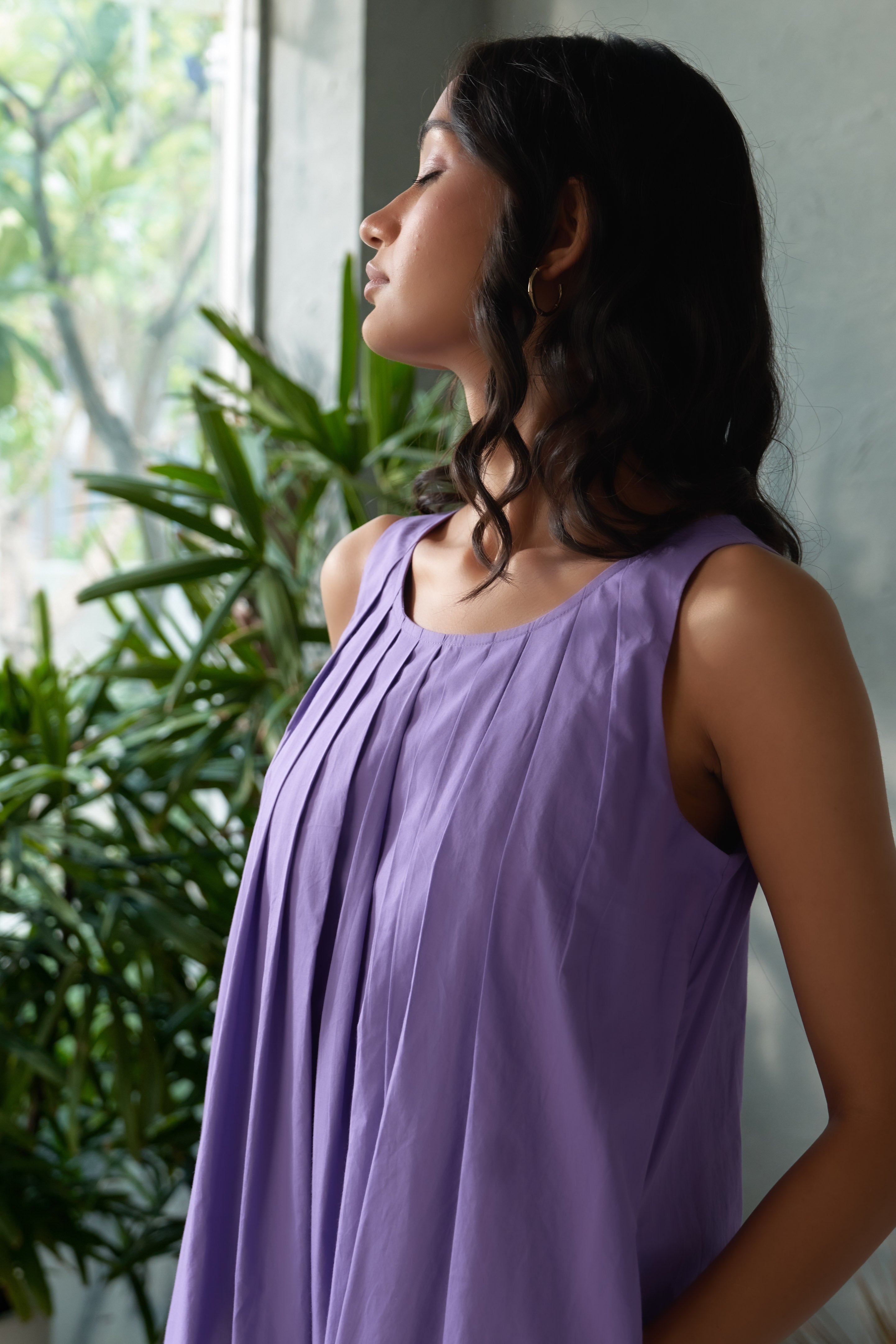 Elevate your wardrobe with our sophisticated lavender midi dress, designed with a U scoop neck and distinctive box pleats in the front for a structured yet elegant look. The overlapping back panel with a keyhole detail adds a touch of modern chic and allure. Crafted from high-quality fabric, this dress offers a flattering silhouette that gracefully falls to midi length, perfect for a variety of occasions. Whether for a formal event or a stylish evening out, this versatile dress combines timeless elegance with contemporary design elements.
