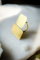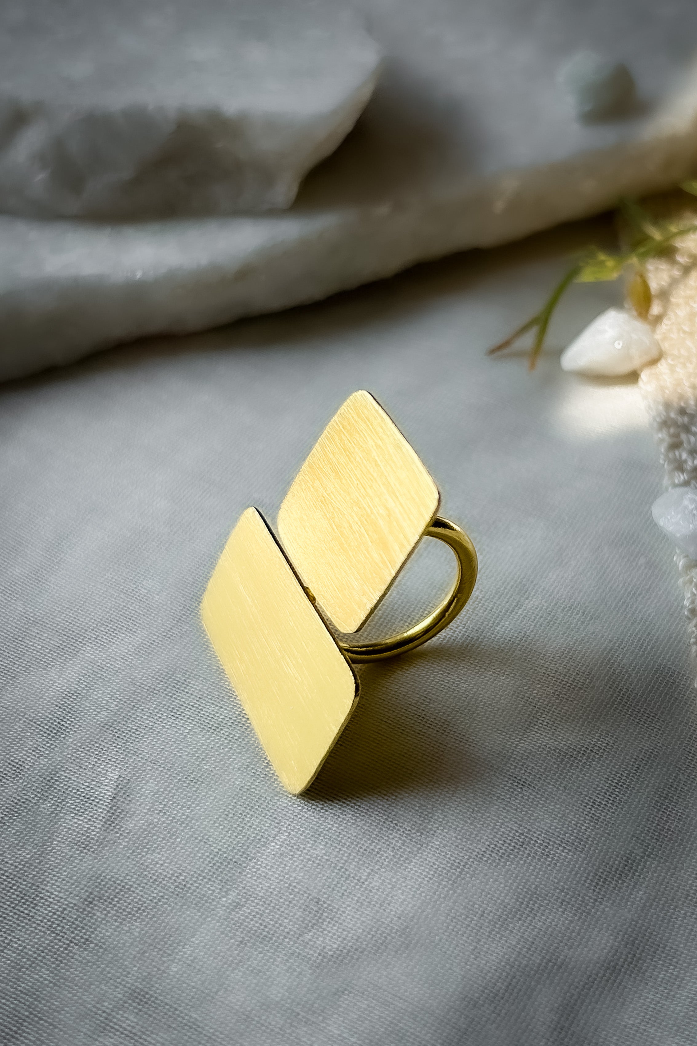 Duality ring symbolizing balance of big & small, strength & subtlety, handcrafted in brass with gold finish.