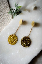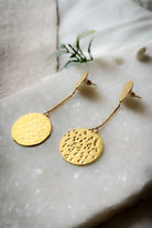 A pair of celestial earrings, with a small moon strung together with the earth, handcrafted in brass.