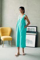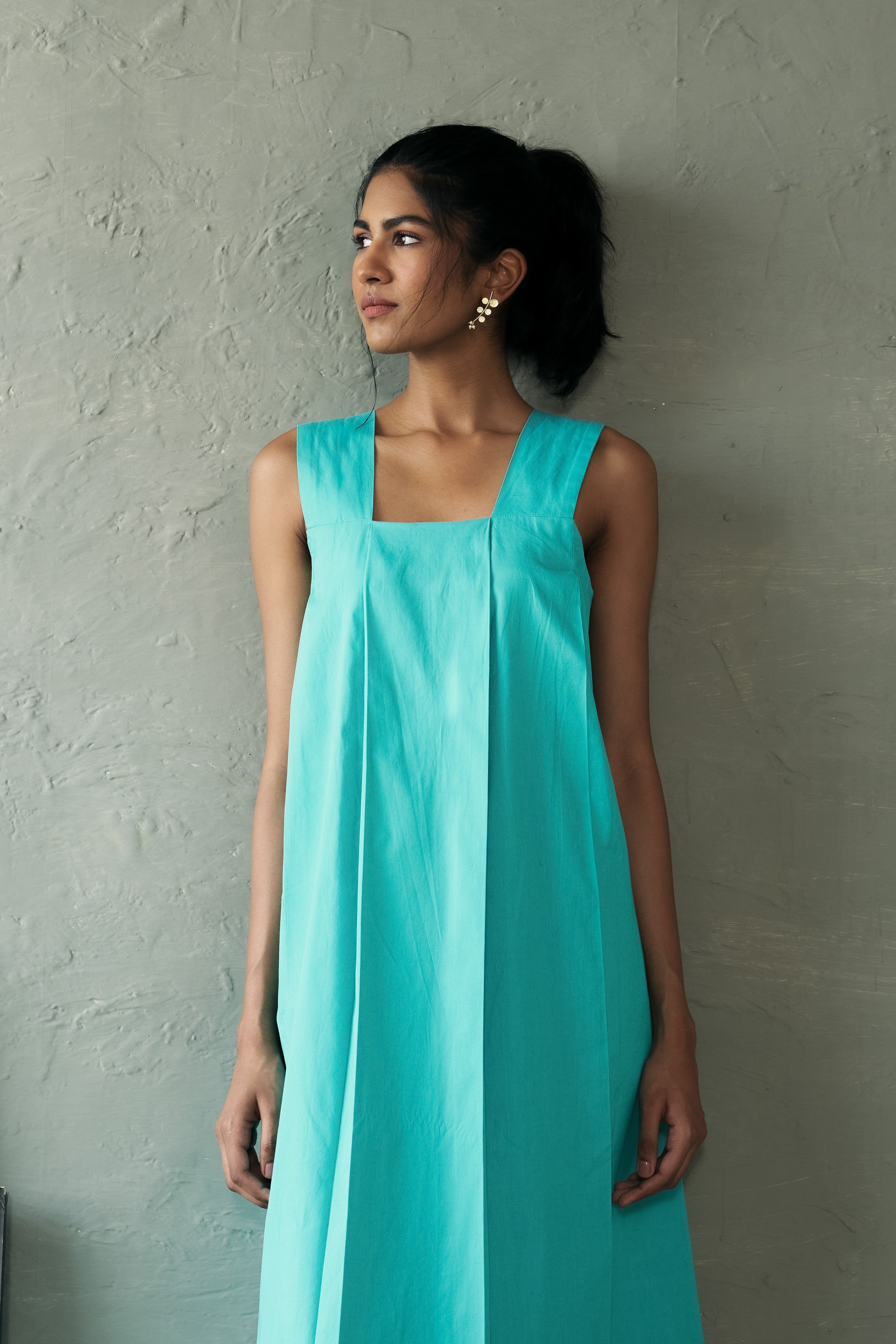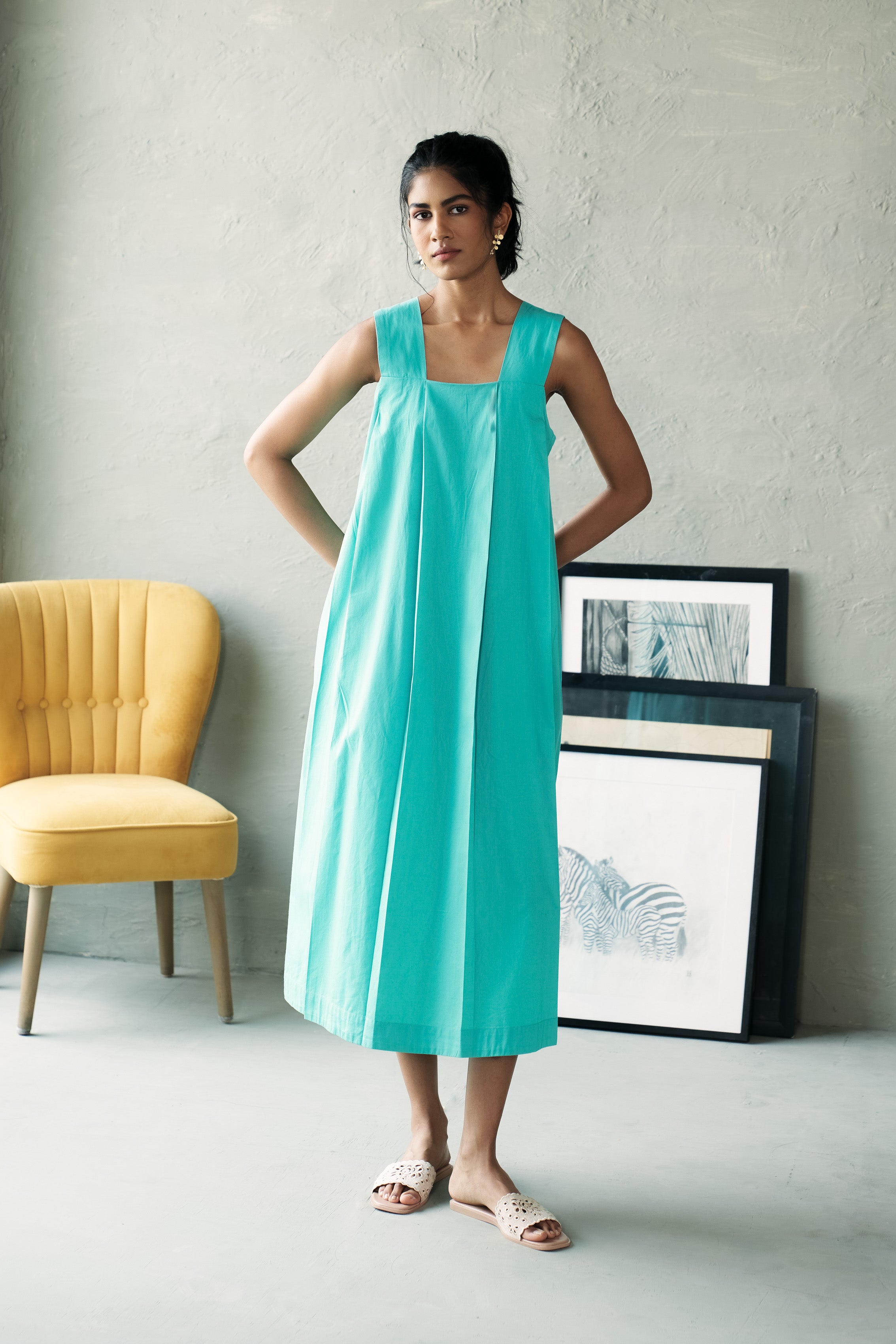 Fresh and fluid in firozi, the Firoza Dress is a breezy midi silhouette designed for effortless summer days. Crafted from fine cotton, it features a flattering square neckline, retro-inspired broad straps, and a center pleat that adds soft volume and graceful movement. Easy yet elevated, this versatile dress transitions seamlessly from daytime outings to relaxed evening gatherings.