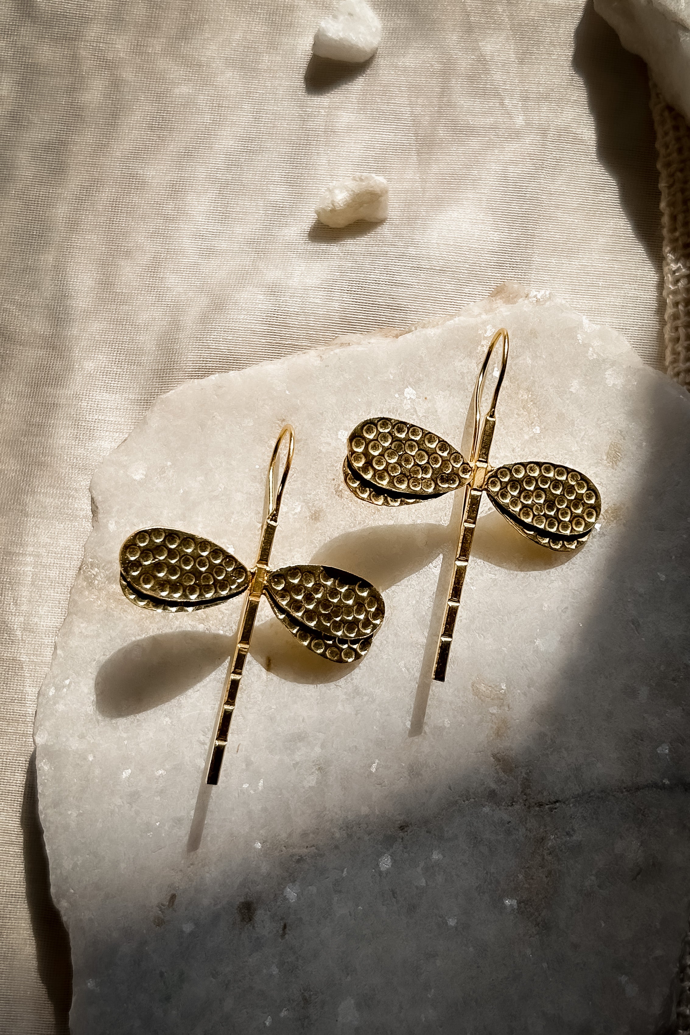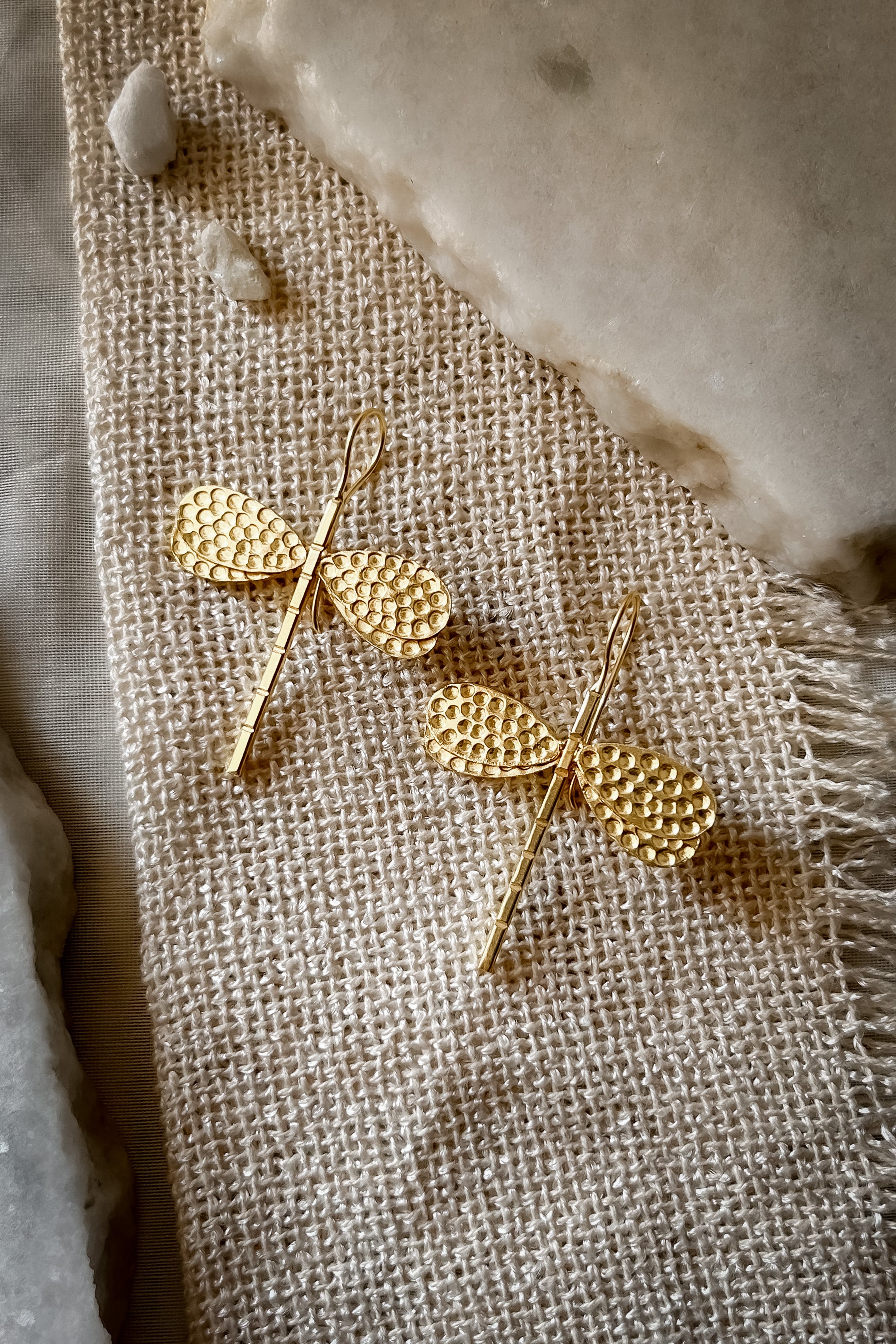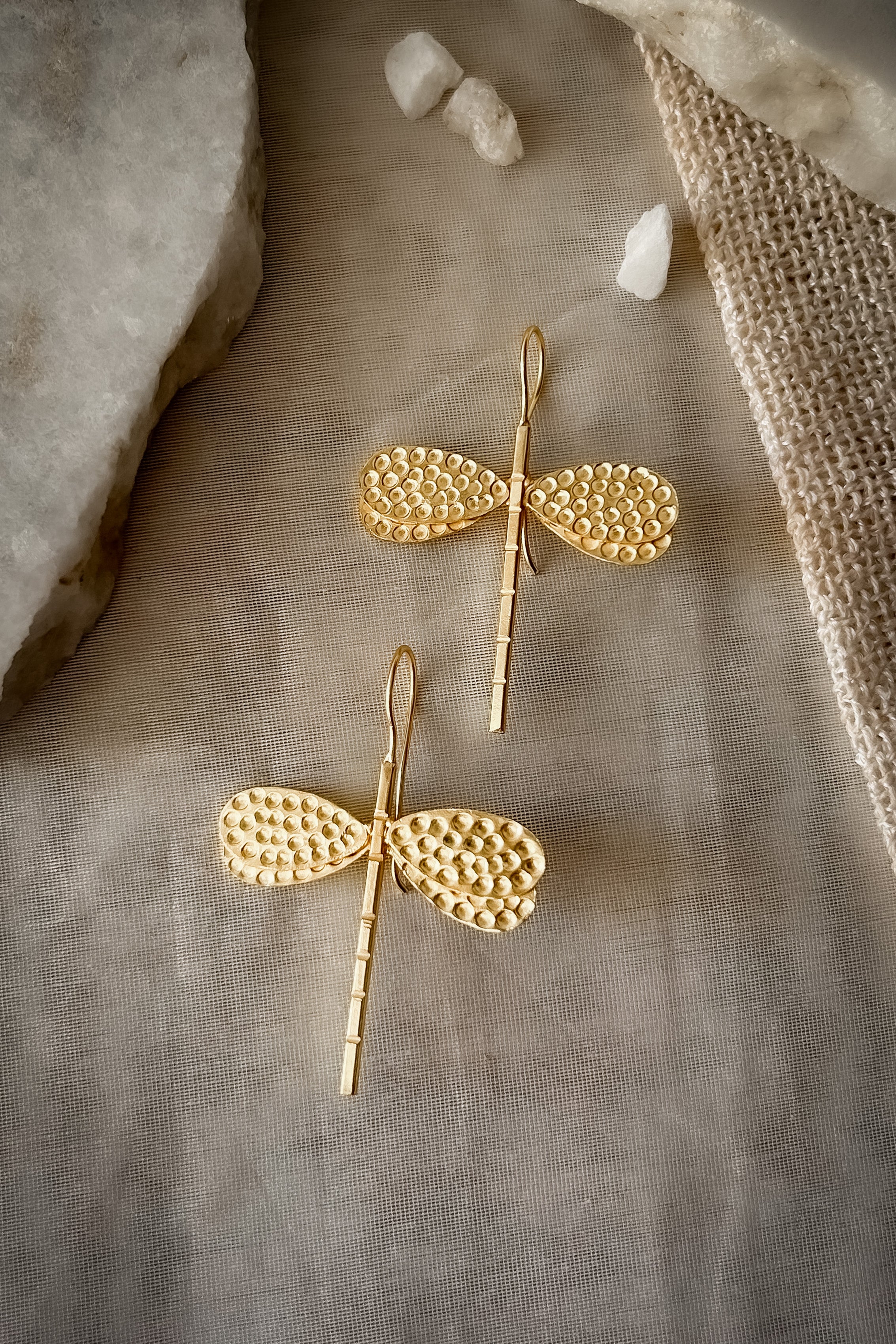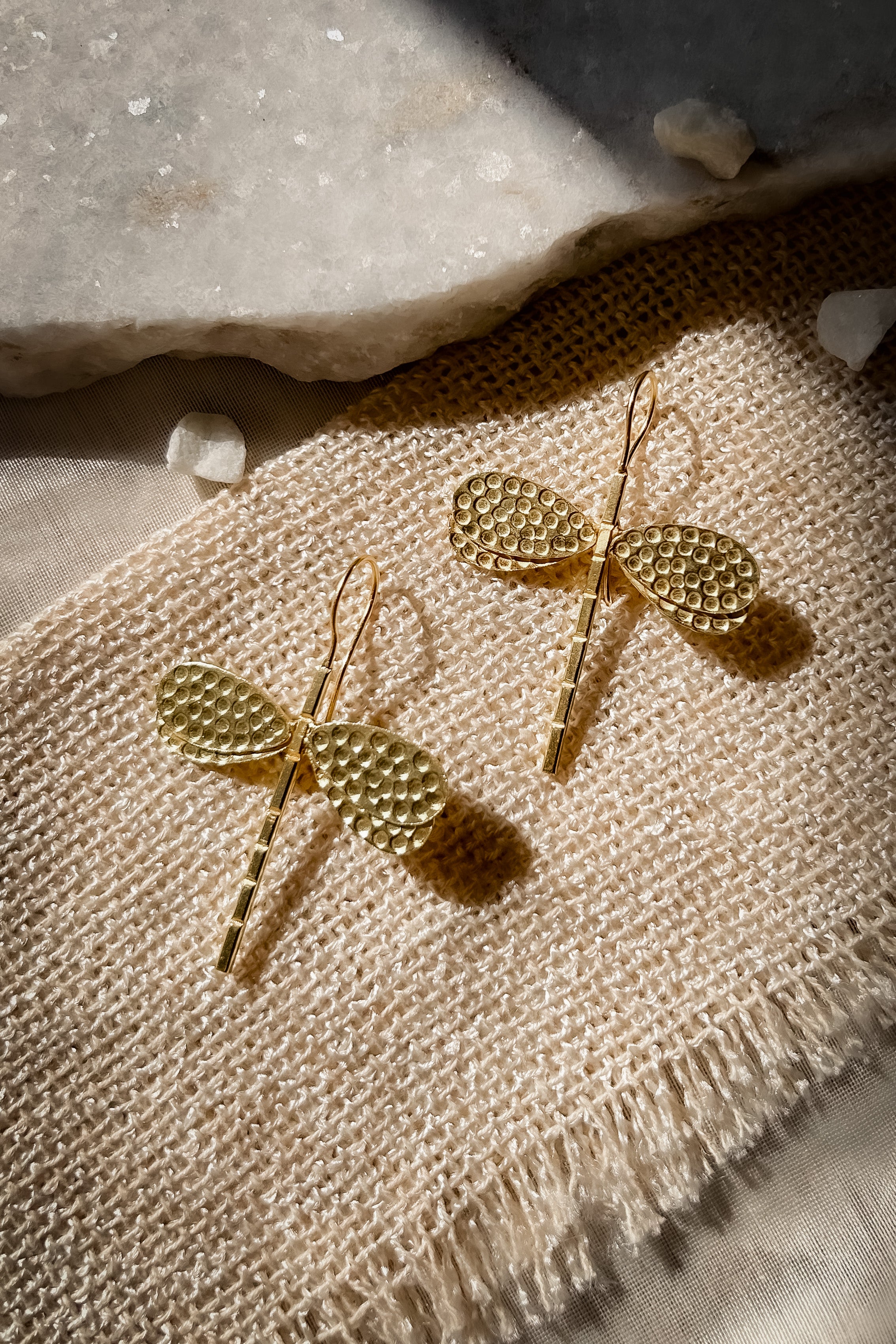 A pair of statement fly high dragonfly earrings handcrafted in brass.