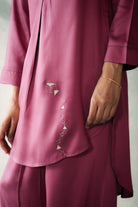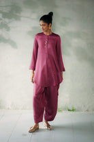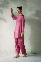 The Kite Fly Hi-Low Kurta Set blends timeless elegance with a modern silhouette and a delicate handembroidery. Paired with coordinated loose-fit tulip pants that taper delicately at the ankle, the belt is secured with a drawstring, this ensemble offers comfort and sophistication in equal measure. Perfect for festive occasions or elegant gatherings, it’s a style that stands out without trying too hard.