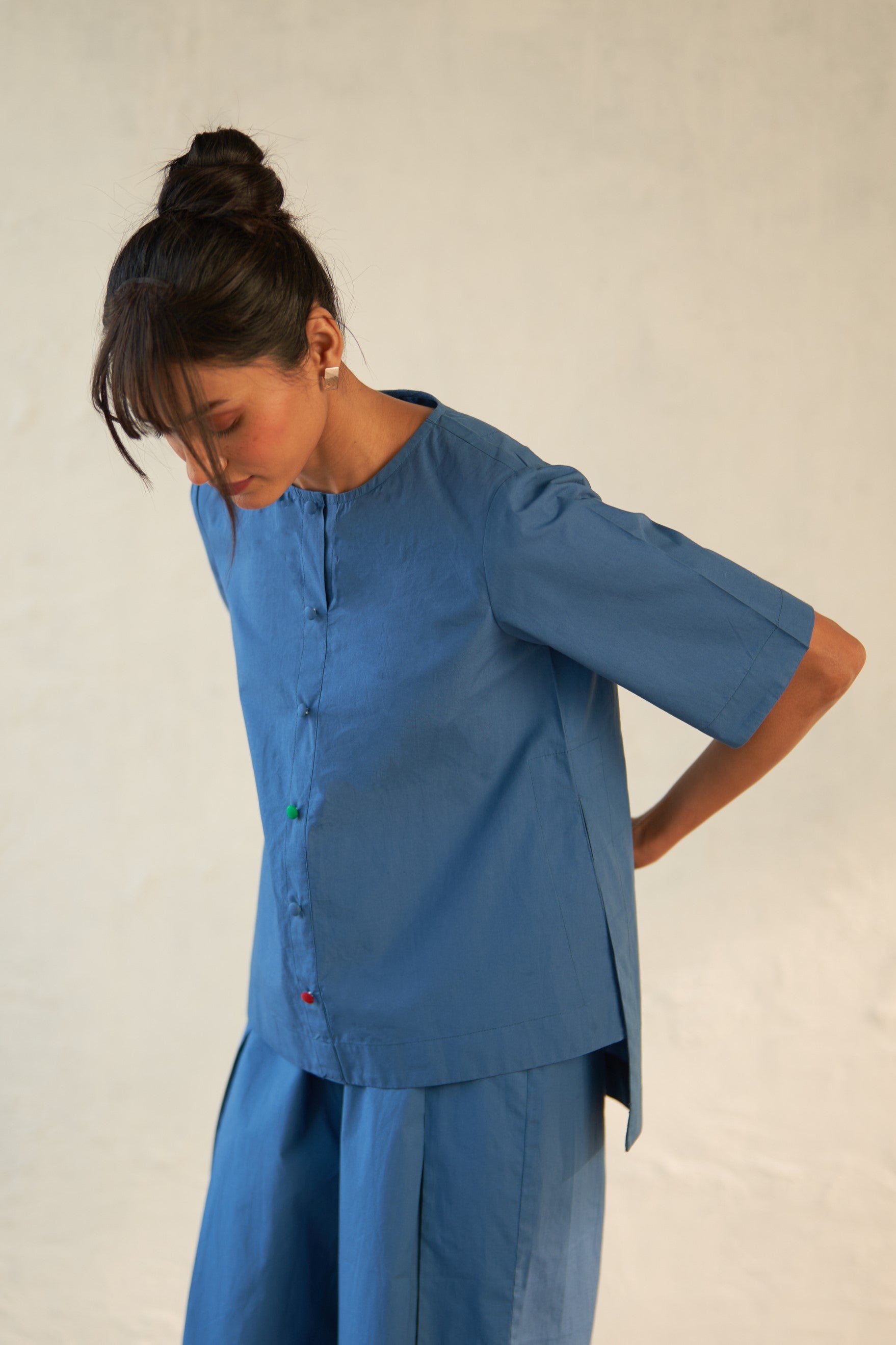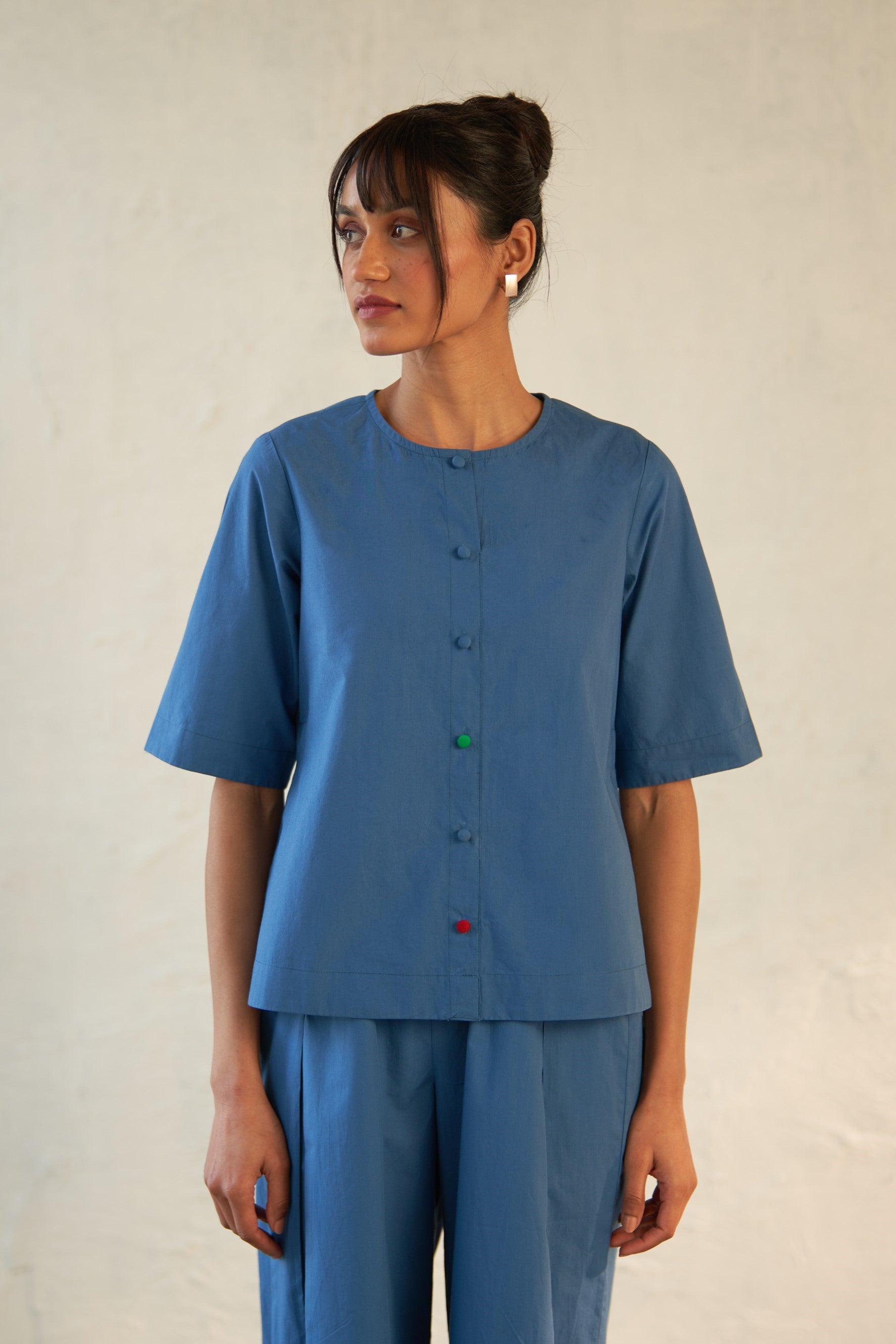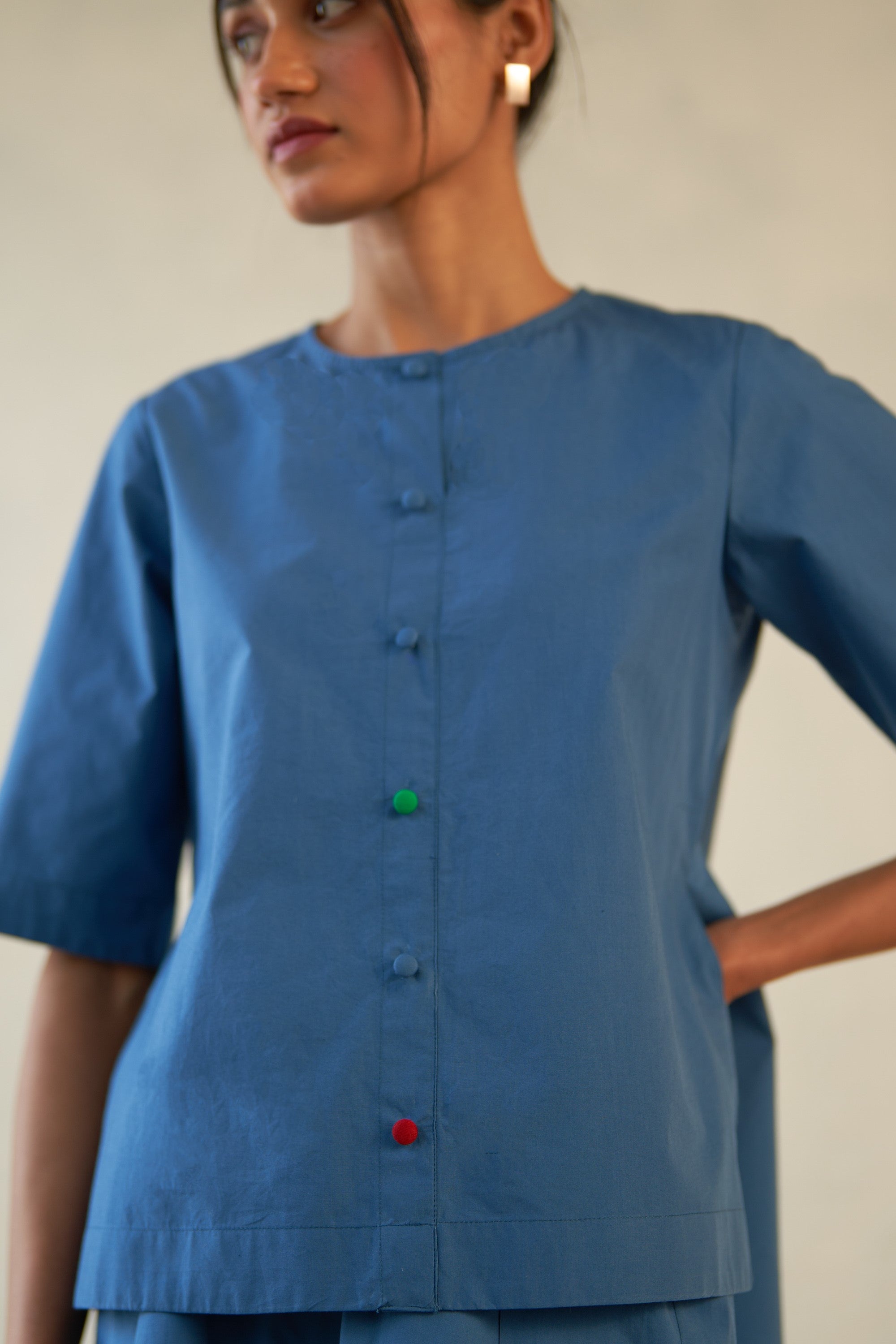 The versatility of our Marina top, expertly fashioned from premium poplin cotton. From radiant days to enchanting evenings, this piece effortlessly adapts with its round neckline and dome fabric buttons, elevating the silhouette with subtle allure. Vibrant contrasting buttons add a touch of flair to the ensemble.
