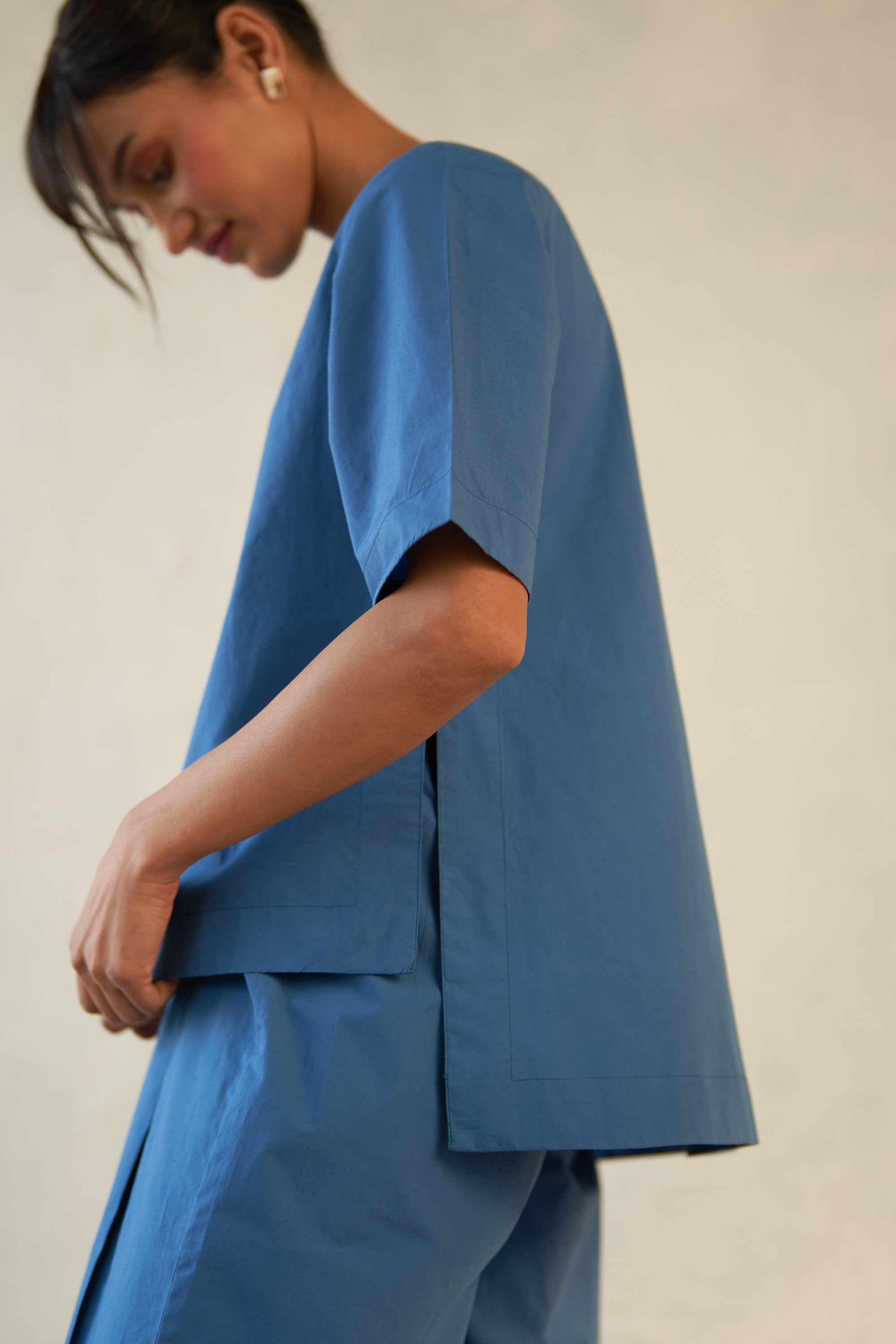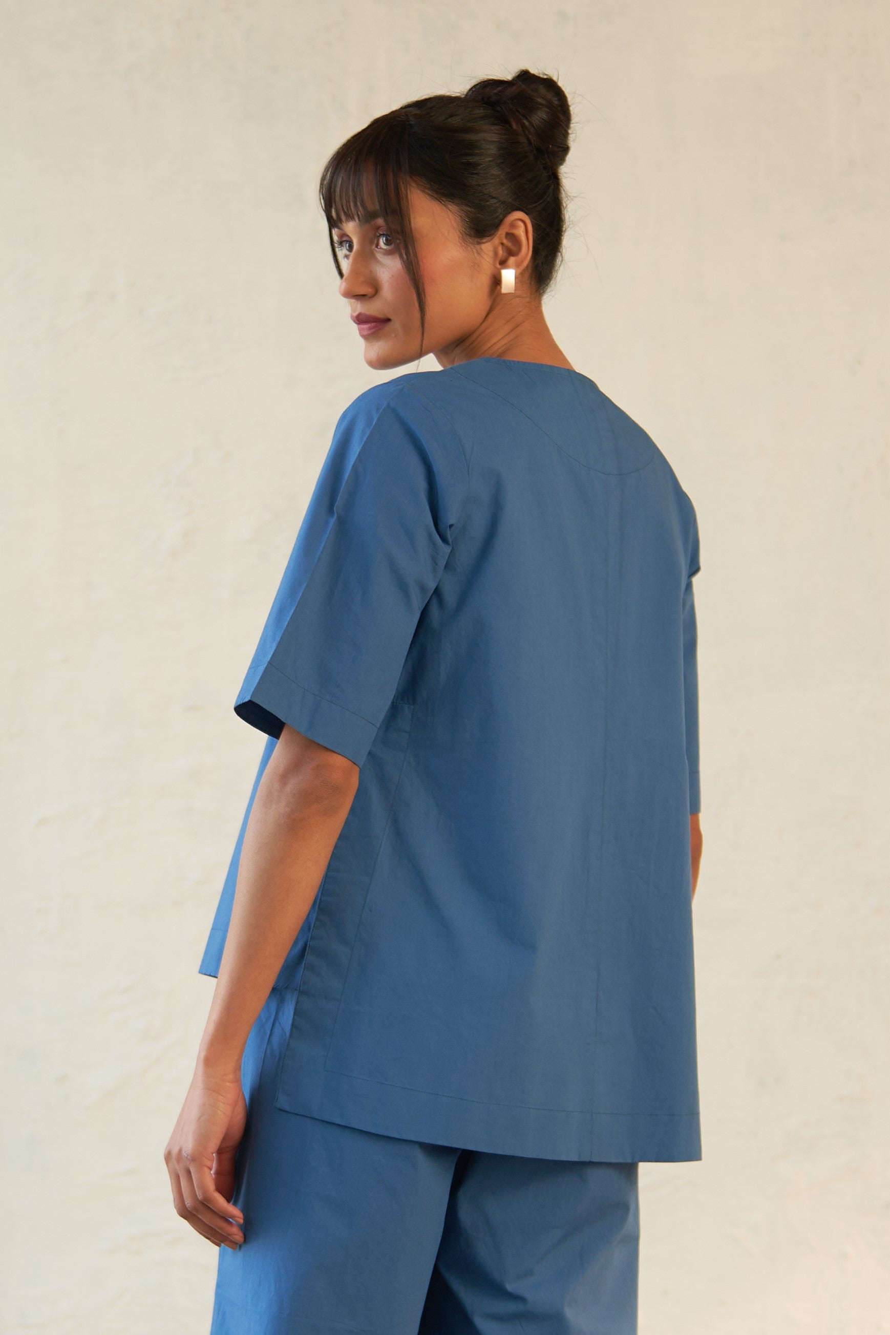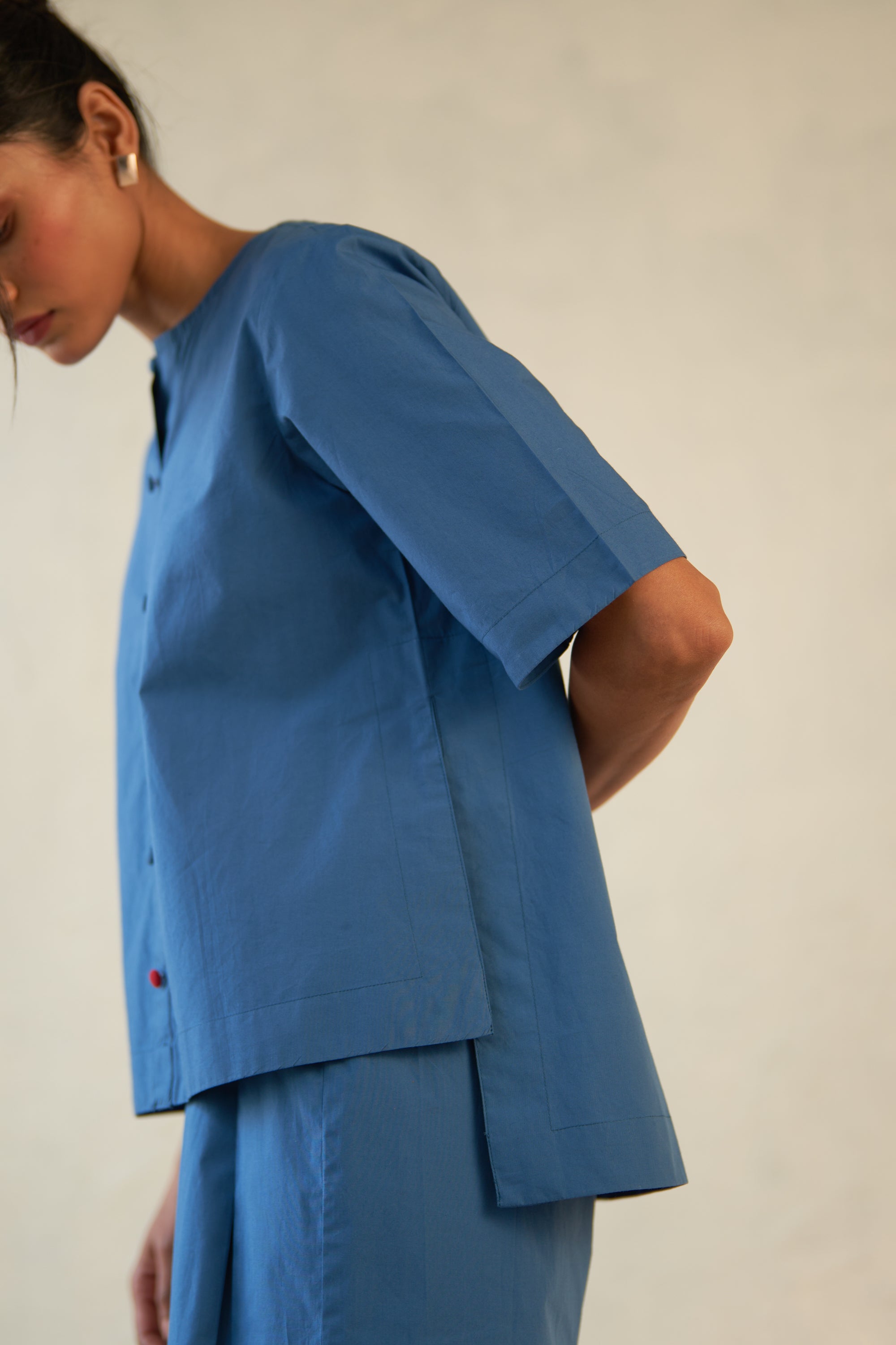 The versatility of our Marina top, expertly fashioned from premium poplin cotton. From radiant days to enchanting evenings, this piece effortlessly adapts with its round neckline and dome fabric buttons, elevating the silhouette with subtle allure. Vibrant contrasting buttons add a touch of flair to the ensemble.