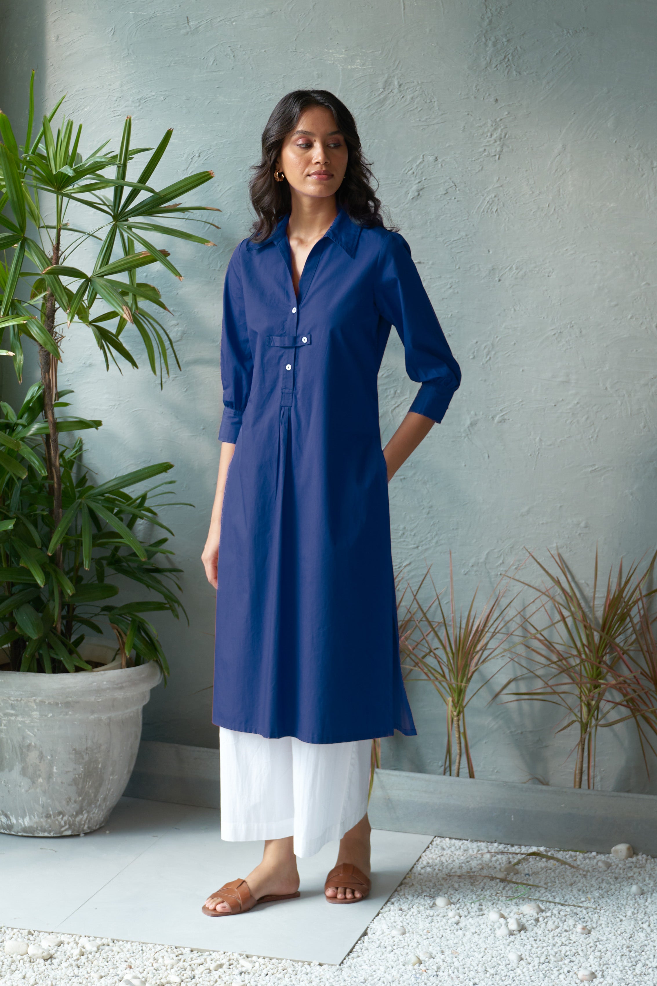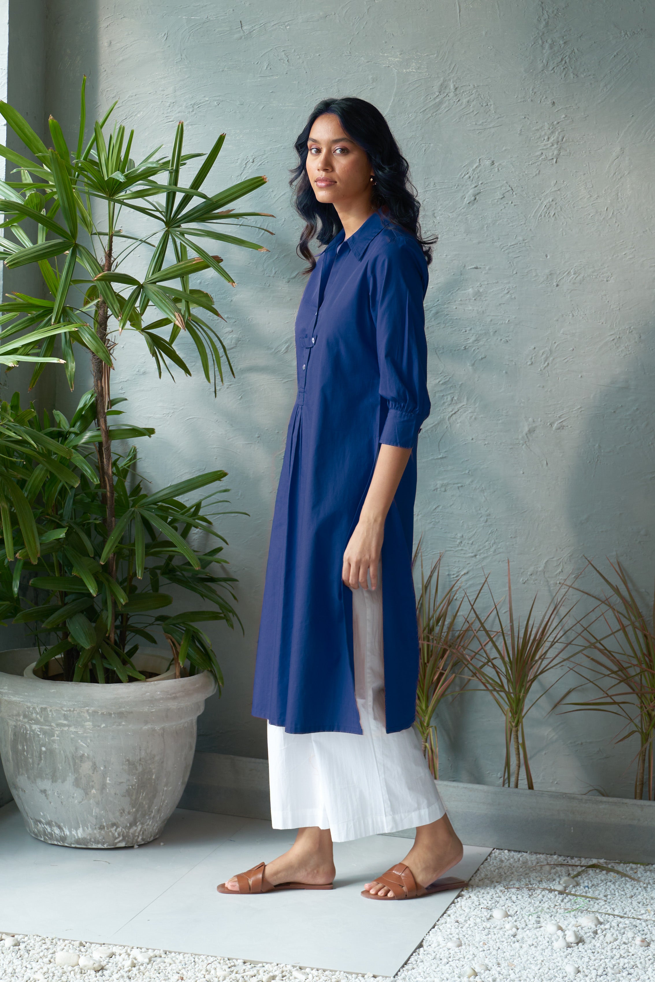 Step into timeless sophistication with this midnight blue Front Buttoned Easy Fit Kurta. Featuring a sleek collar and stylish front button detailing, it combines effortless elegance with a relaxed fit for all-day comfort. The deep, rich hue evokes the calm of moonlit skies, paired beautifully with wide-flared white pants featuring a convenient drawstring for a refined contrast. This versatile set is perfect for both casual outings and special occasions.