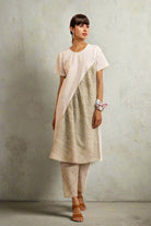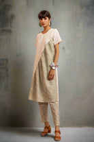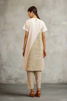 Front & back diagonal paneled tunic in contrasting colours with gathers in the front for an uneven front fall, paired with straight paneled pants which are optional. This tunic set not only adds comfort but brings a contemporary style to the reach Indian fabric!