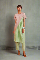 Front & back diagonal paneled tunic in contrasting colours with gathers in the front for an uneven front fall, paired with straight paneled elasticated pants.