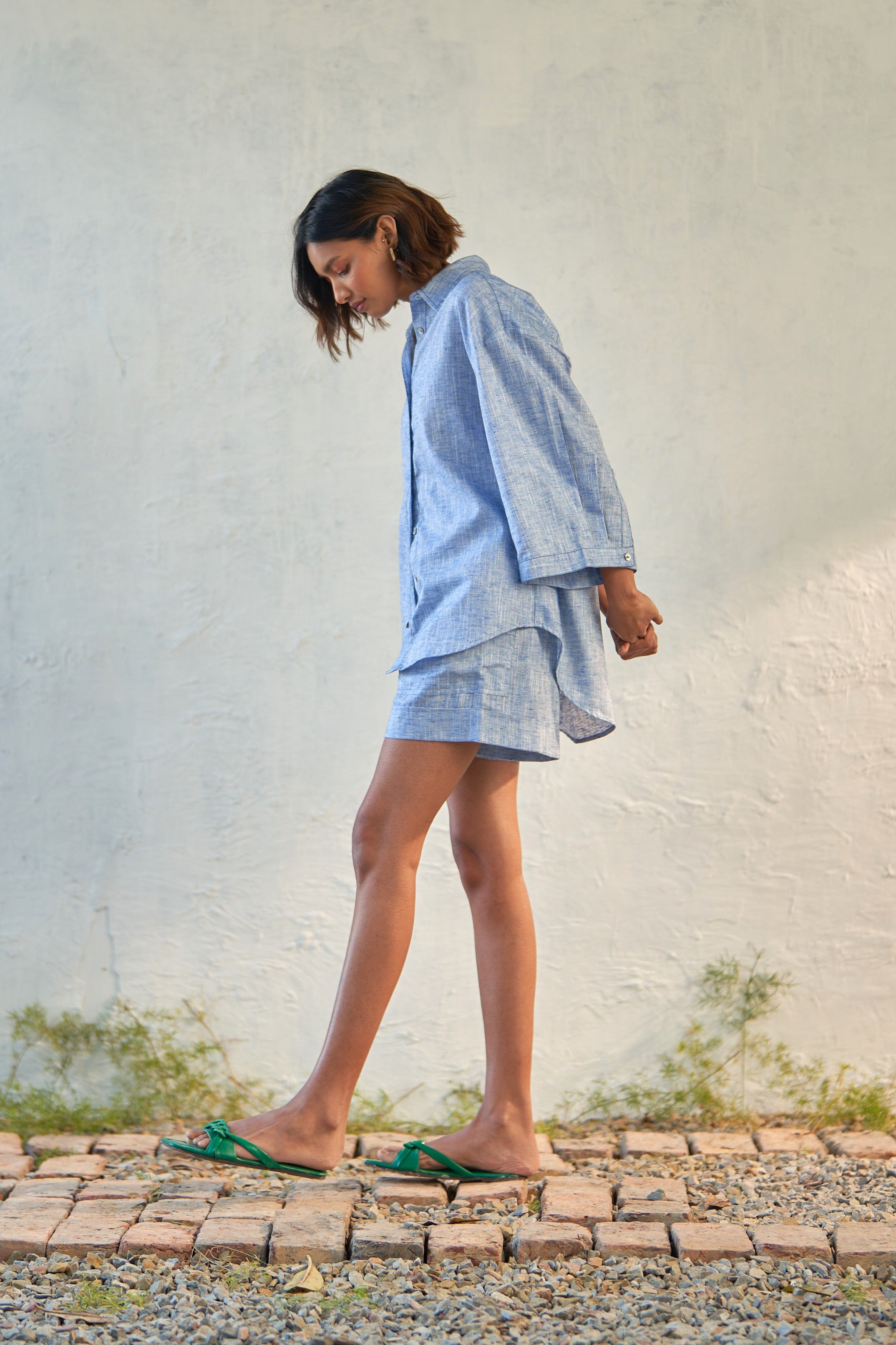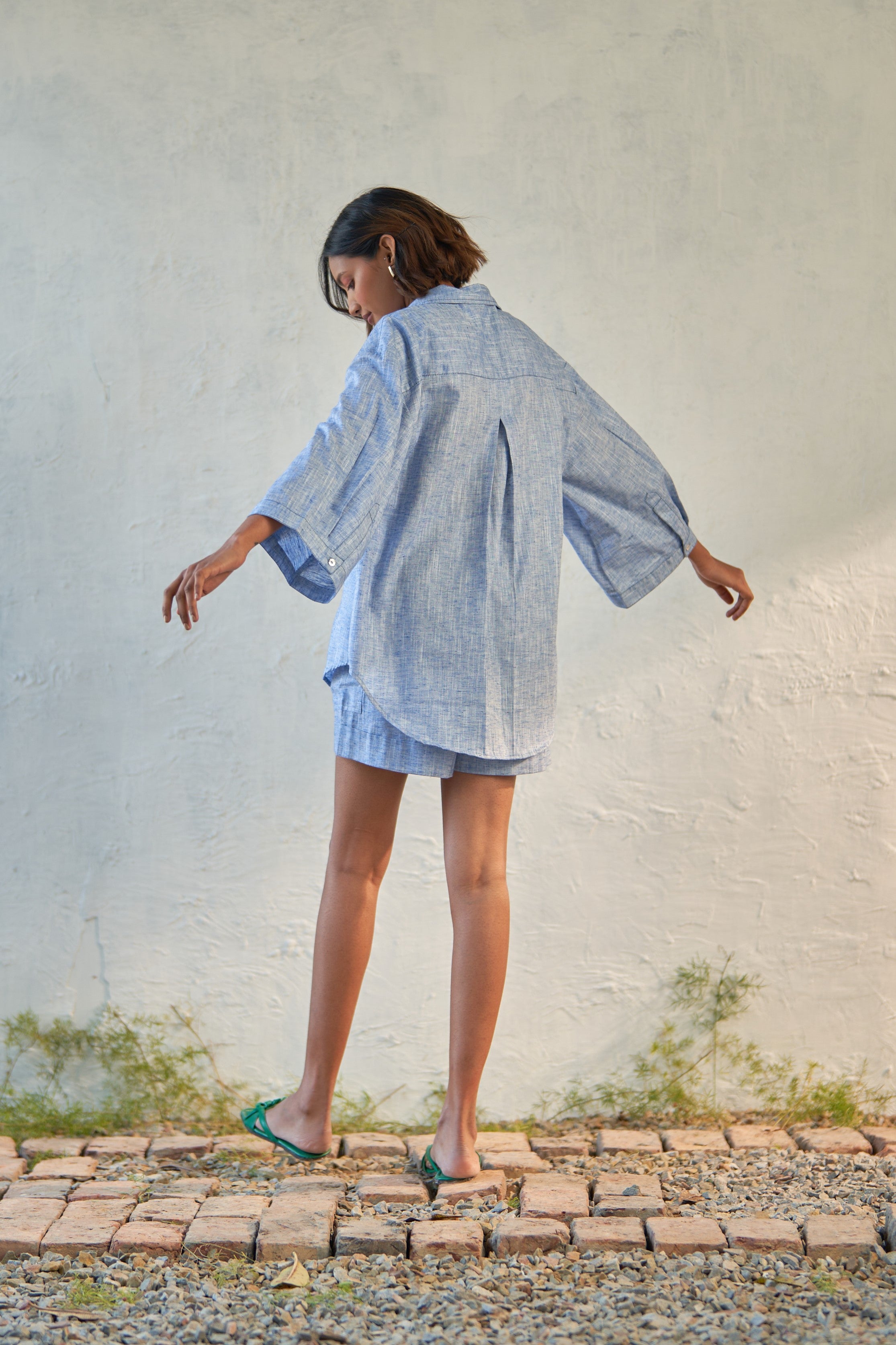 Step into leisurely adventures with this exceptional duo crafted from textured cotton. The shirt boasts a flattering V-neckline, adorned with delicate shell buttons, and features chic pleated 3/4 sleeves that add a touch of sophistication.
