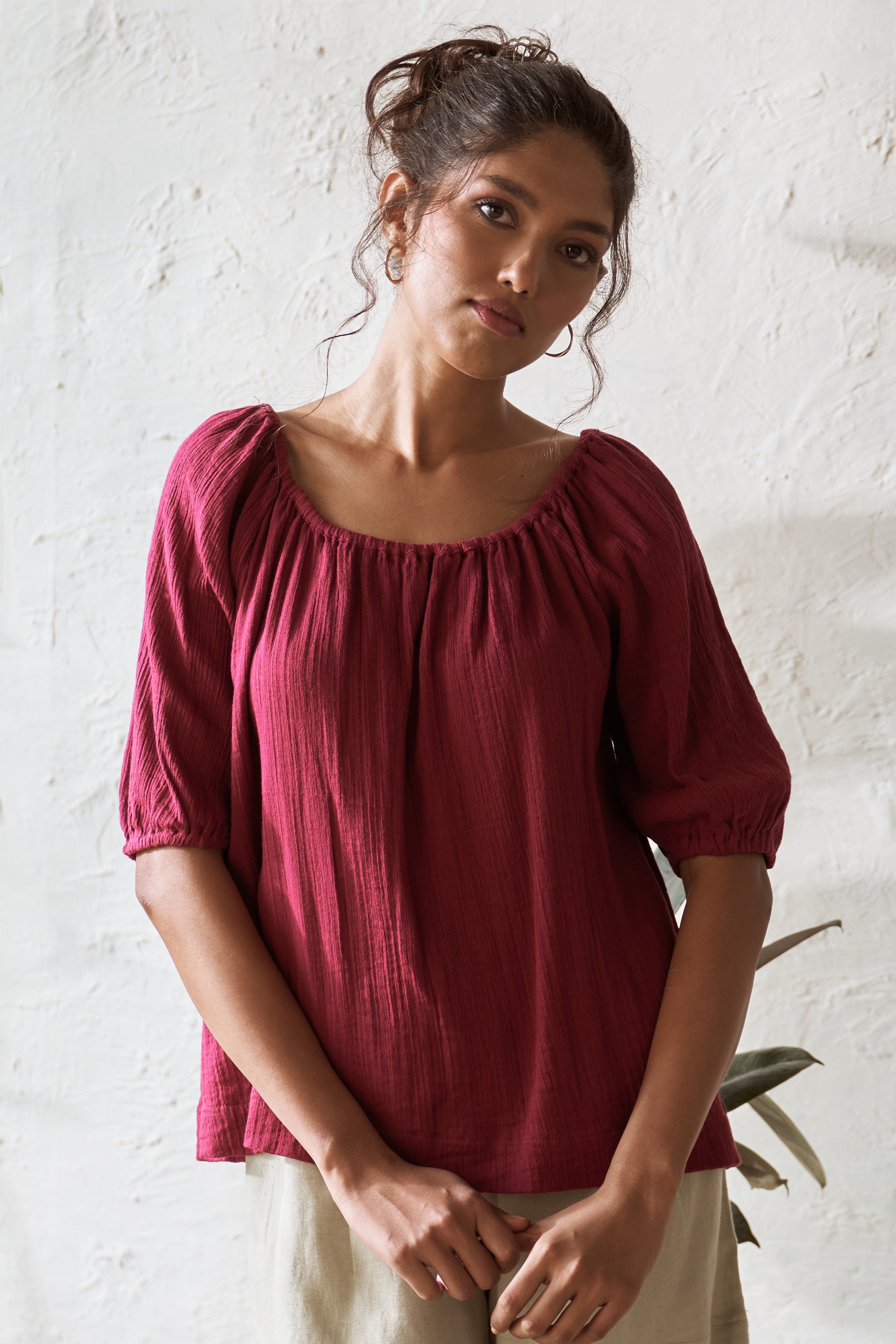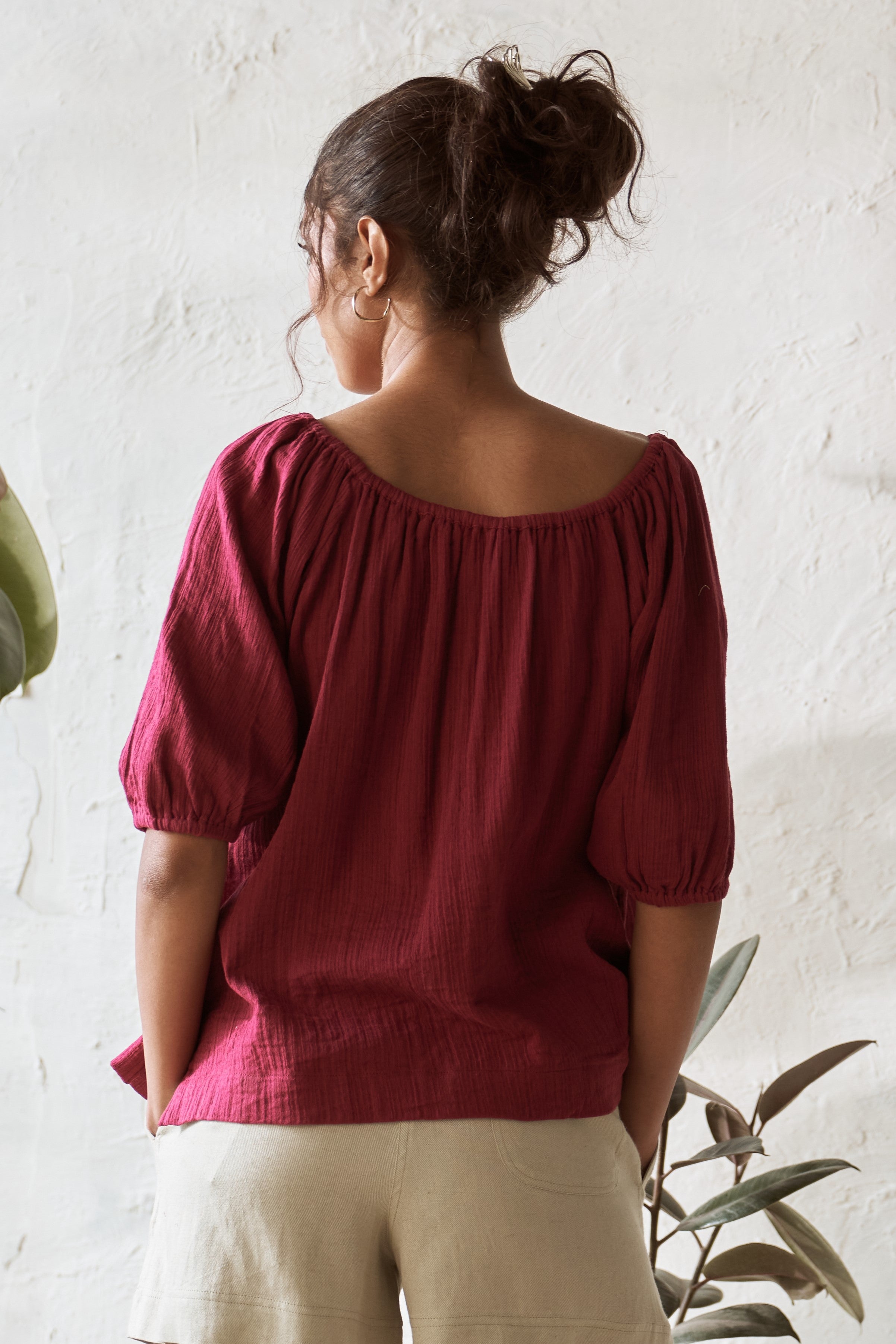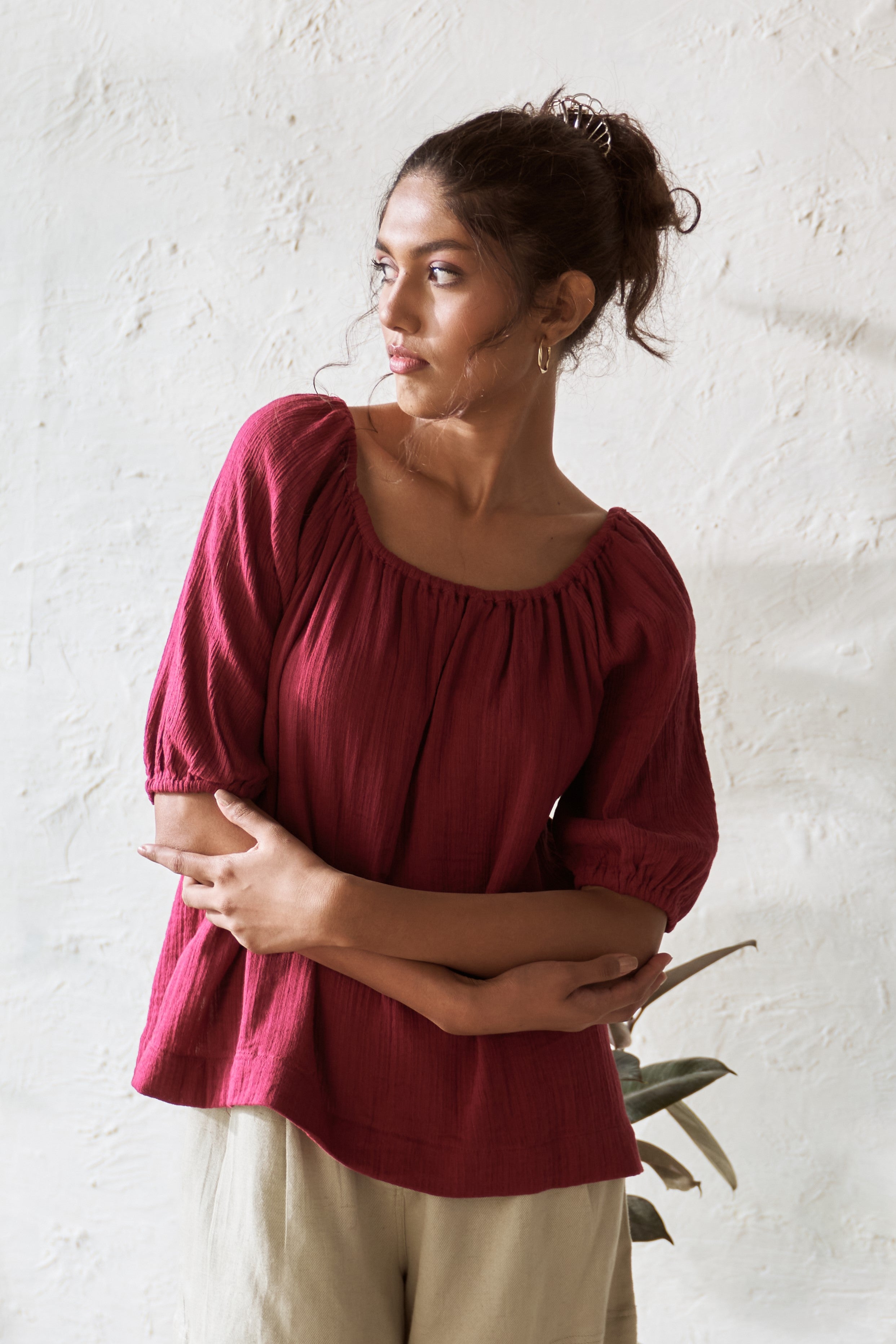 Embrace effortless style with our Crimson Relaxed-Fit Top. Designed with a stretchy neckline for easy dressing, it can be worn as a off-shoulder top too adding an oomph. The relaxed fit offers a laid-back vibe that is perfect for smart casual outings. Pair it with shorts for a casual, breezy look, or dress it up with pants for a more refined and polished outfit. This versatile piece is a must-have for any wardrobe, adding a pop of bold crimson to elevate your everyday style.