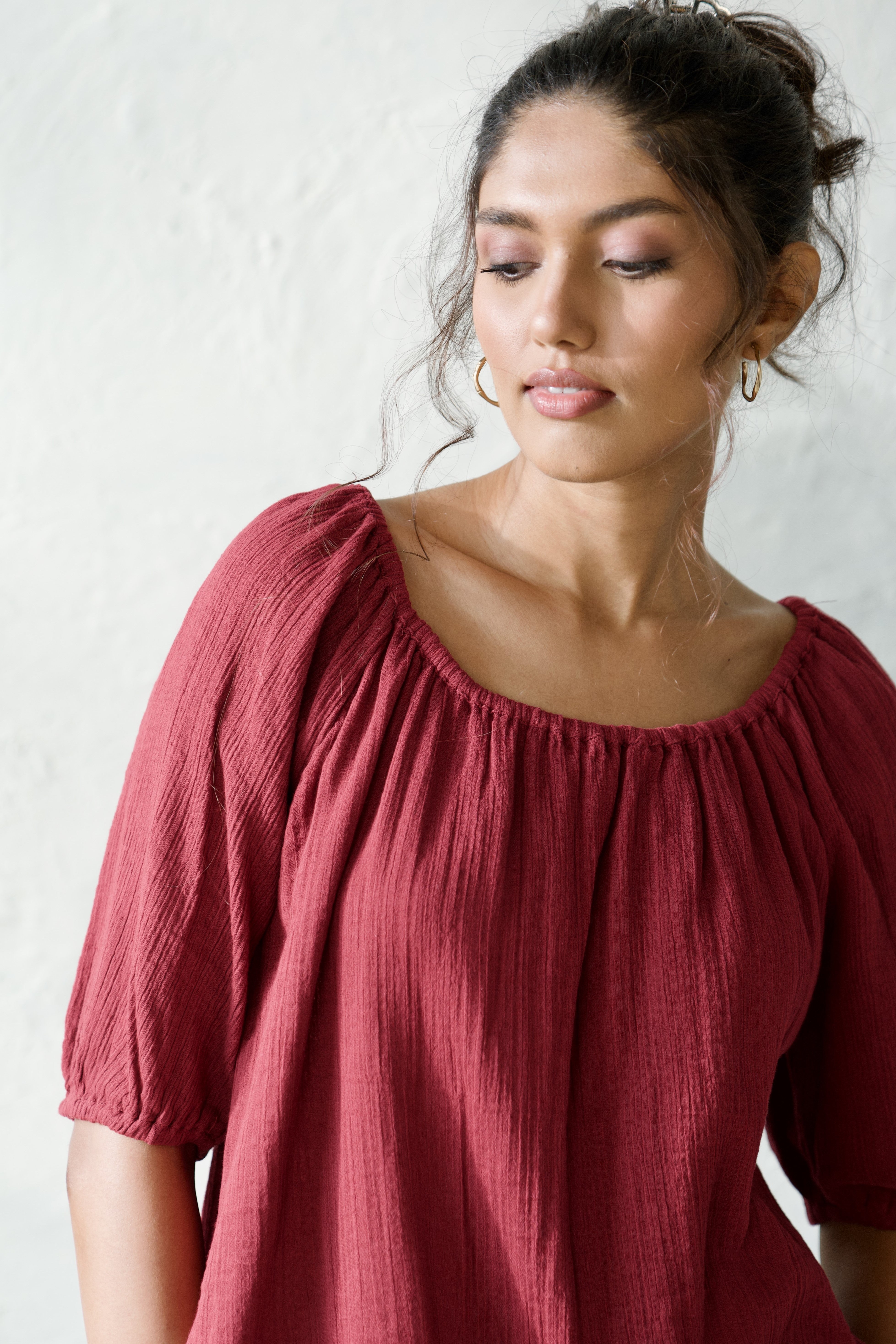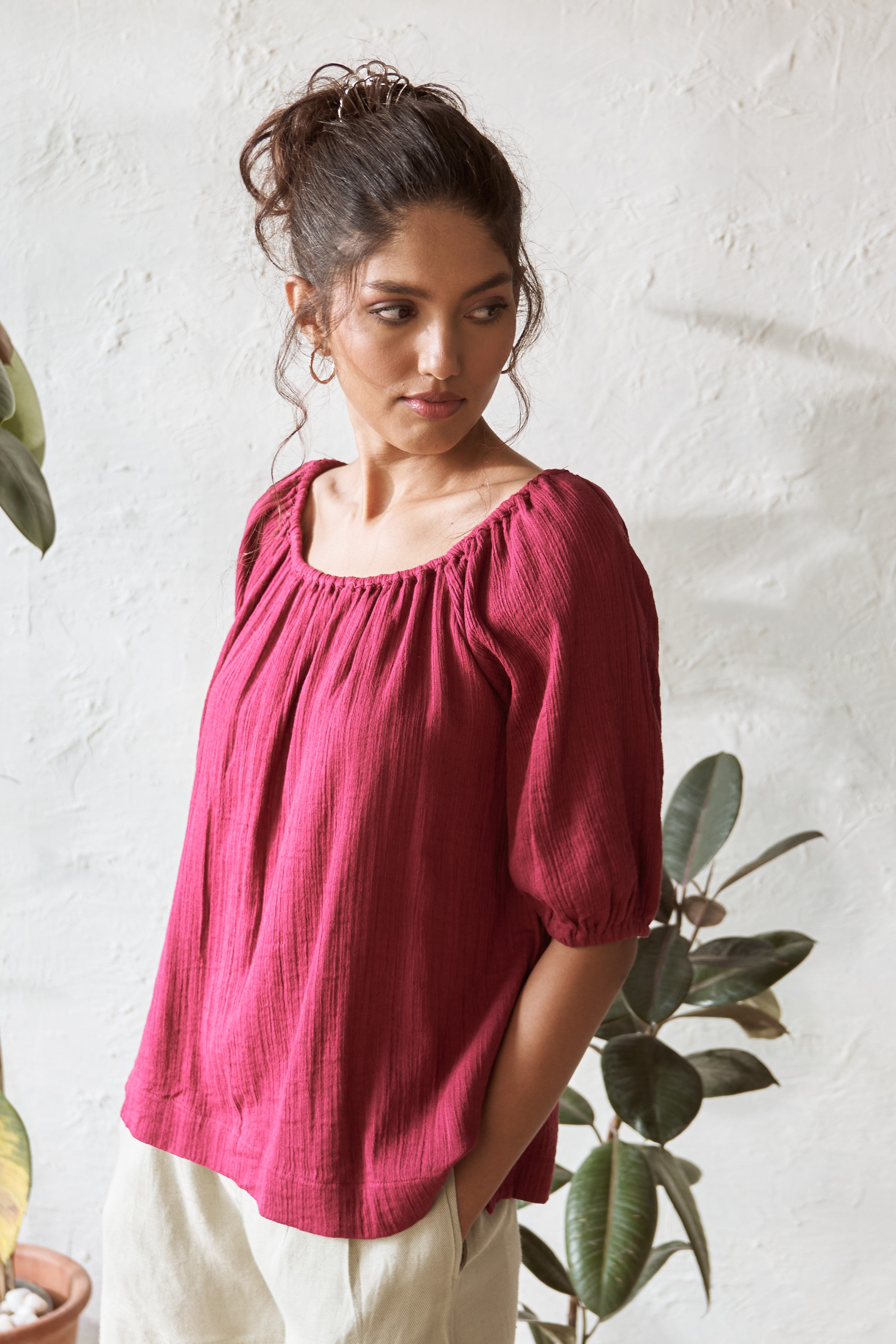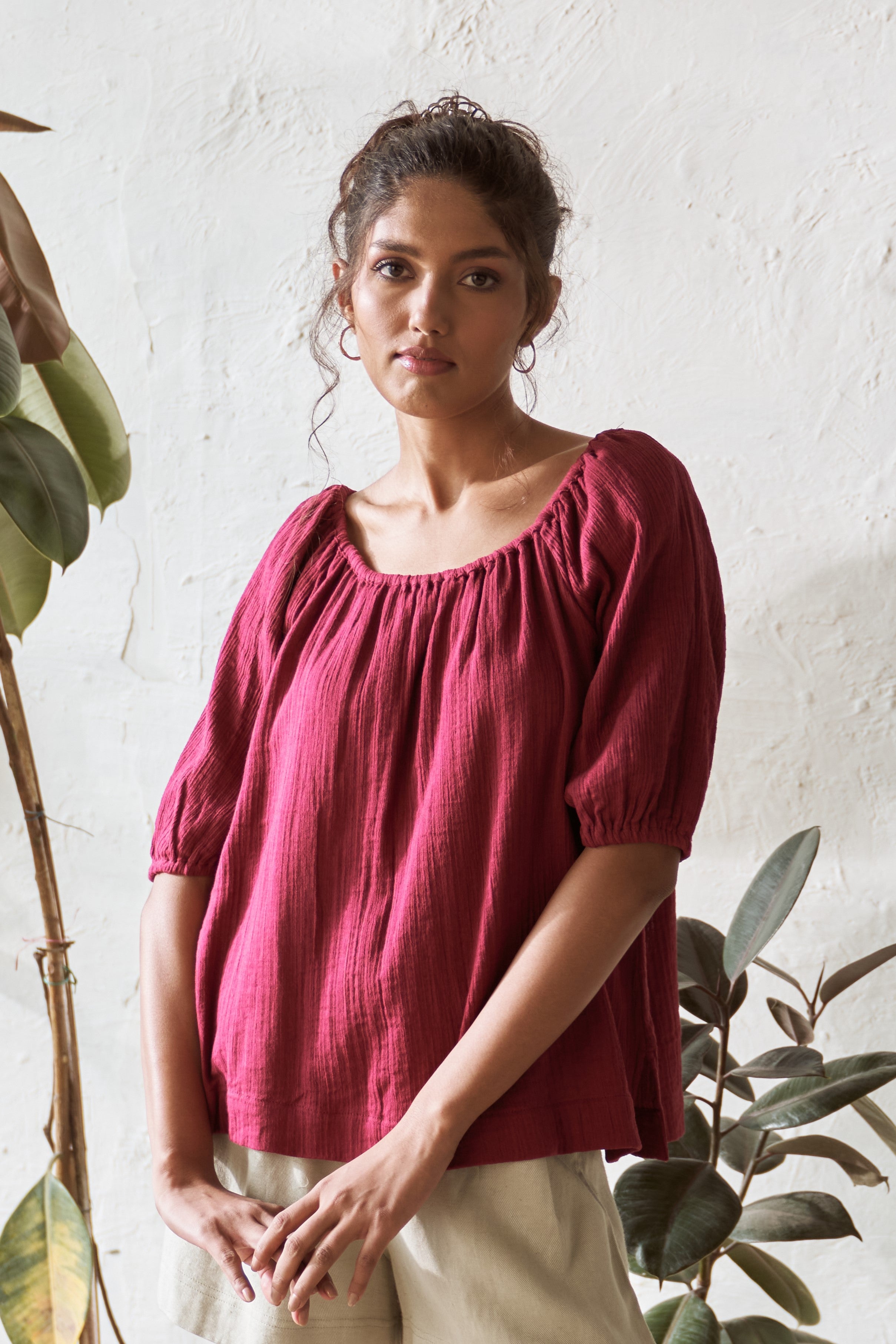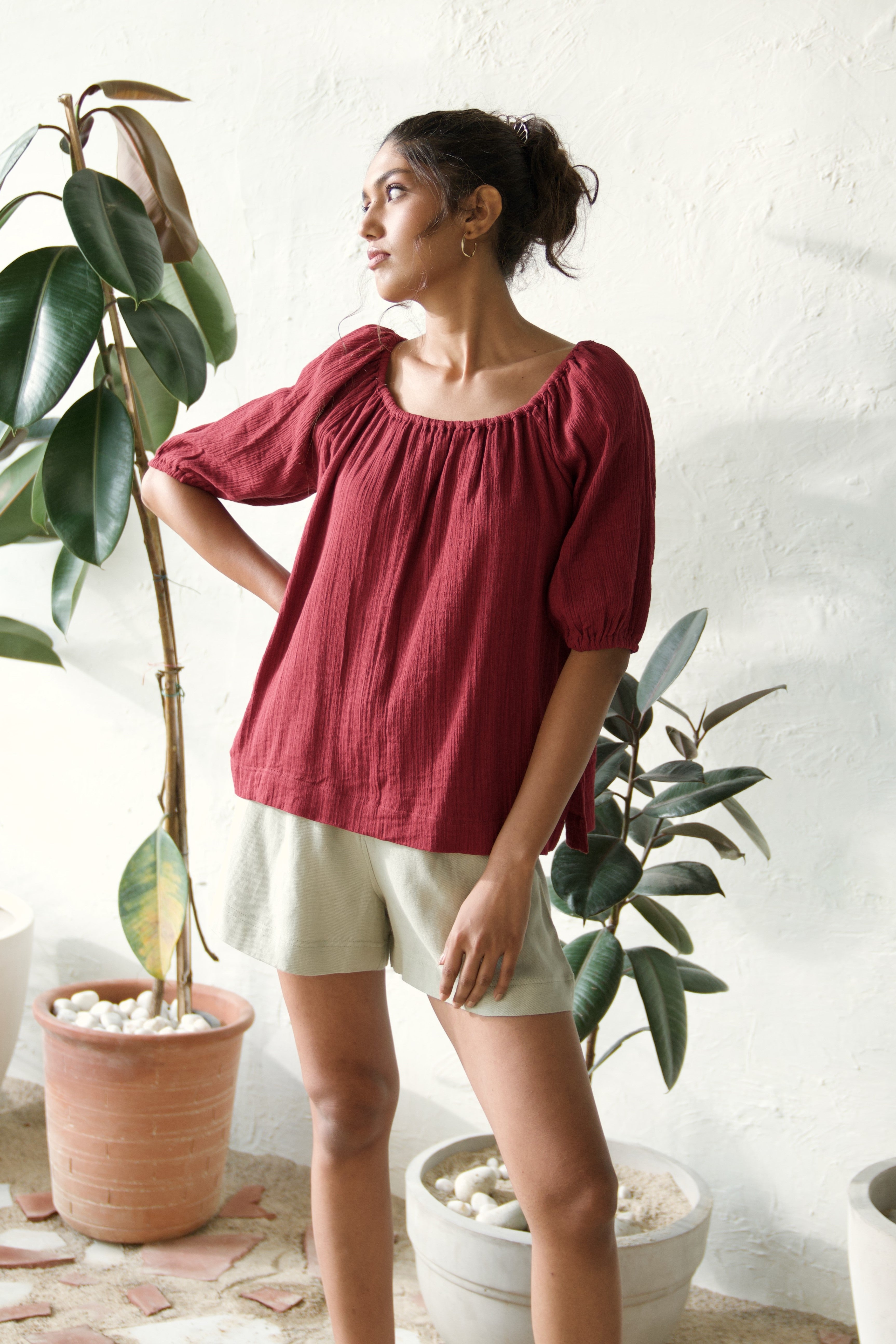 Embrace effortless style with our Crimson Relaxed-Fit Top. Designed with a stretchy neckline for easy dressing, it can be worn as a off-shoulder top too adding an oomph. The relaxed fit offers a laid-back vibe that is perfect for smart casual outings. Pair it with shorts for a casual, breezy look, or dress it up with pants for a more refined and polished outfit. This versatile piece is a must-have for any wardrobe, adding a pop of bold crimson to elevate your everyday style.