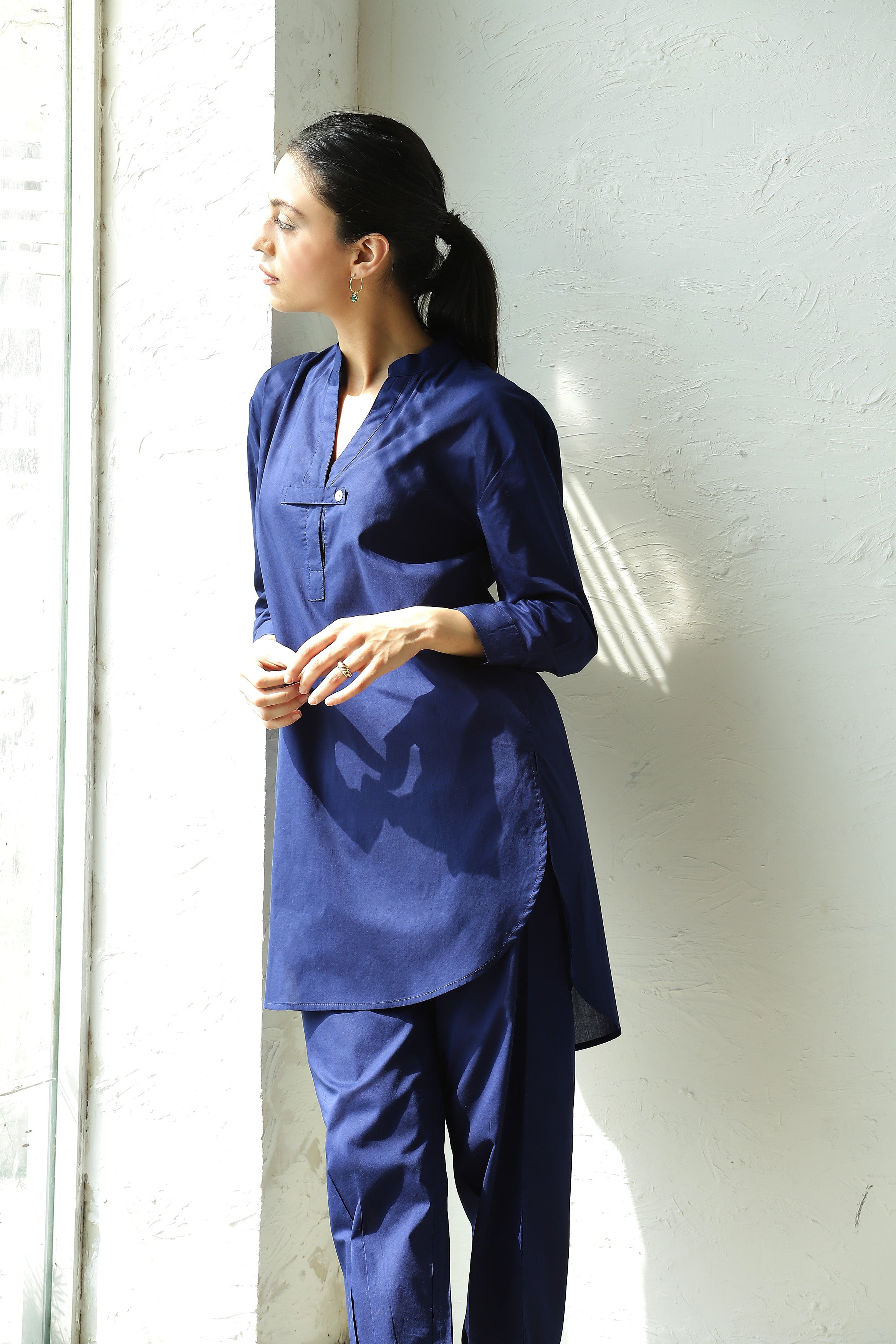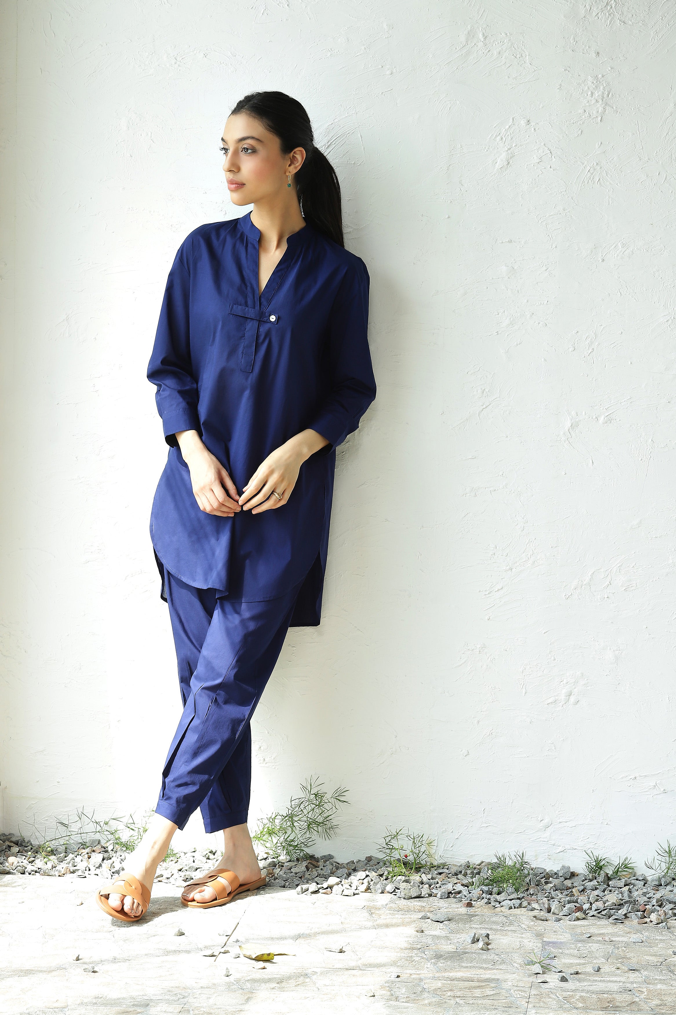 Center of attraction as you walk down the lane. This shining blue co-ord set is a Canoopi favorite. The top showcases a band collar with a v-cut, cross placket lapel, and shell buttons. Paired with pleated elasticated waistband pants. This outfit is perfect for every occasion.