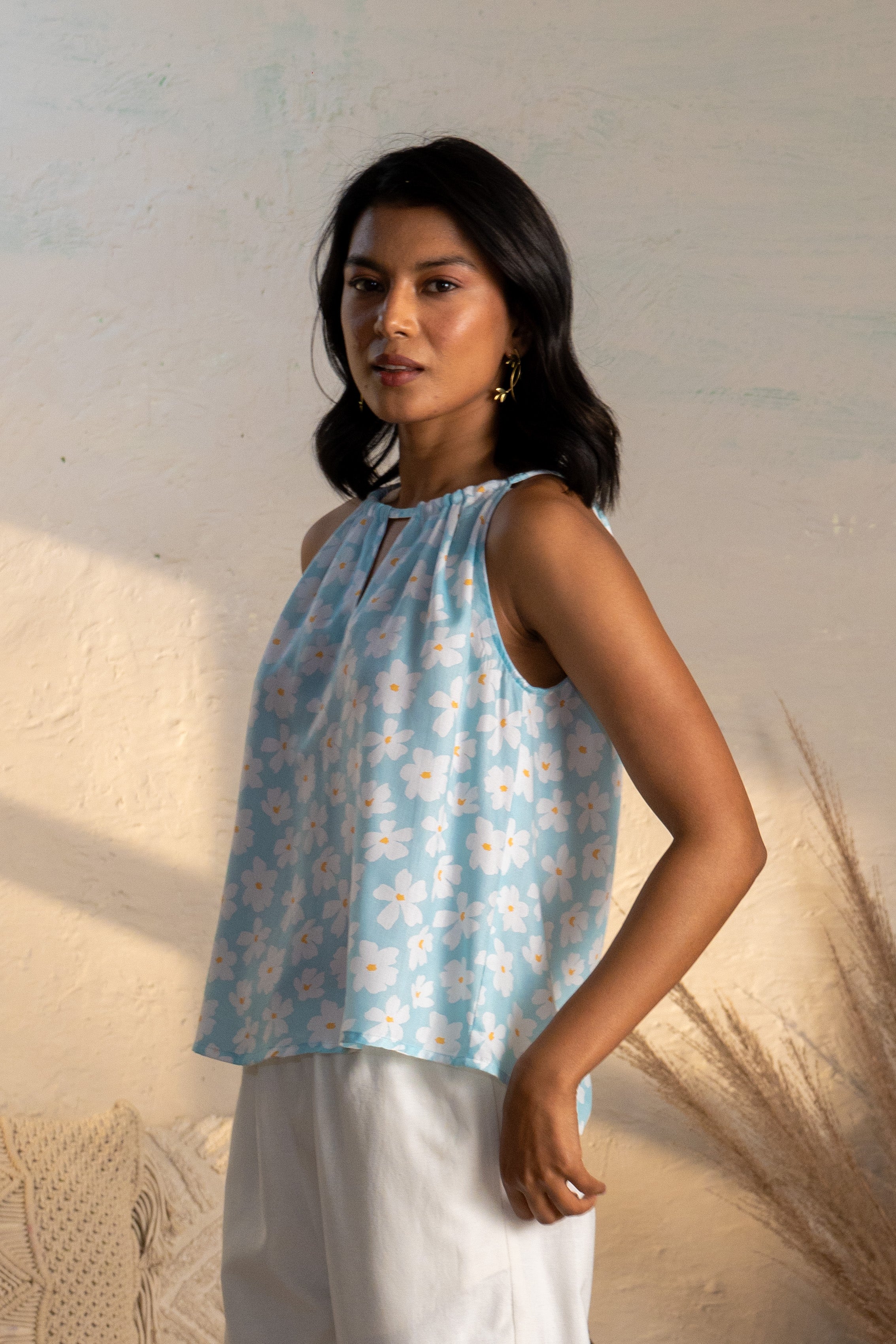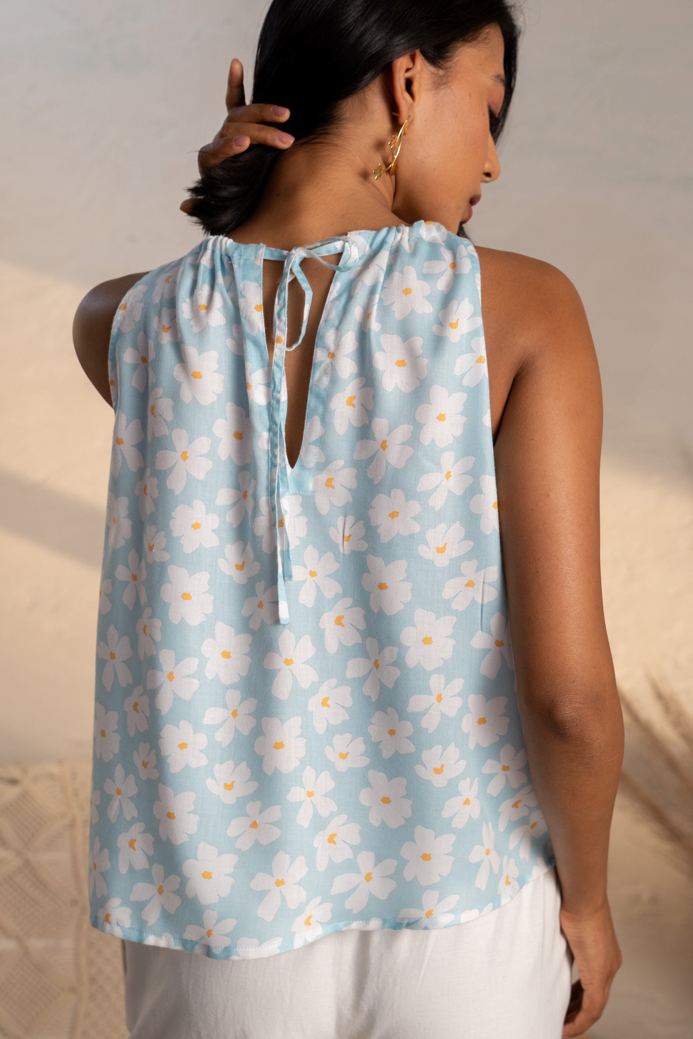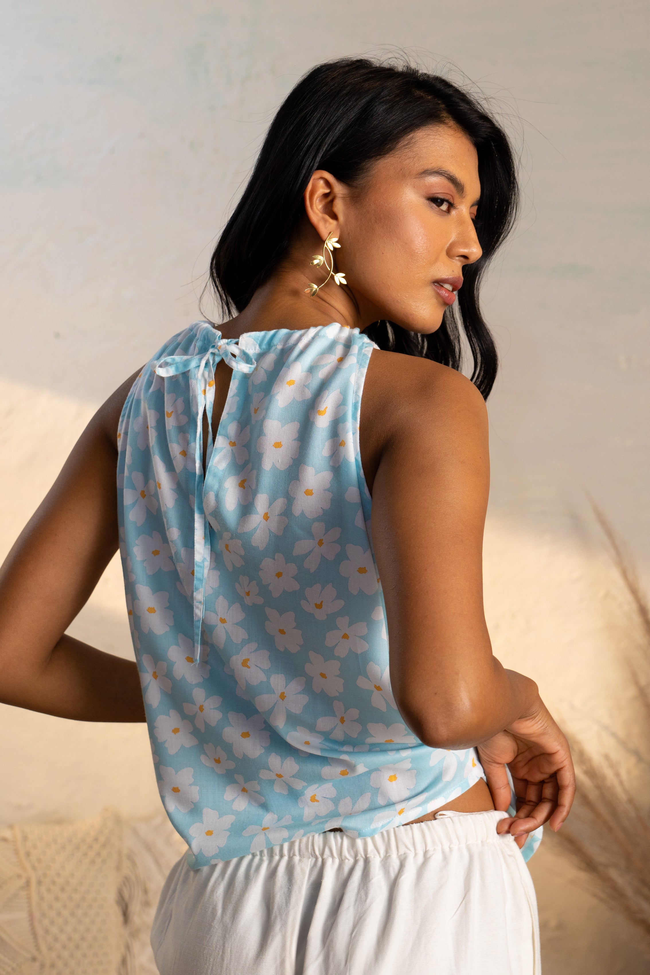 Grace your wardrobe with the Sakura Trail Top, a halter-neck design crafted from soft and crisp cotton satin. This elegant piece features a delicate floral print in a refreshing light blue hue, making it perfect for casual outings and chic summer styling.