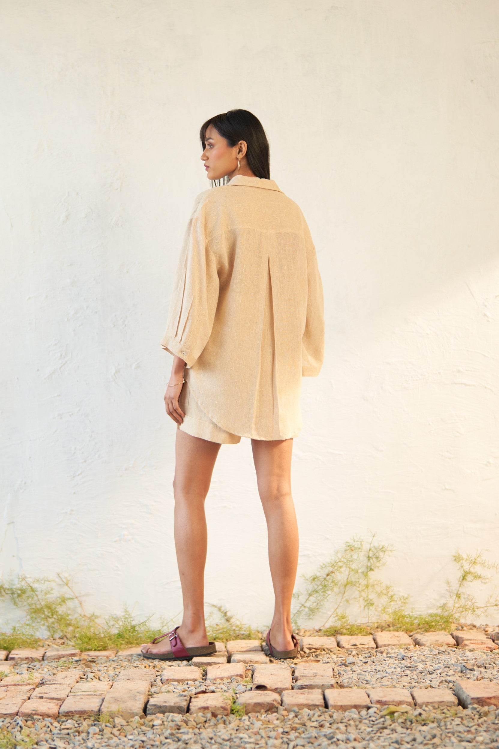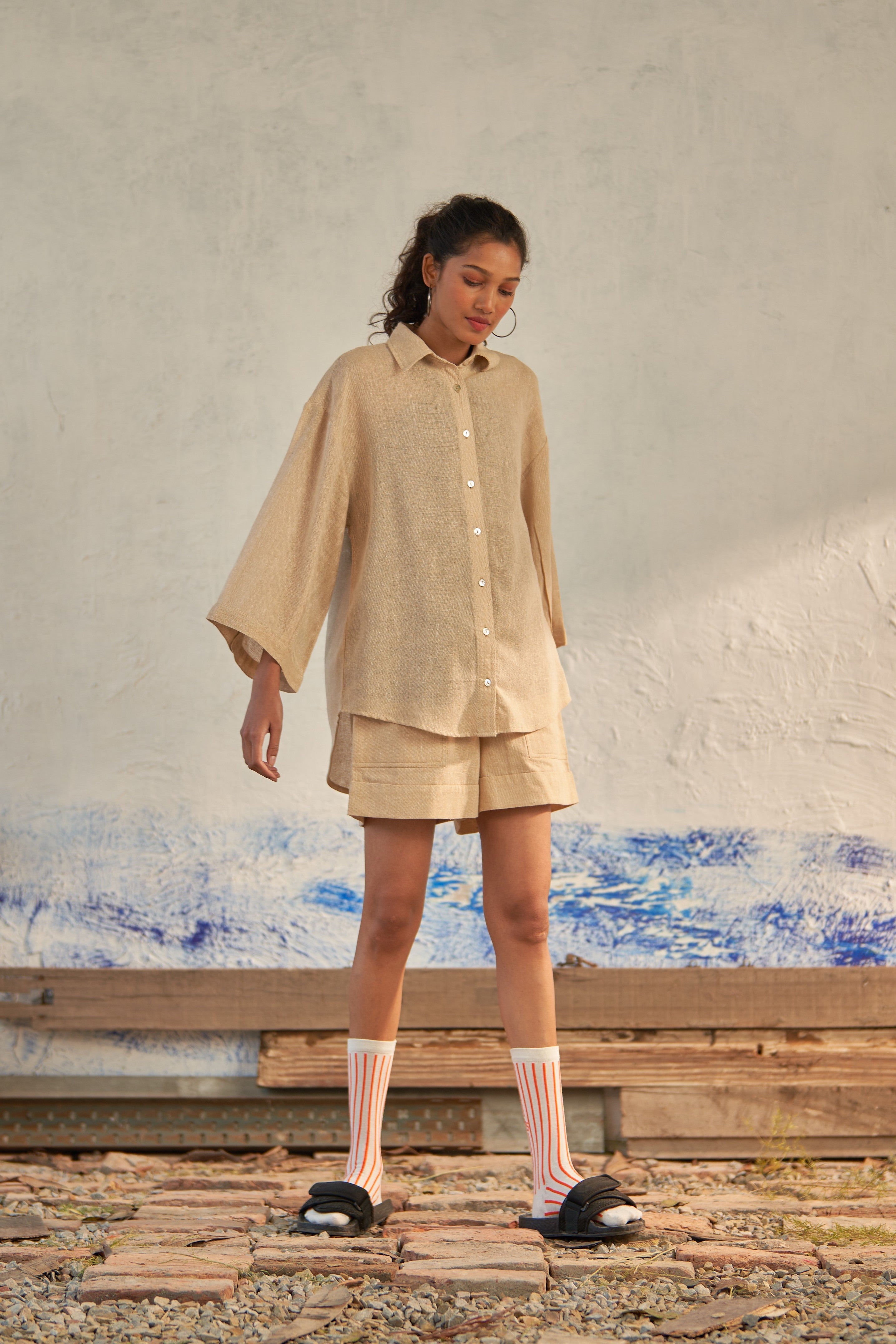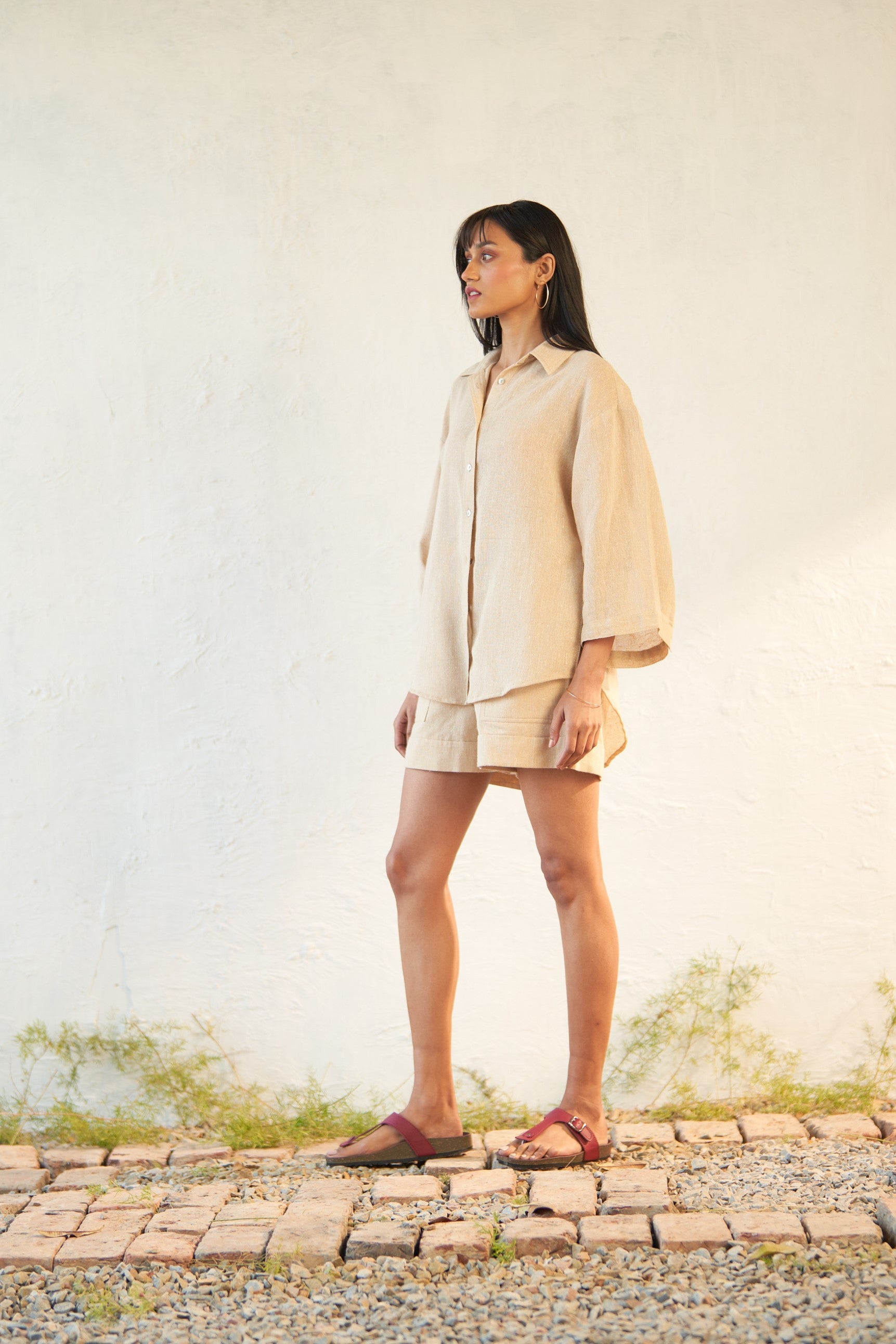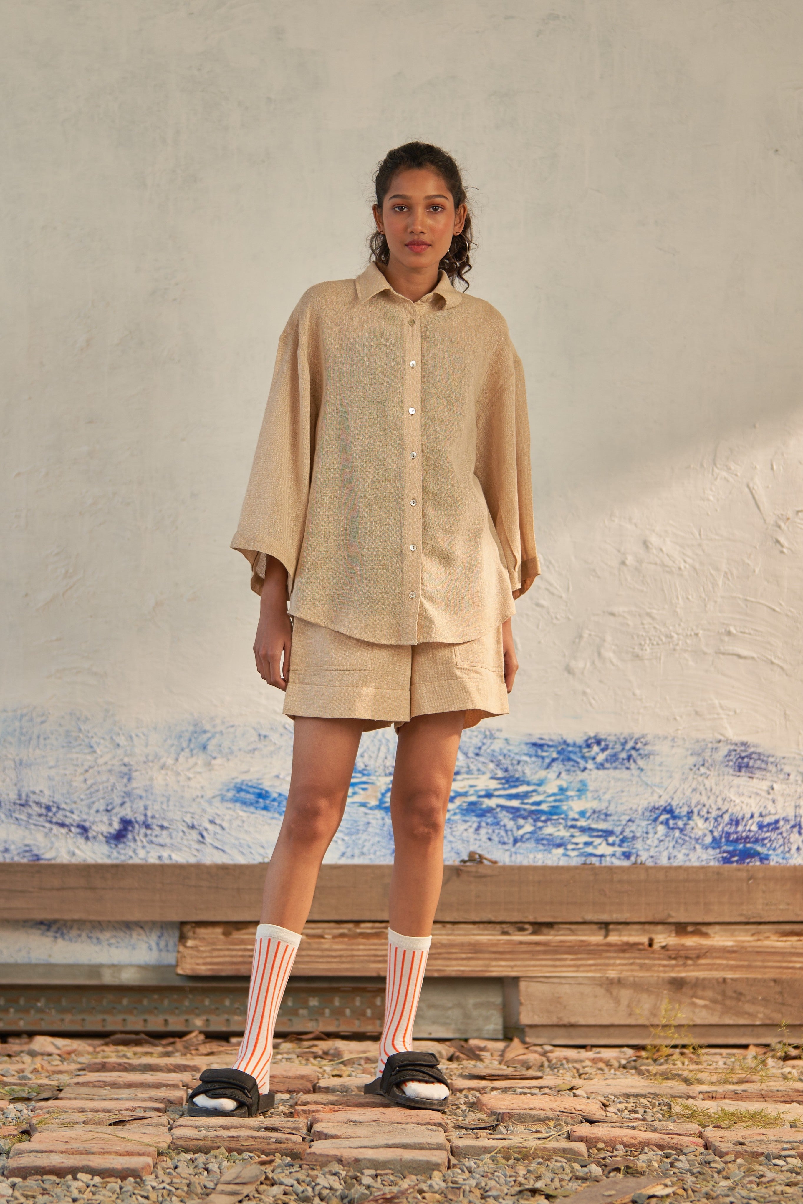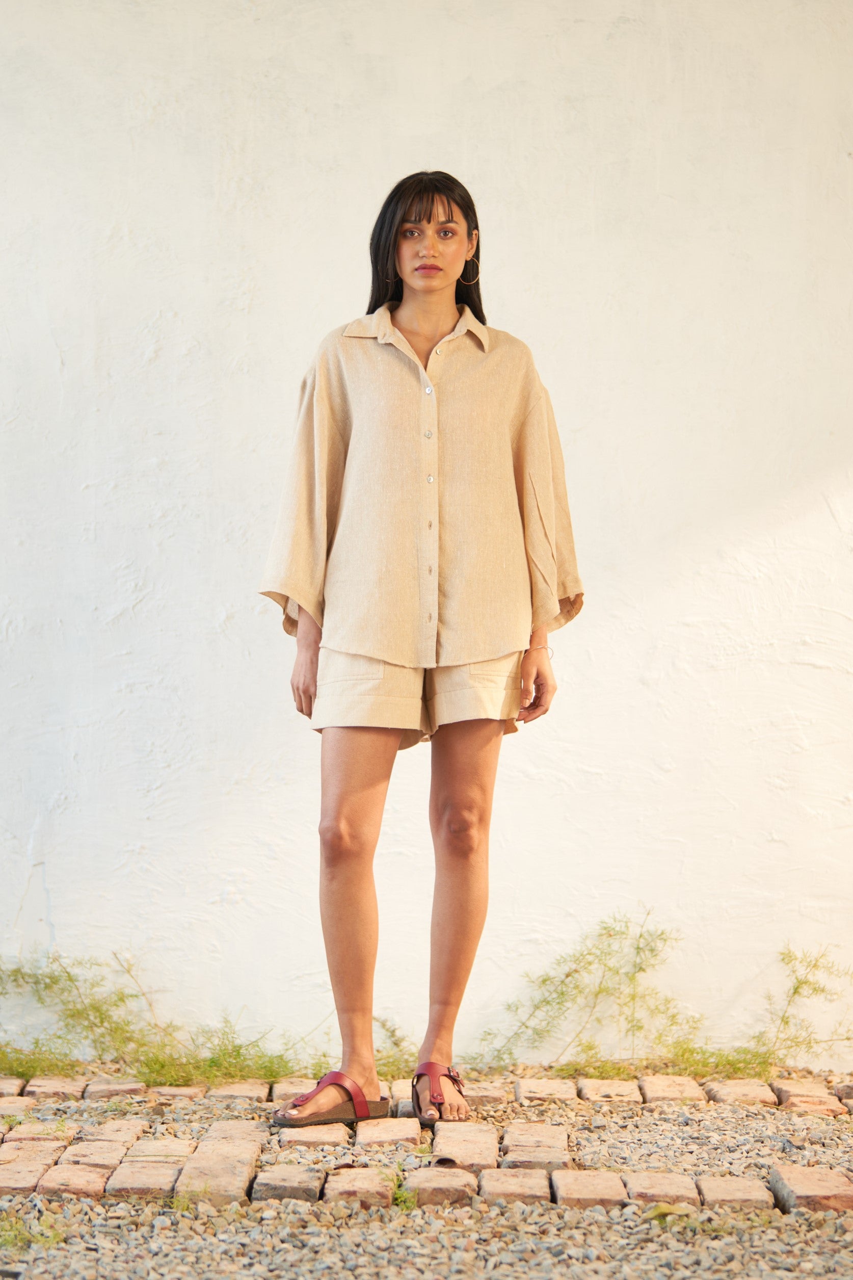 Exuding the epitome of breezy comfort, this ensemble is crafted from natural jute fabric. The flowy, natural-hued shirt boasts an oversized fit, complemented by a V-neck, curved hemline, and elegant shell buttons.