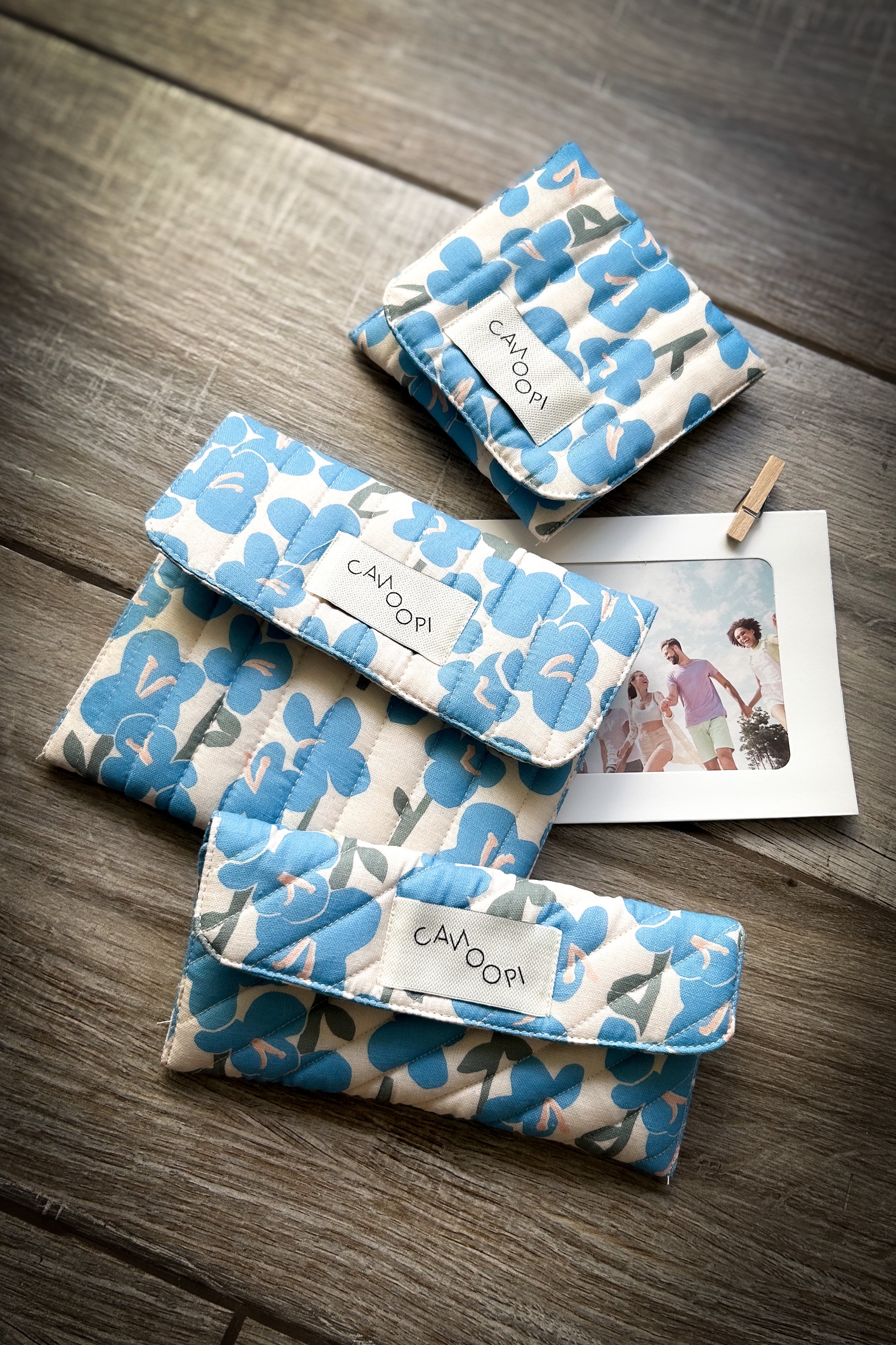 Each piece is handmade with fabric, featuring quilted foam layering for lightweight protection. The sunglass cover is perfect for everyday use, replacing bulky hard cases, while the pouches offer versatile utility for your larger essentials and smaller knick-knacks. The foldable covers are secured with velcro fastening ensures easy access to your belongings, adding convenience to your day.