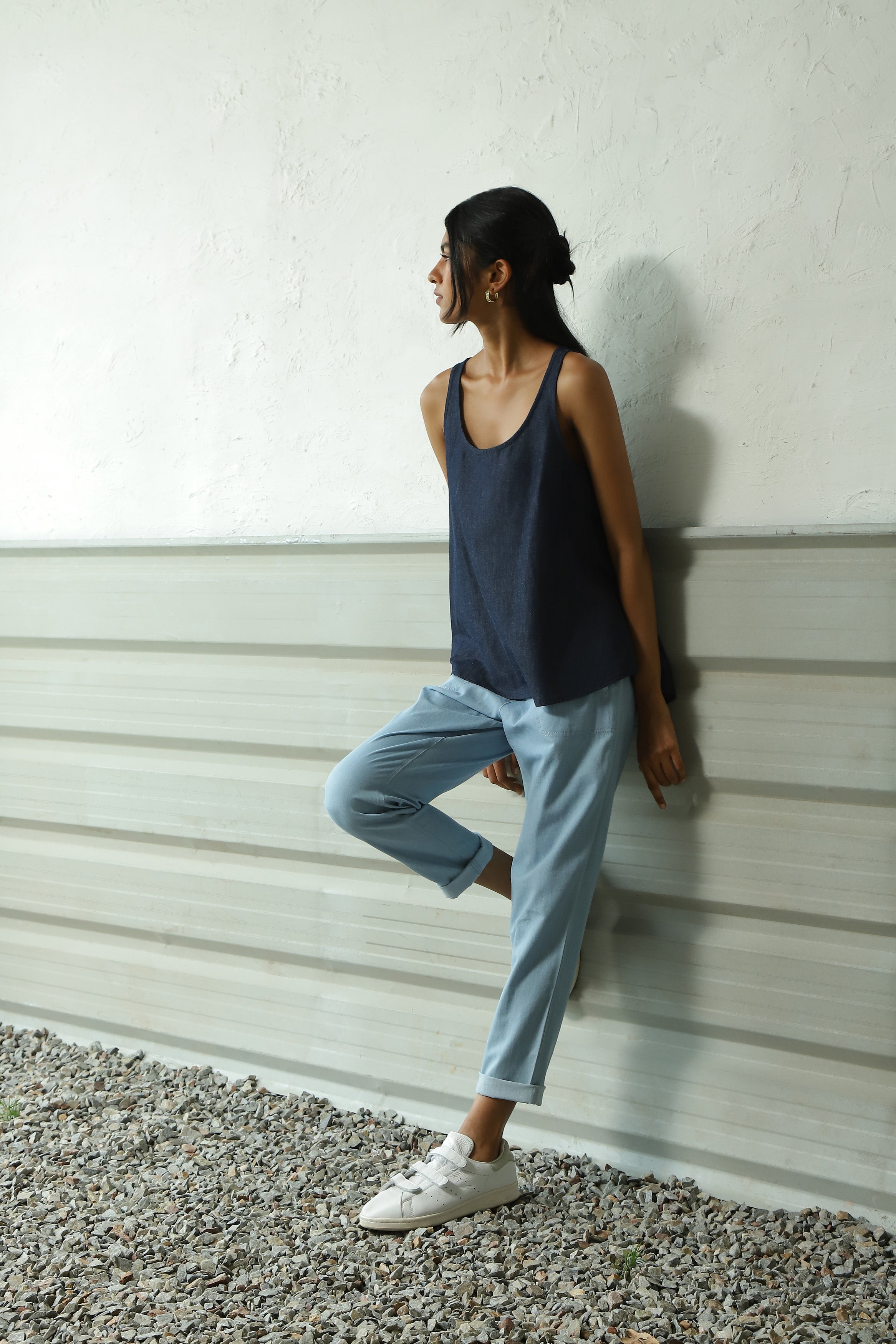 An ideal choice for the Avid Explorer: Dark Denim Tank Top & Light Denim Narrow Pants. It features a captivating pairing of a dark denim tank top with narrow light denim pants. The sleeveless tank is meticulously crafted for a breezy A-line silhouette, highlighted by its scoop neckline. Complementing the tank is our narrow light denim pants, thoughtfully designed with a gently gathered elasticated waist, stylish patch pockets, and intricate double-stitch detailing that elevates the overall look.