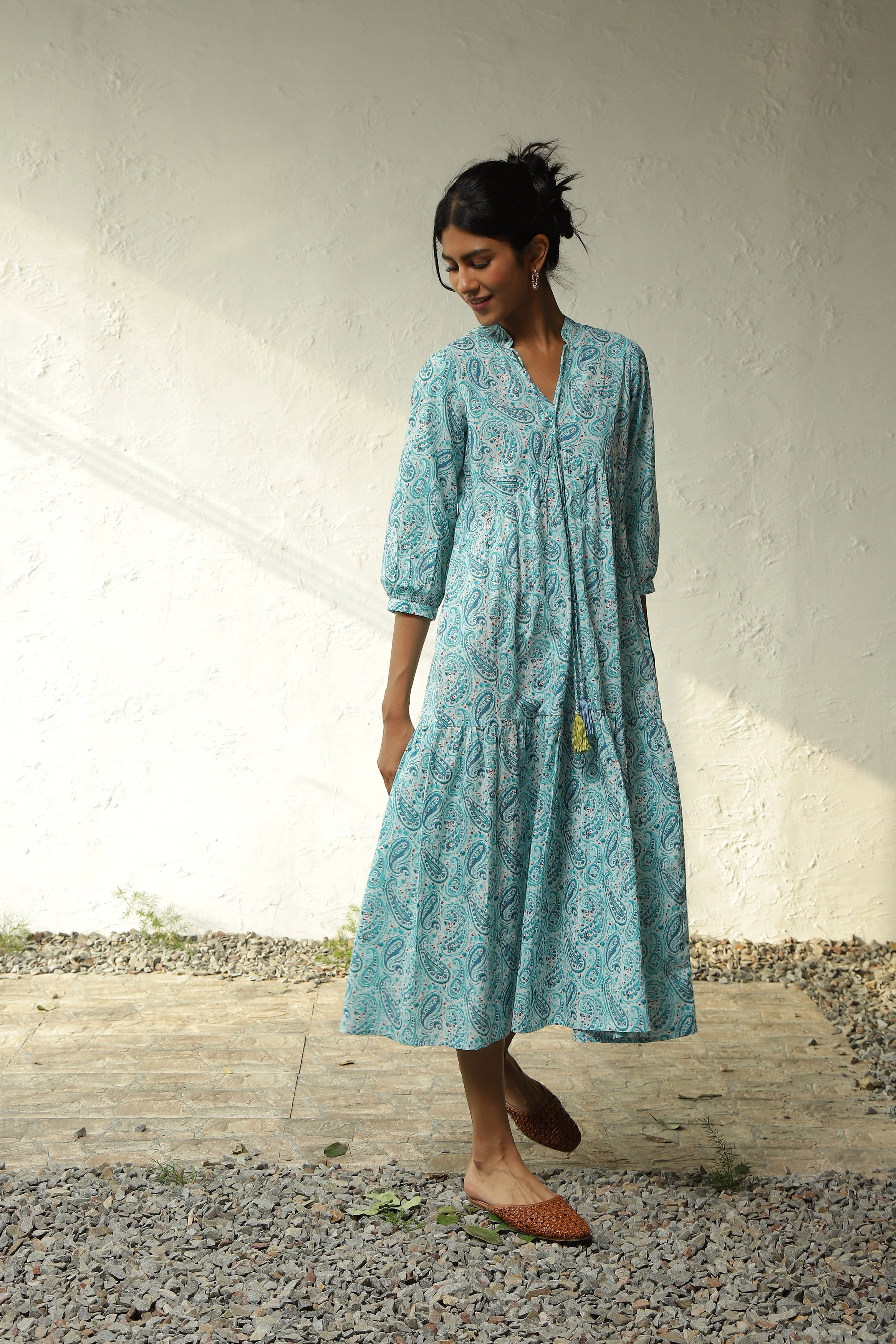 This whimsical tier midi dress exudes elegance and femininity. Perfect for both travel adventures and outings, the dress is designed to gently drape over the body, emphasizing the waist and enhancing the wearer's silhouette. The paisley print and funky tassels add a touch of excitement to your journey.